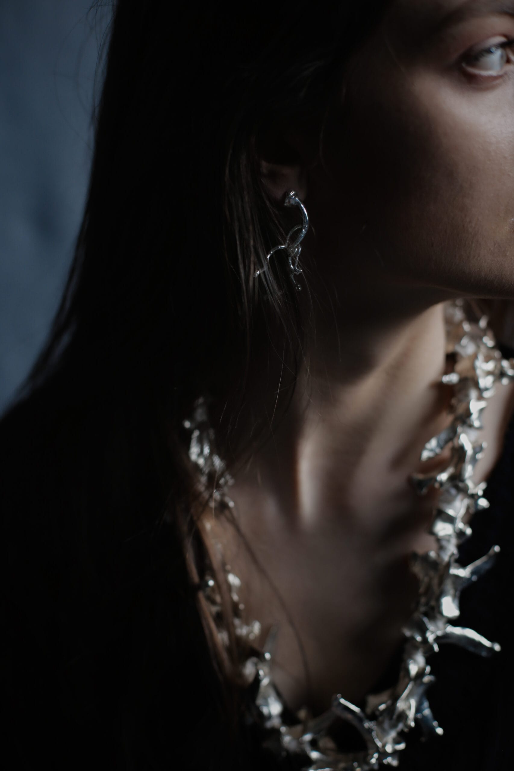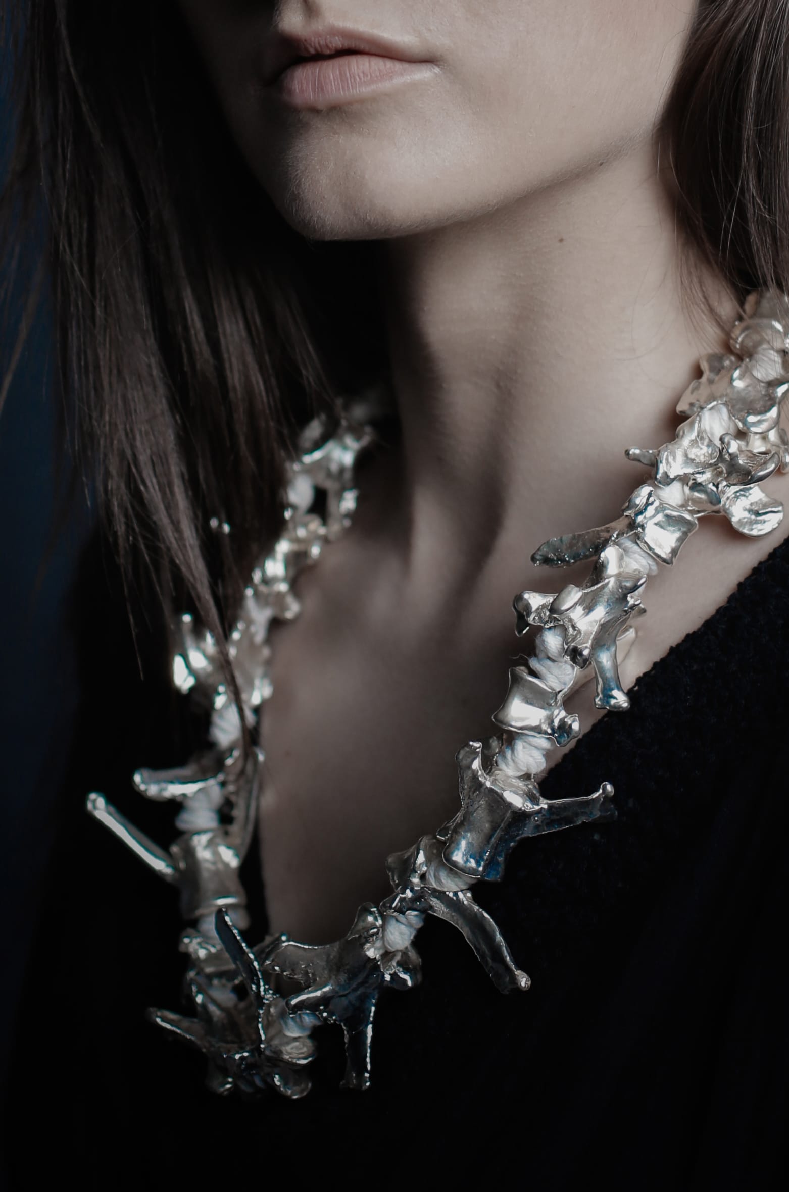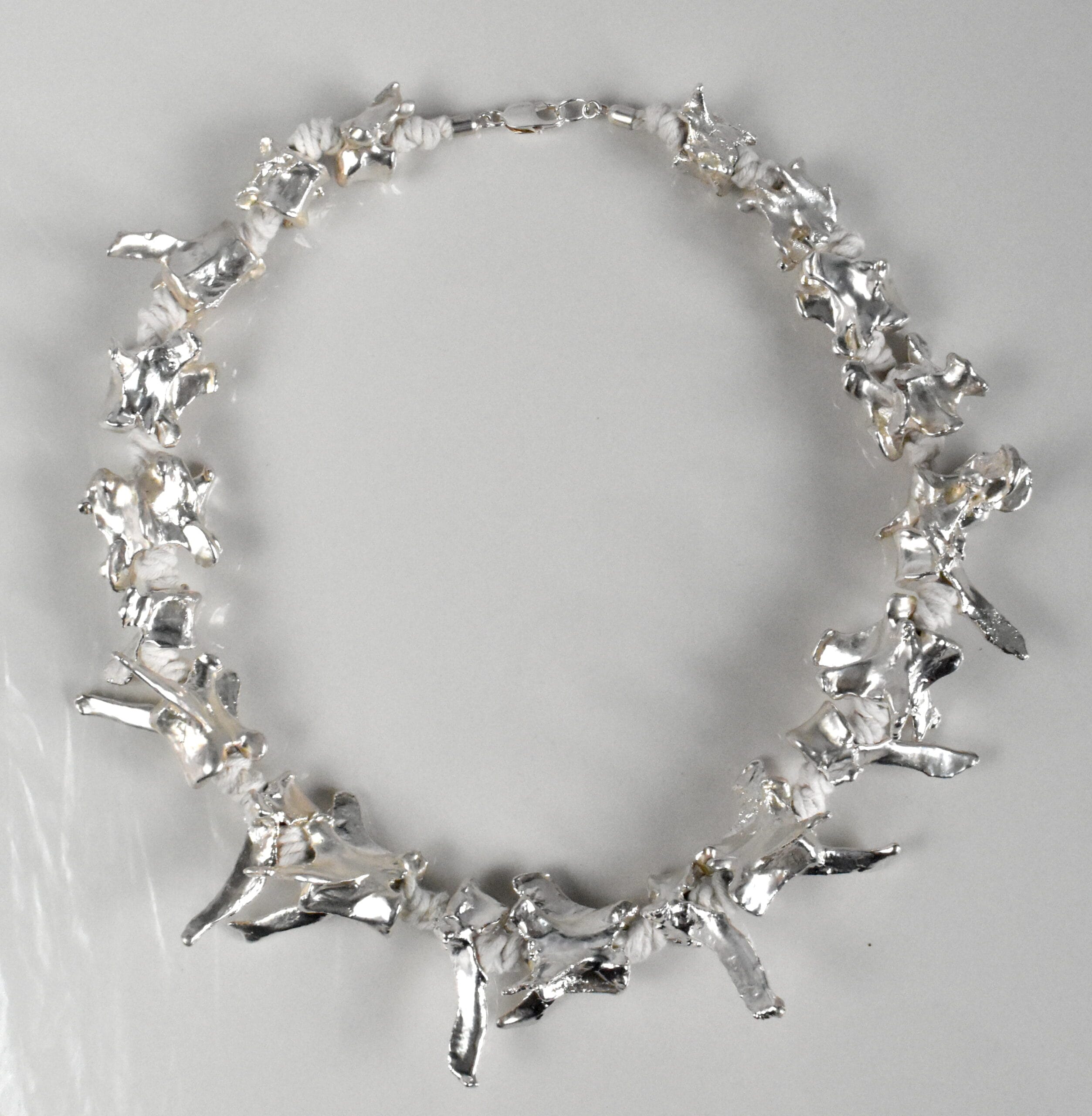 Masyvūs karoliai sukurti iš kaulų. Dengti variu, tada sidabru. Detalės iš medvilninės virvės, užsegimas iš sidabro. Karolių svoris 160 g, bendras ilgis 66 cm.