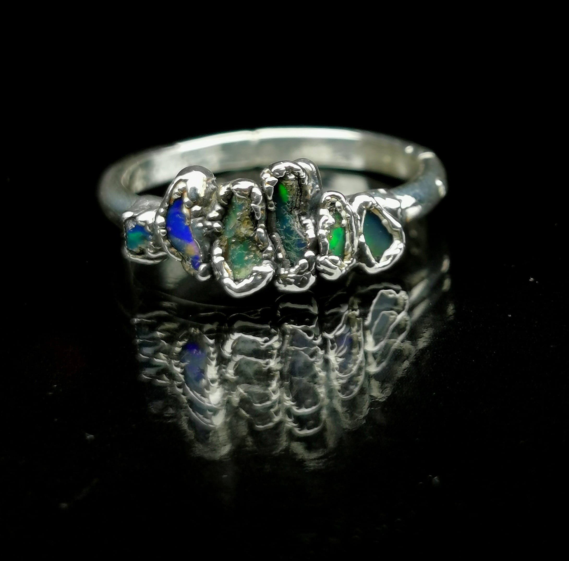⚜︎ Vienetinis sidabro žiedas su natūraliais Etiopijos opalų akmenimis.⚜︎ Sukurta iš 925 ir 999 prabos sidabro, žiedo svoris 2,2 g.⚜︎ Žiedo dydis 16,5.⚜︎ Prabuota Lietuvos prabavimo rūmuose.⚜ Papuošalas parduodamas supakuotas medinėje rankų darbo dovanų dėžutėje.