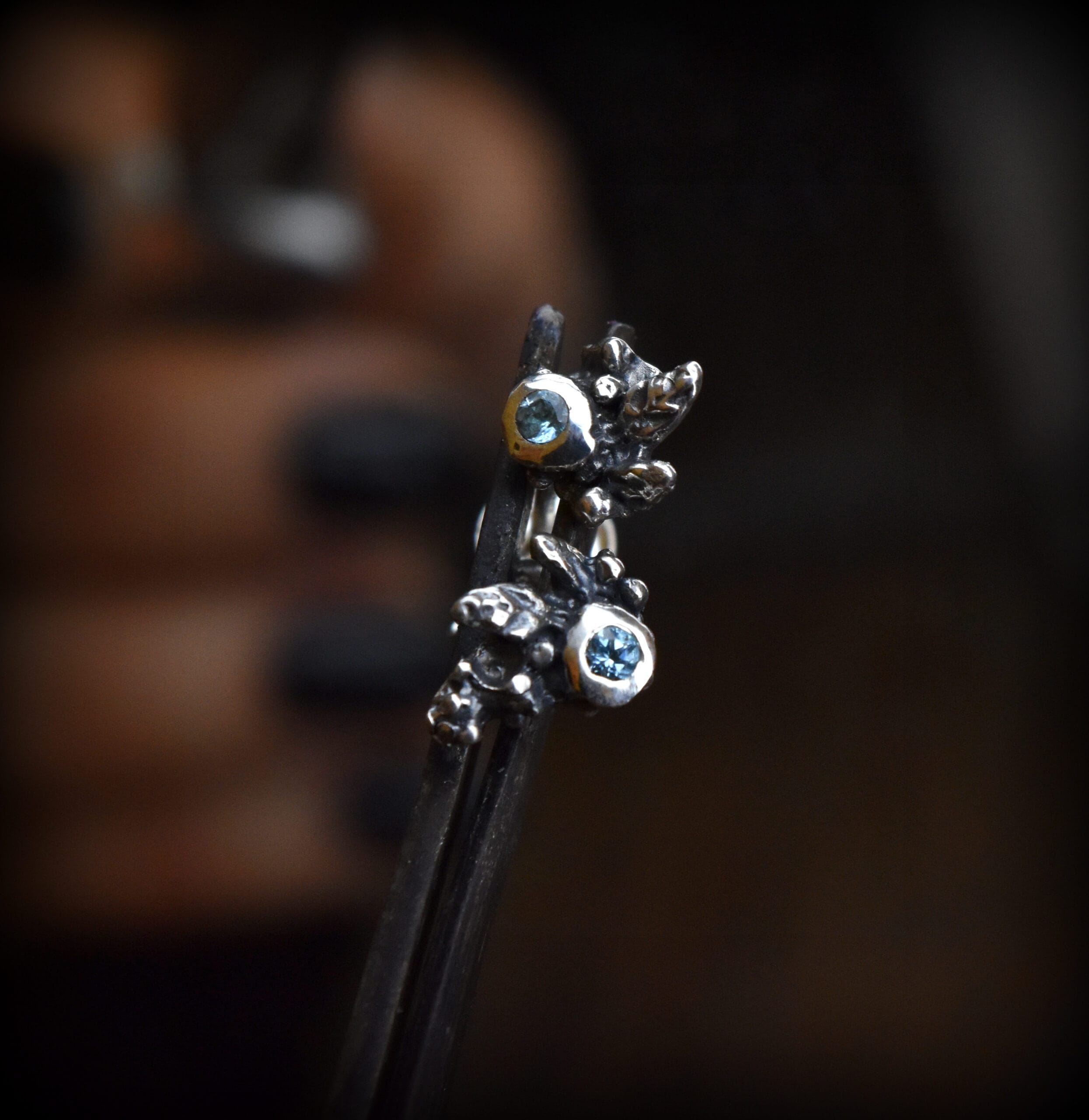 ⚜︎ Auskarai inkrustuoti topazo akmenimis.⚜︎ Tinkami nešioti kasdien, nedideli.⚜︎ Sidabras specialiai paveiktas, taip išgaunant tamsesnius sidabro atspalvius.⚜︎ Auskarai bei jų užsegimai sukurti iš 925 prabos sidabro, sveria 1,31 g.⚜ Prabuota Lietuvos prabavimo rūmuose.⚜ Papuošalas supakuotas dovanų maišelyje.