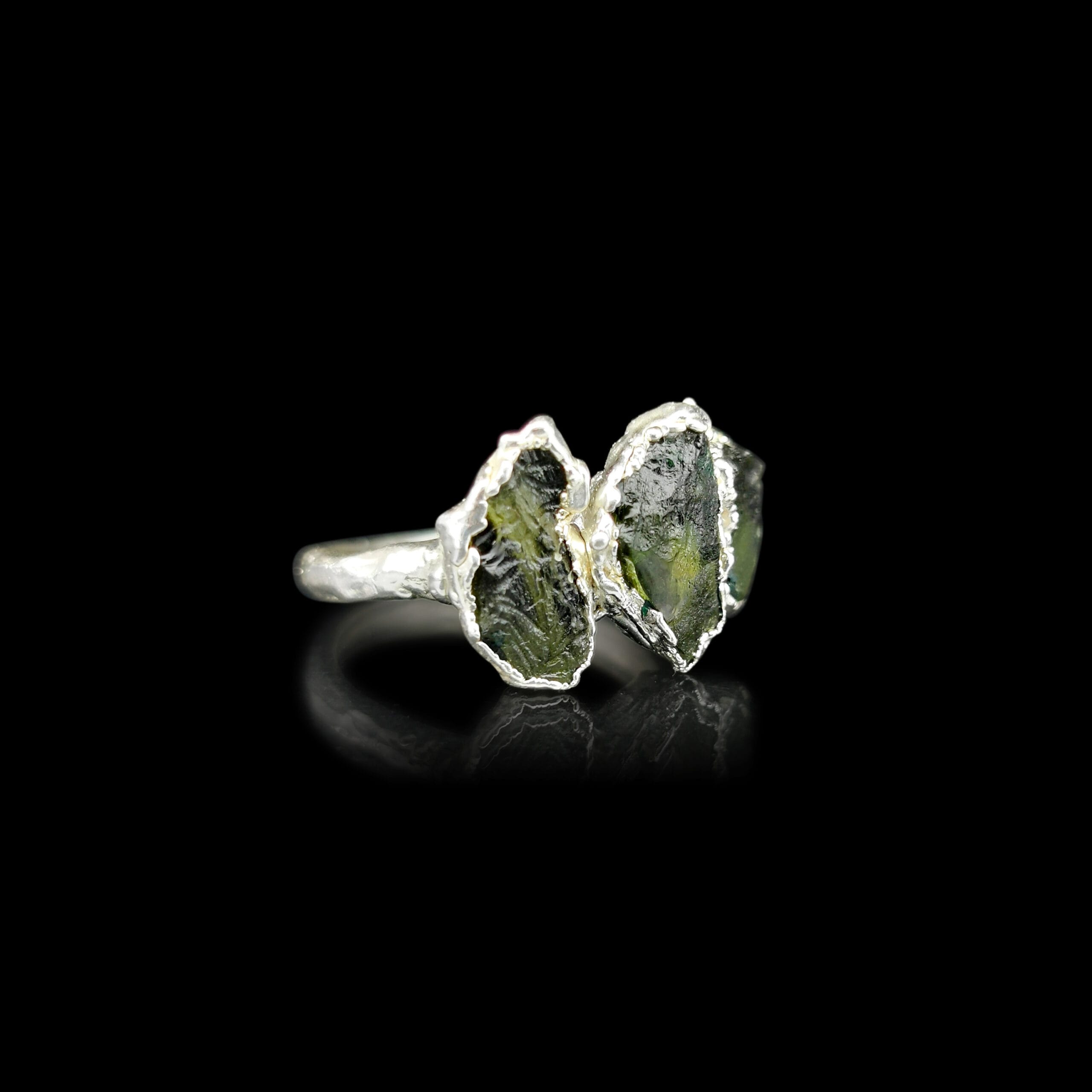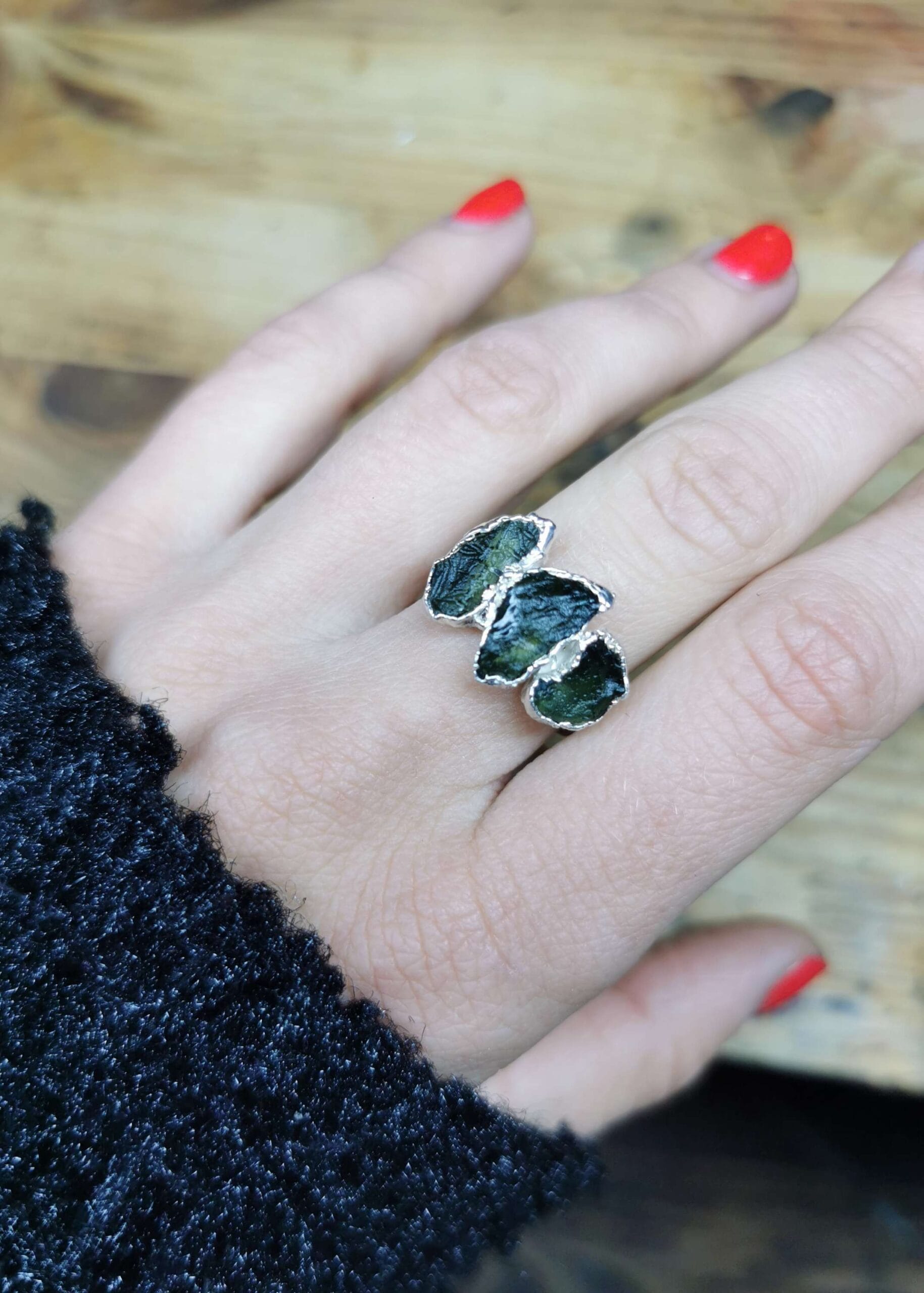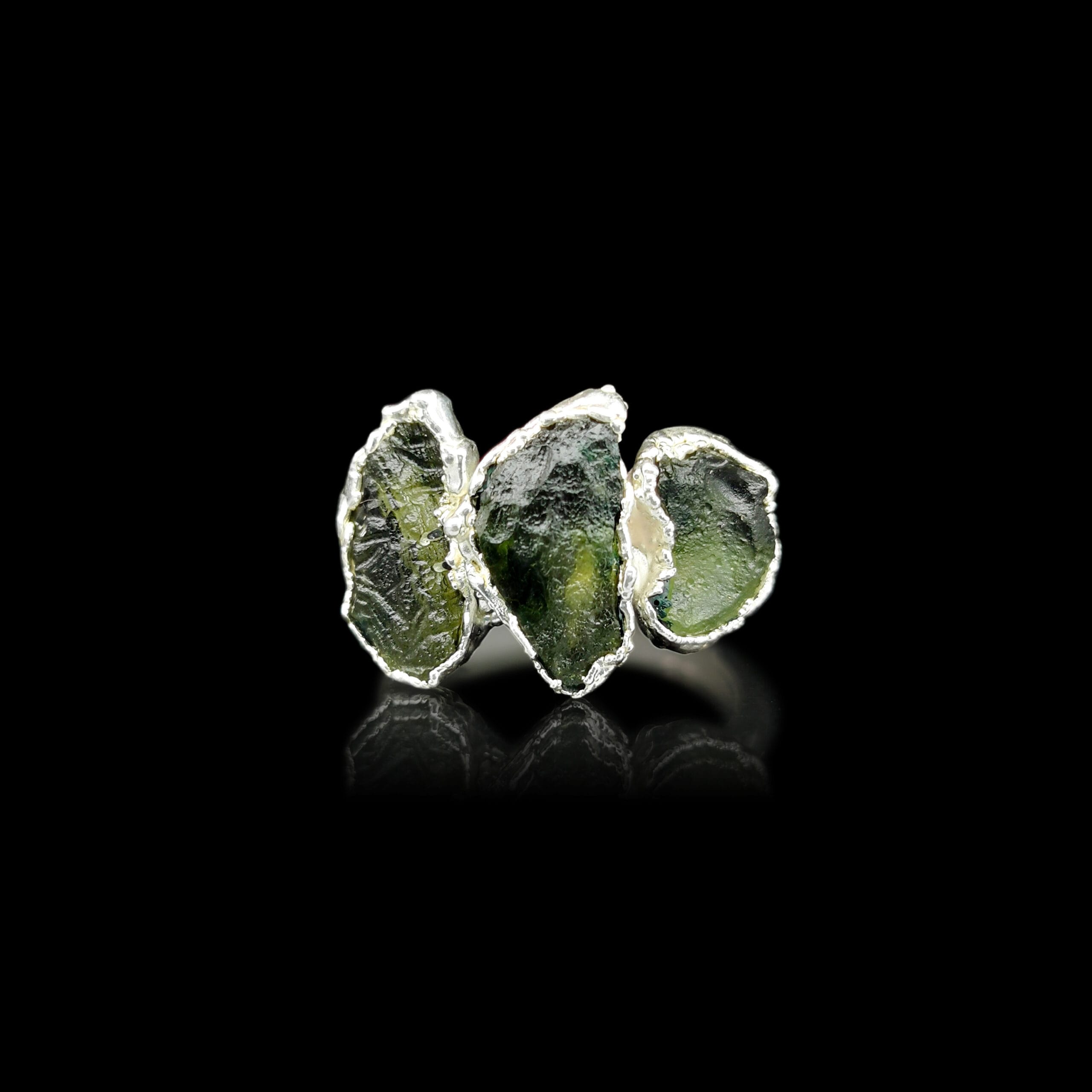 ⚜︎ Vienetinis sidabro žiedas su natūraliais 3 moldavito akmenimis.⚜︎ Sukurta iš 925 ir 999 prabos sidabro, svoris 4,76 g.⚜︎ Žiedo dydis 17,8.⚜︎ Prabuota Latvijos prabavimo rūmuose.⚜ Papuošalas parduodamas supakuotas medinėje rankų darbo dovanų dėžutėje.