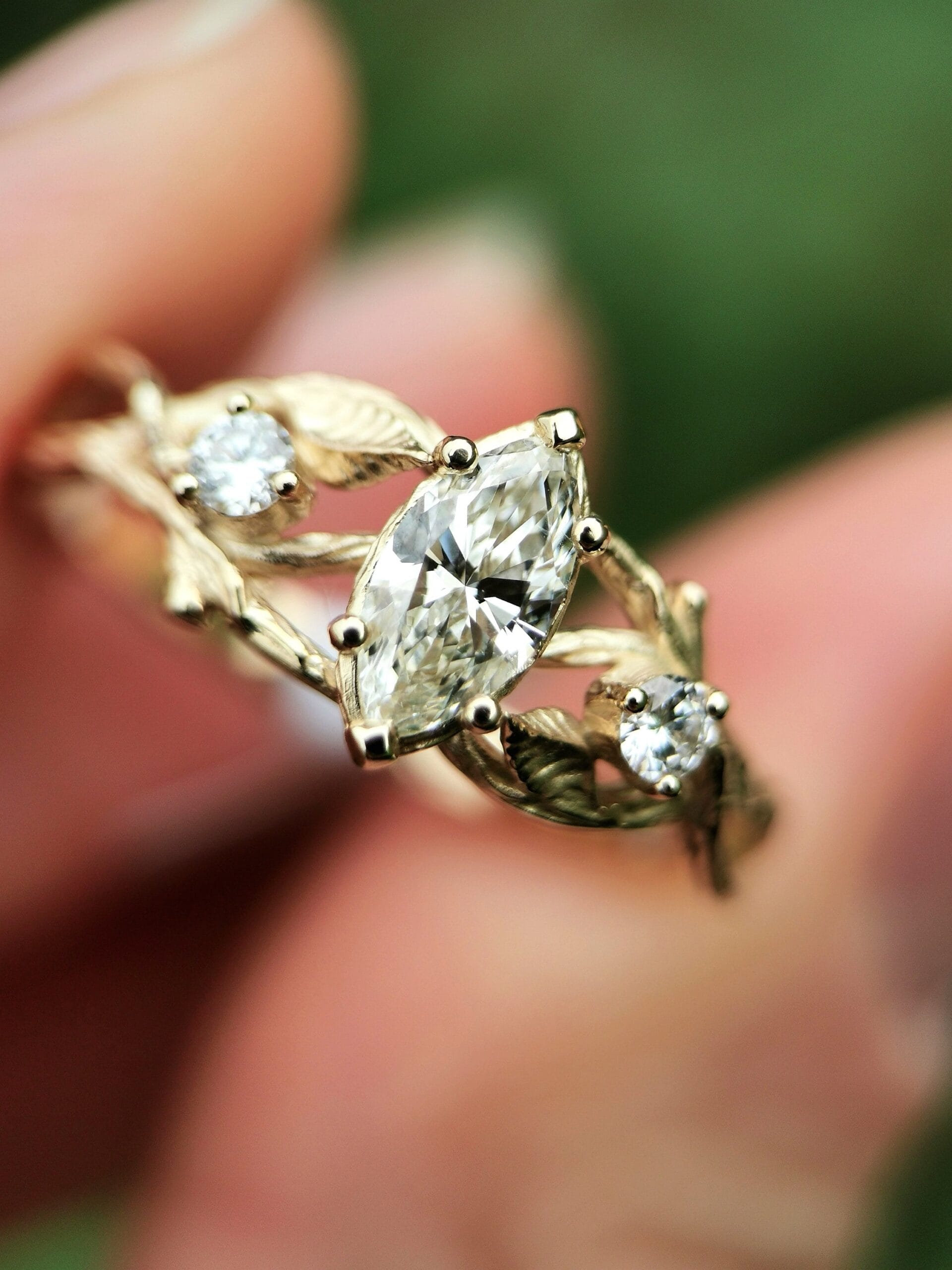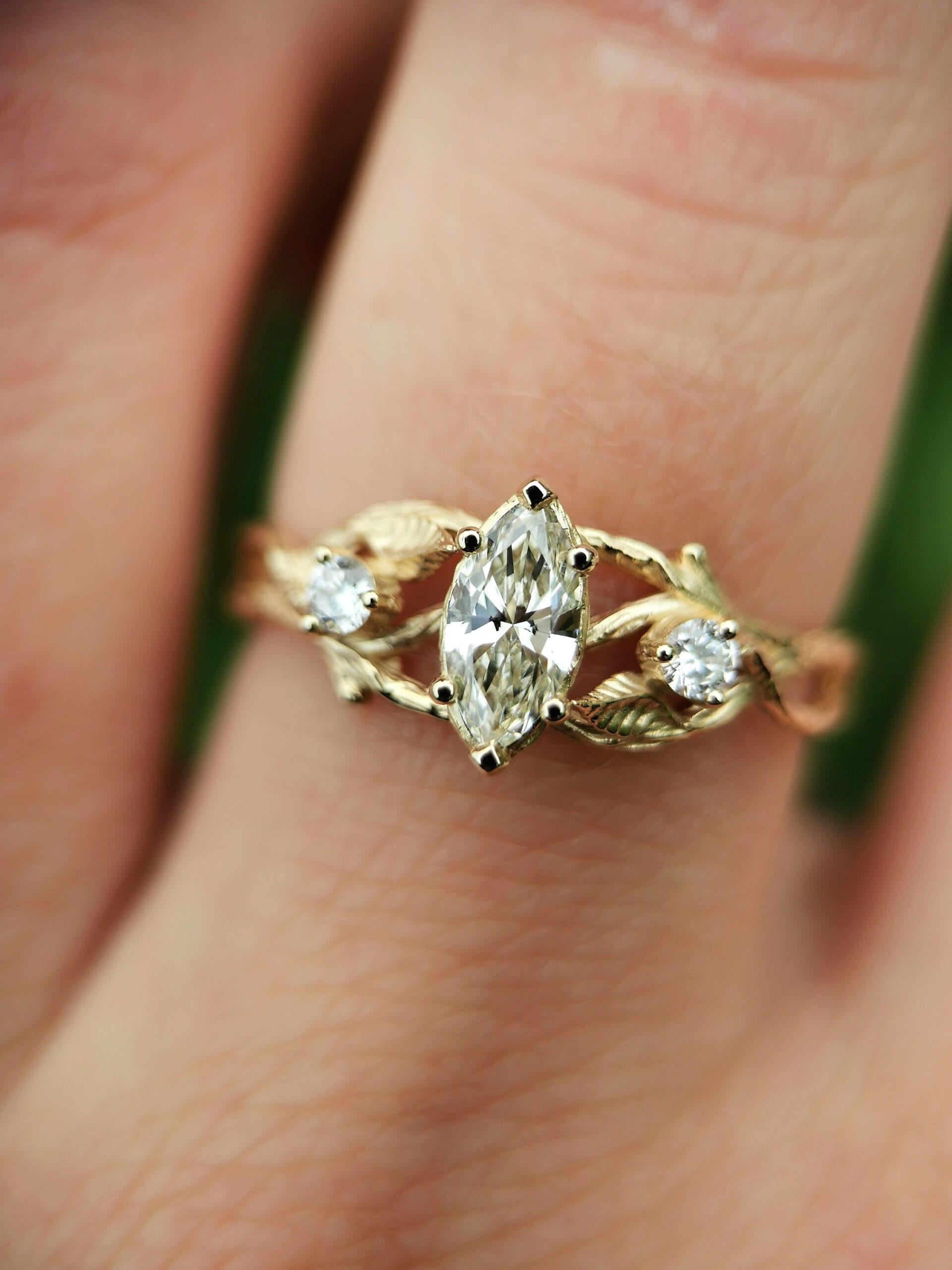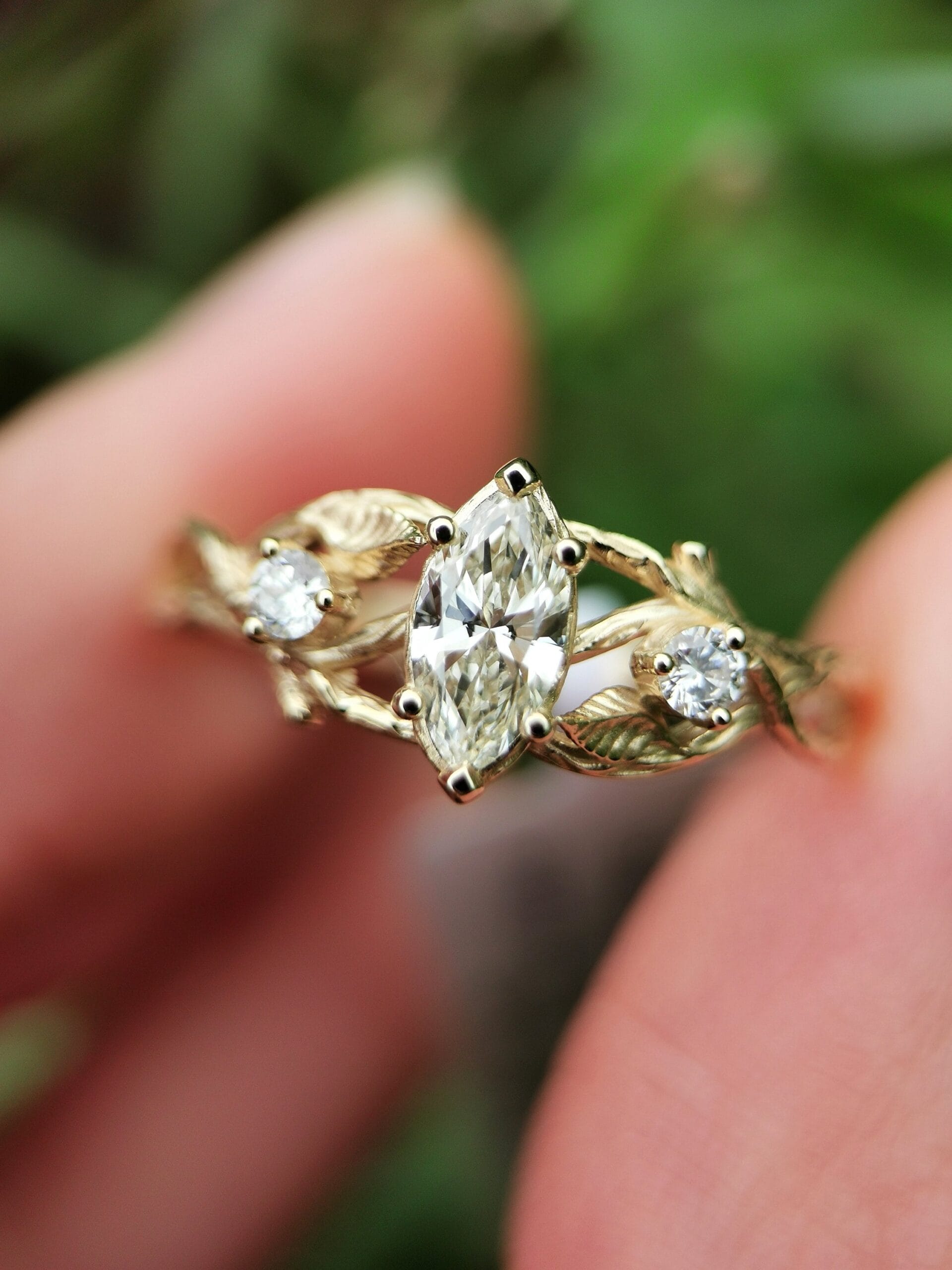 ⚜︎ Centre – 0,35 ct deimantas (marquise cut, SI), šonuose – 2 briliantai, bendras svoris 0,08 ct (VS–SI).