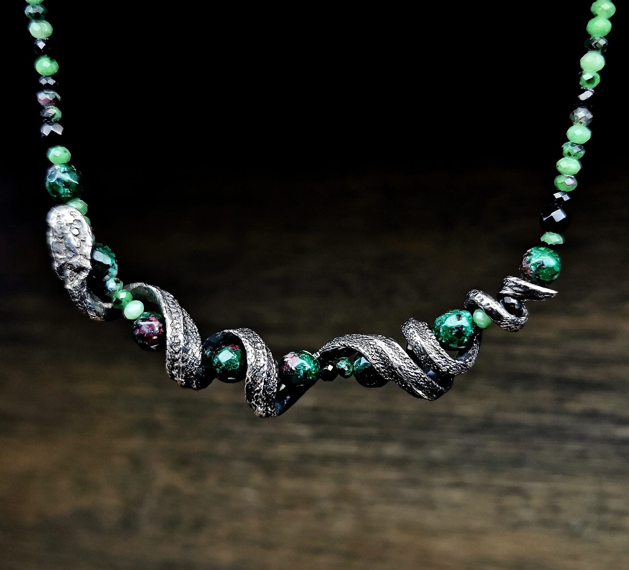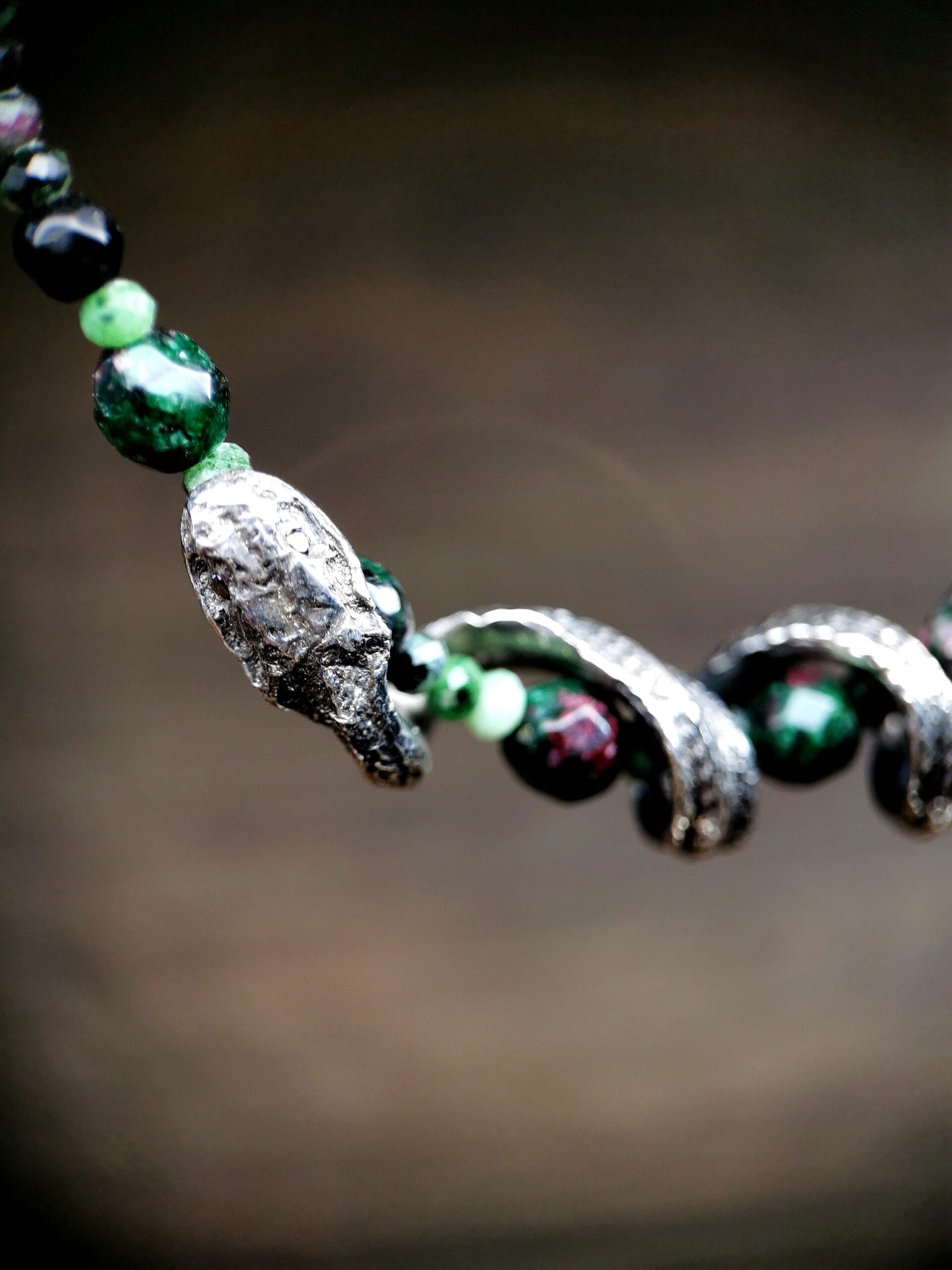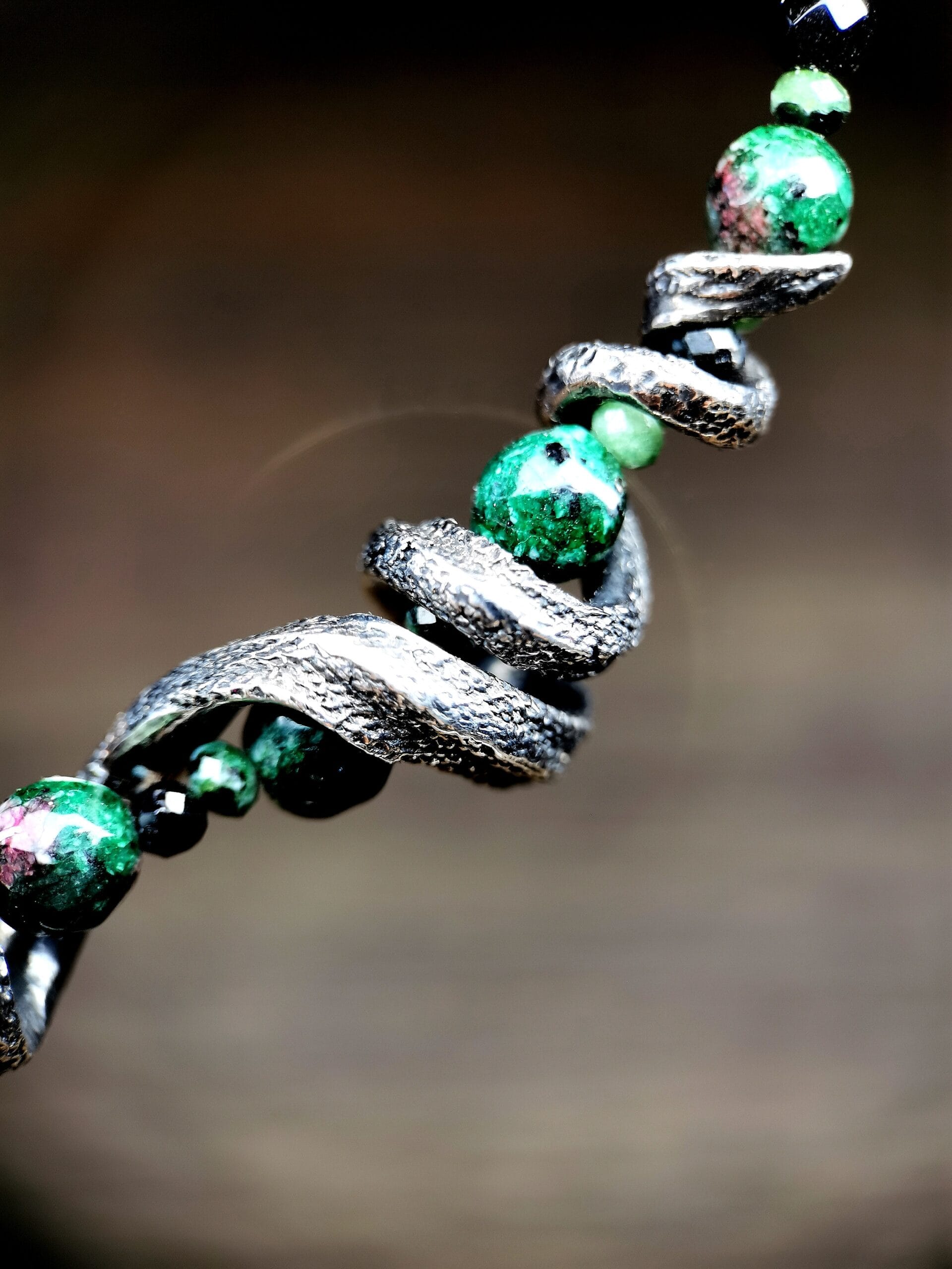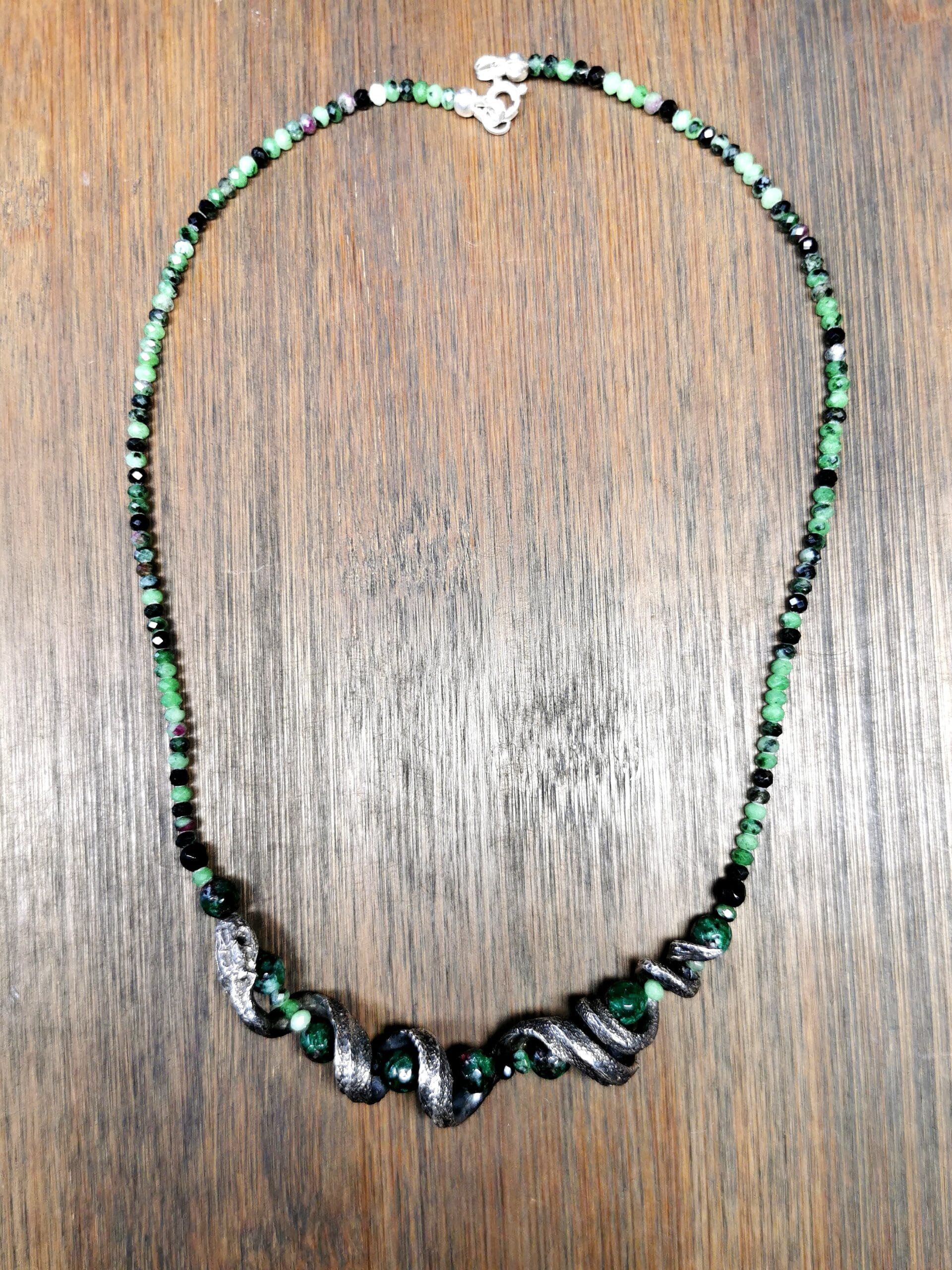 ⚜ Vienetinis tamsinto sidabro vėrinys su žalčiu ir su zoicito ir onikso akmeniniais karoliukais. ⚜ Vėrinio ilgis 45 cm.⚜ Prabuota Latvijos prabavimo rūmuose, papuošalo svoris 25,11 g.⚜ Papuošalas parduodamas supakuotas medinėje rankų darbo dovanų dėžutėje.