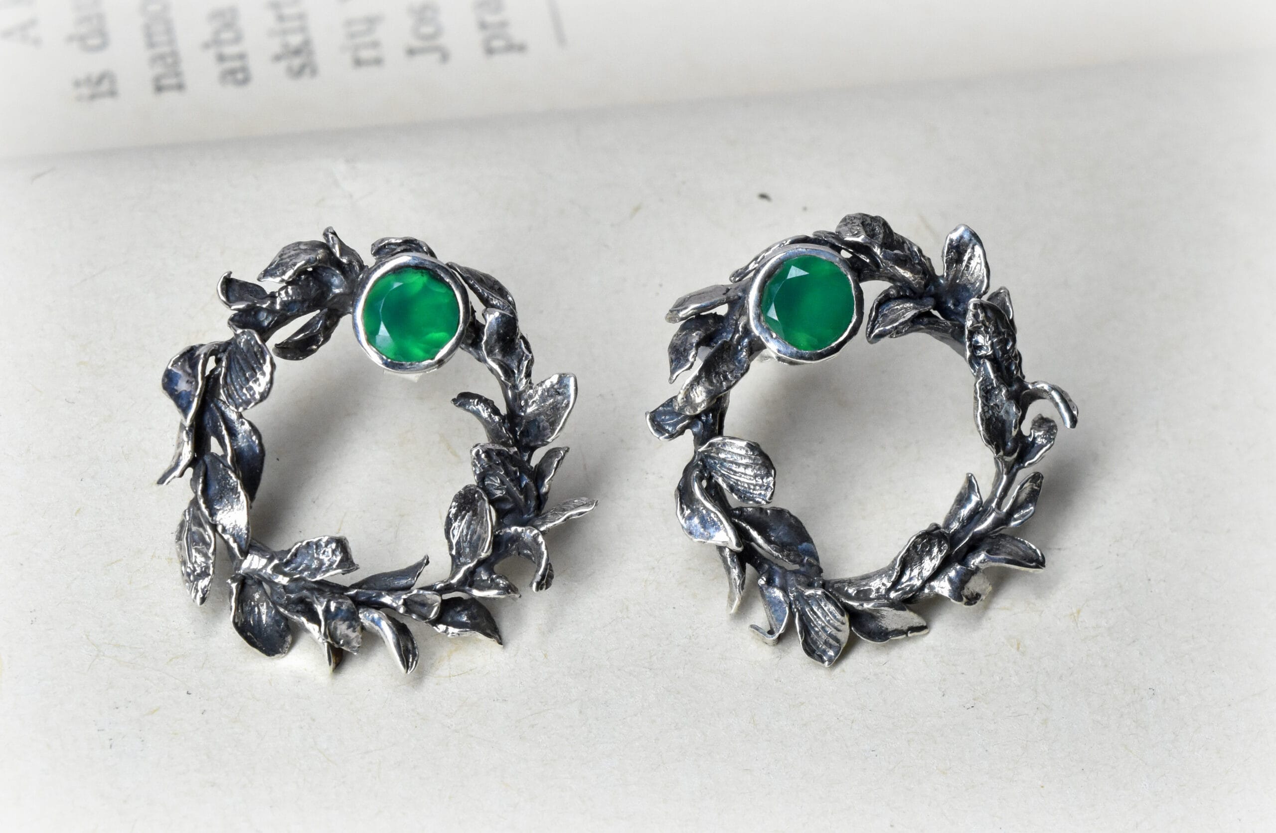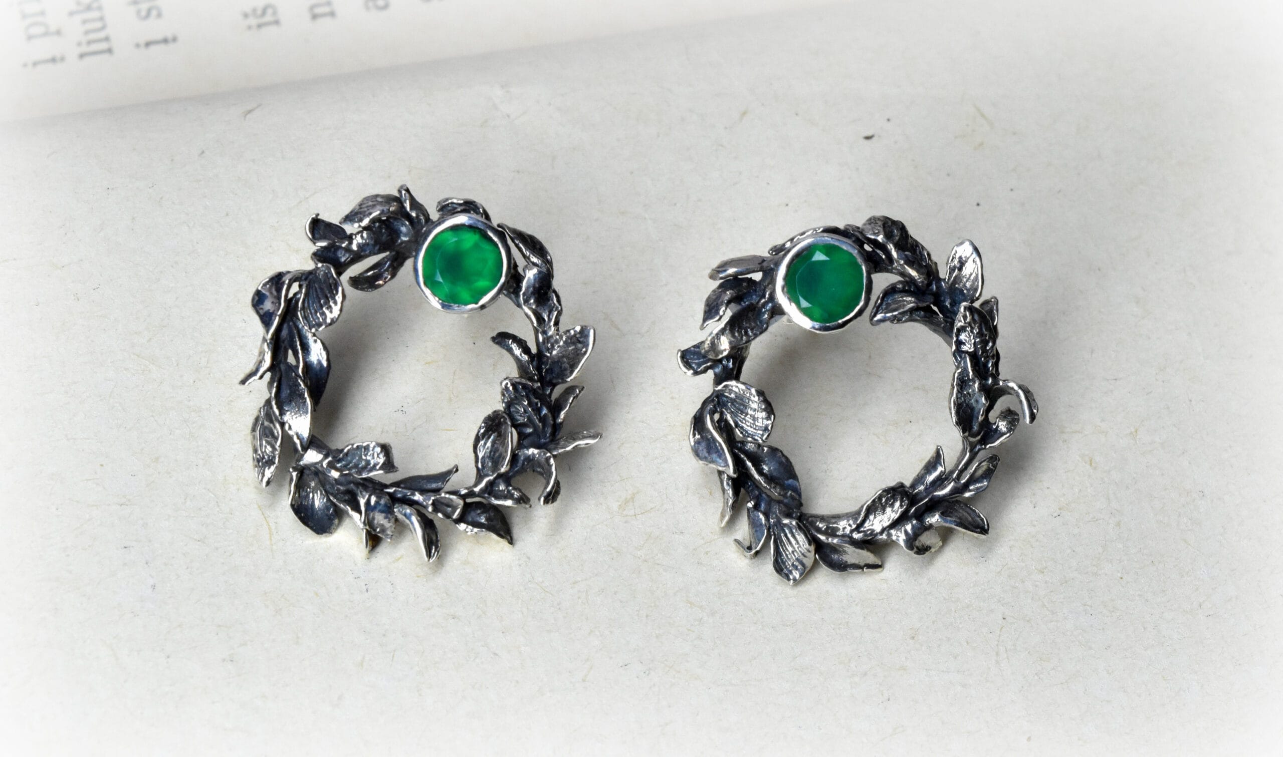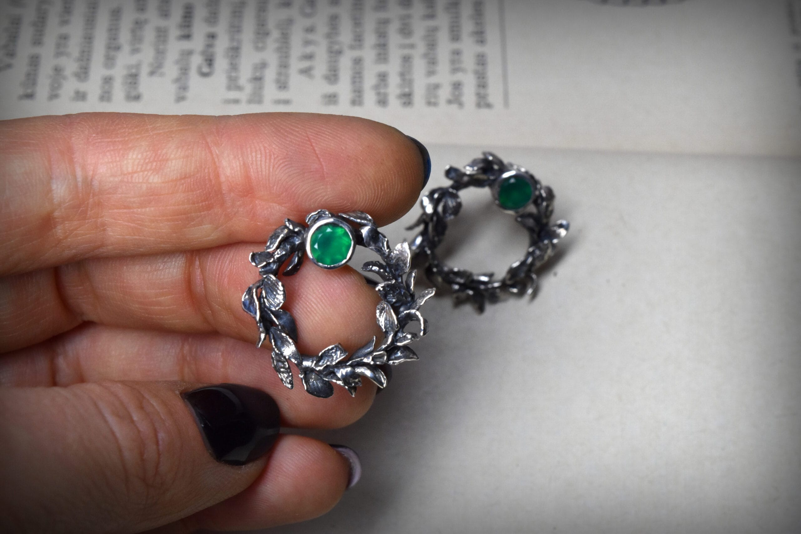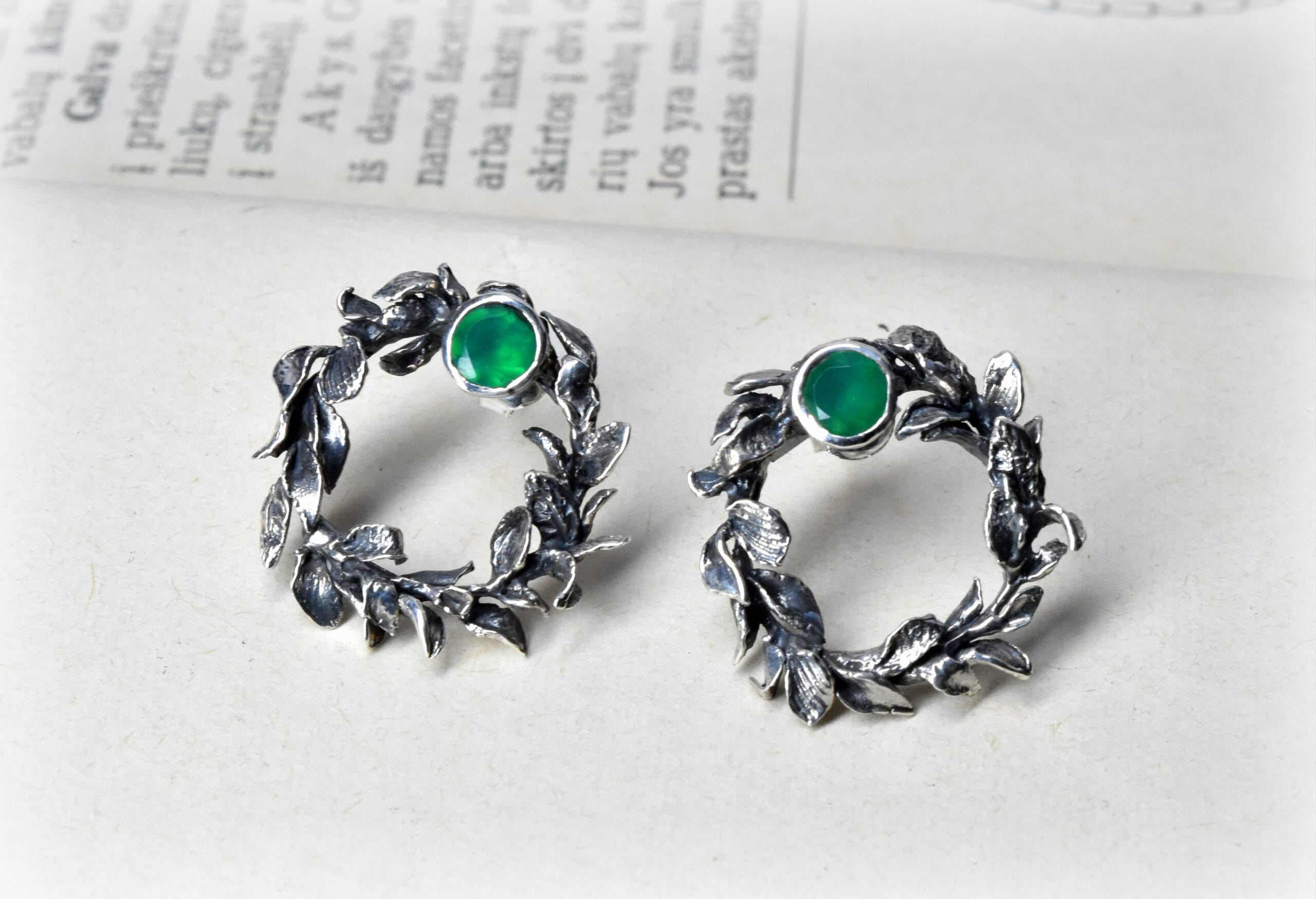 ⚜︎ Auskarai bei jų užsegimai sukurti iš 925 prabos sidabro, sidabras tamsintas.⚜ Auskarai inkrustuoti 5 mm diametro dydžio tamsiai žalios spalvos onikso akmenimis.⚜Kiekvieno auskaro lapeliai unikalūs bei skirtingi, formuoti rankomis.⚜ Prabuota Latvijos prabavimo rūmuose.⚜ Auskarų svoris 6,47 g.⚜ Papuošalas parduodamas supakuotas medinėje rankų darbo dėžutėje.