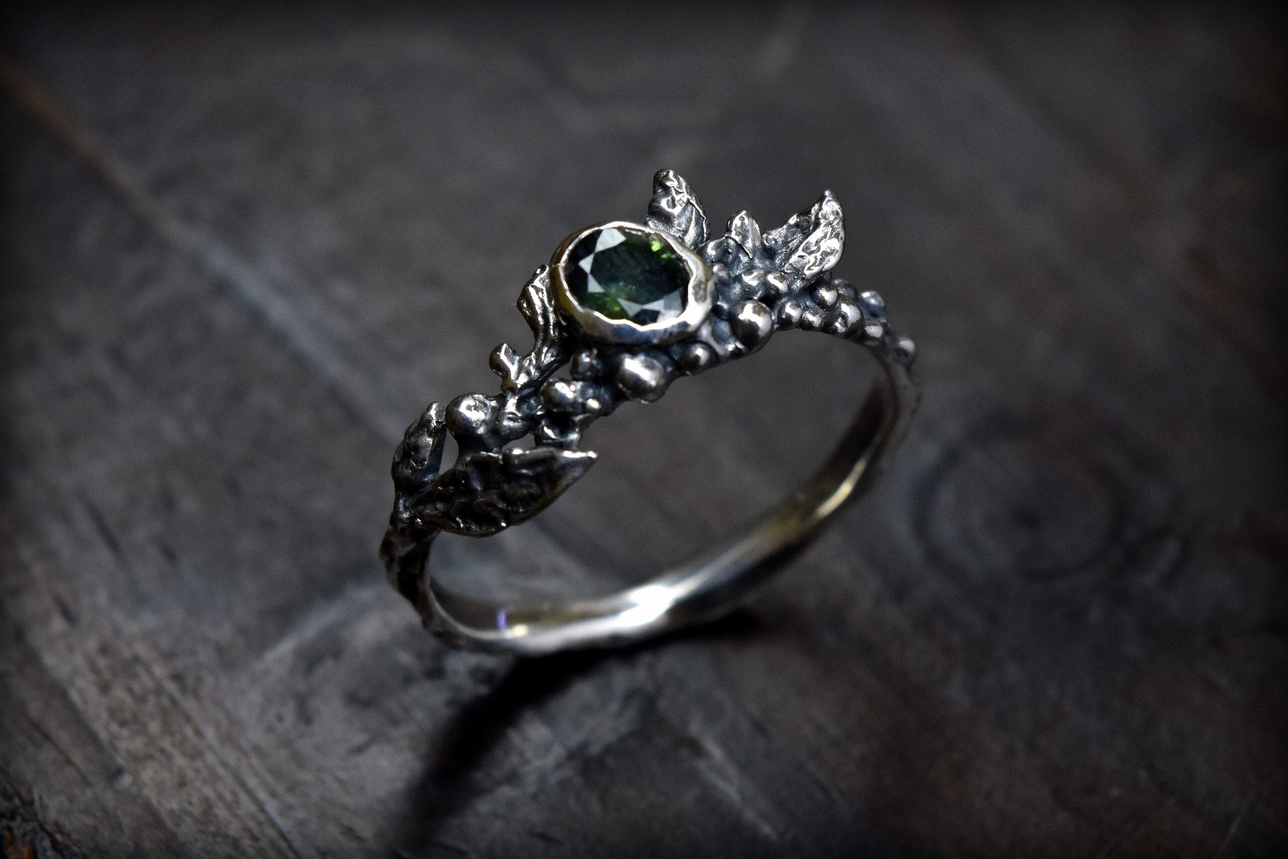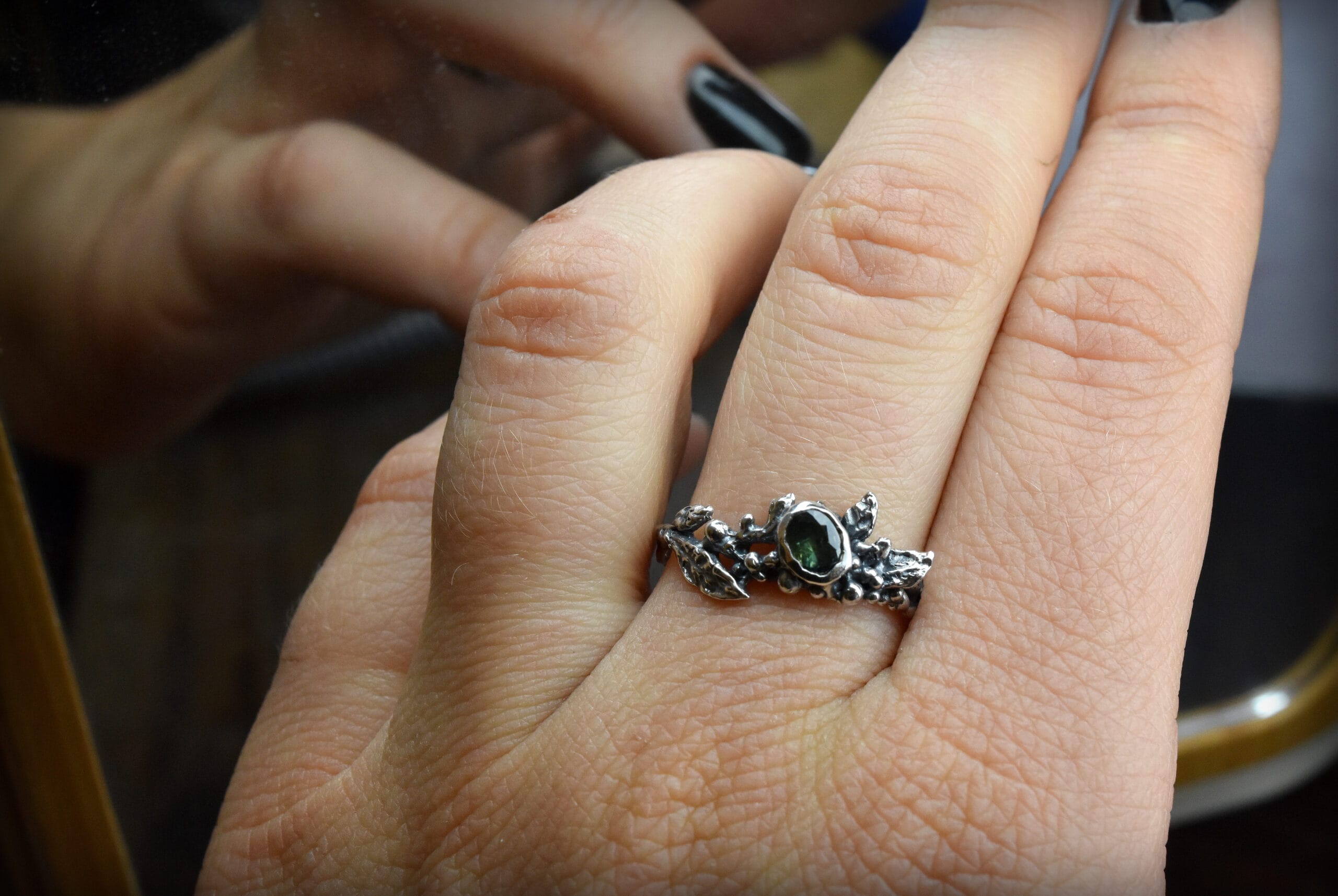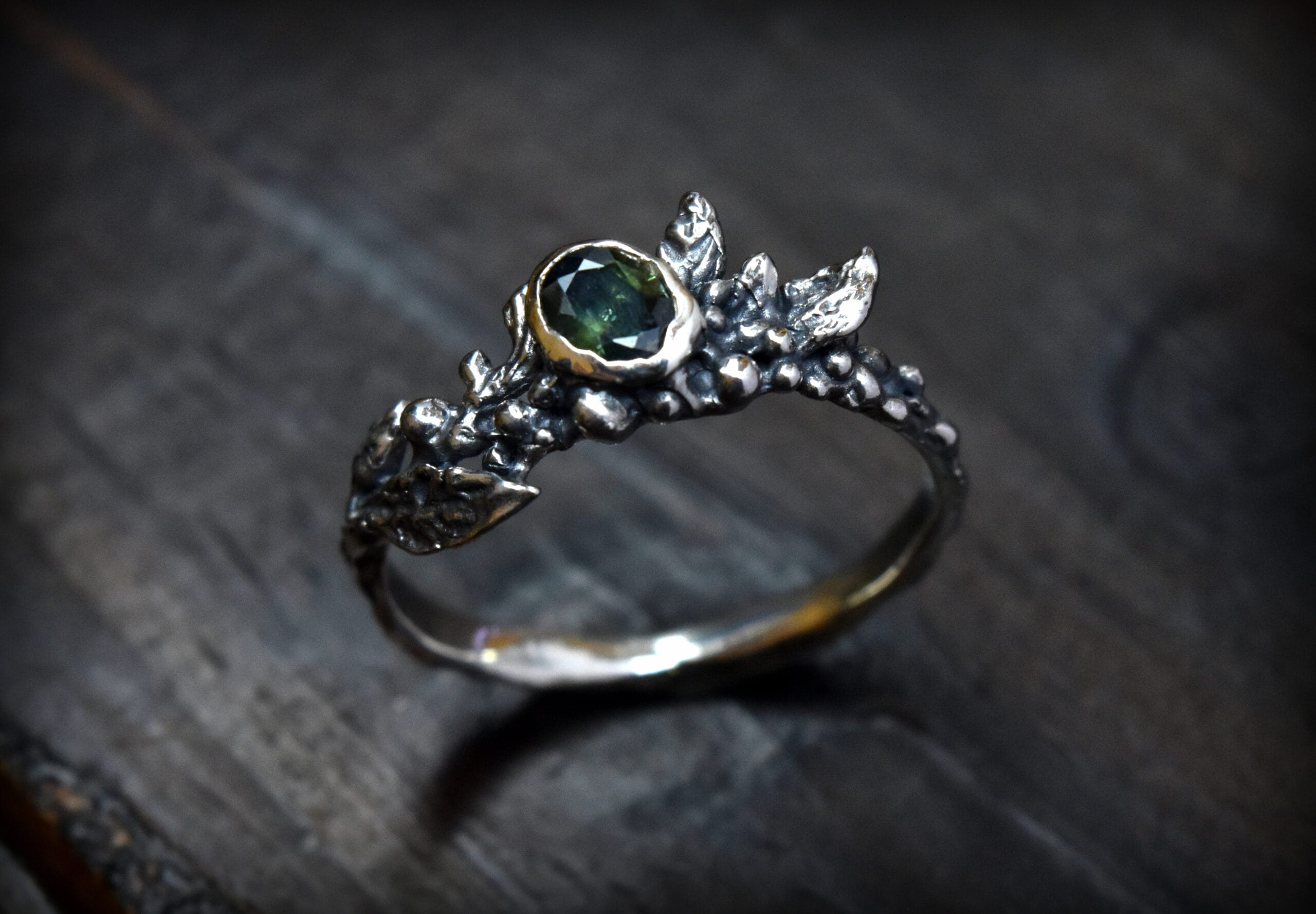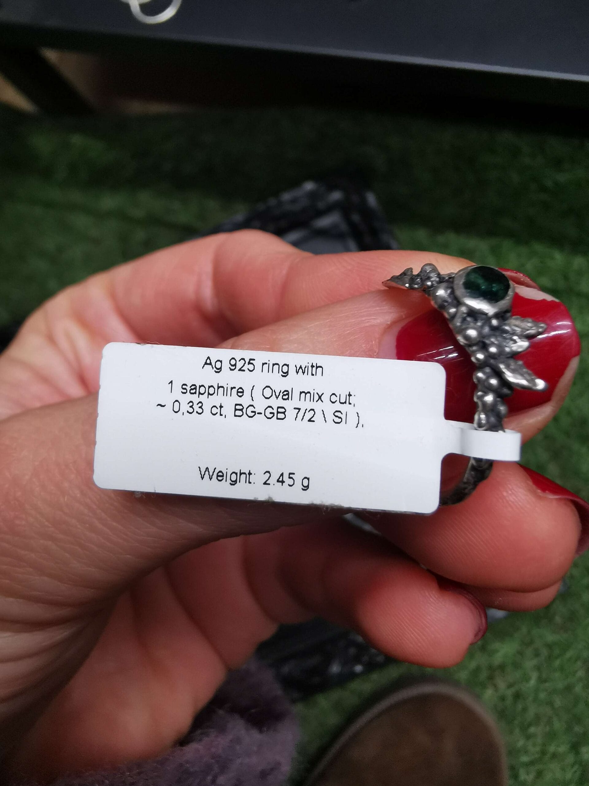 ⚜ Vienetinis rankų darbo žiedas.⚜ Žiedas inkrustuotas tamsiai mėlynos- žalios spalvos safyru. Brangakmenio autentiškumas patvirtintas prabavimo rūmų etiketėje, specifikacijos parašytos paskutinėje nuotraukoje.⚜ Prabuota Latvijos prabavimo rūmuose, sidabro praba 925, sveria 2,45 g.⚜ Dydis 18,2 (esant poreikiui gali būti šiek tiek didinamas ar mažinamas).⚜ Papuošalas parduodamas supakuotas medinėje rankų darbo dėžutėje.