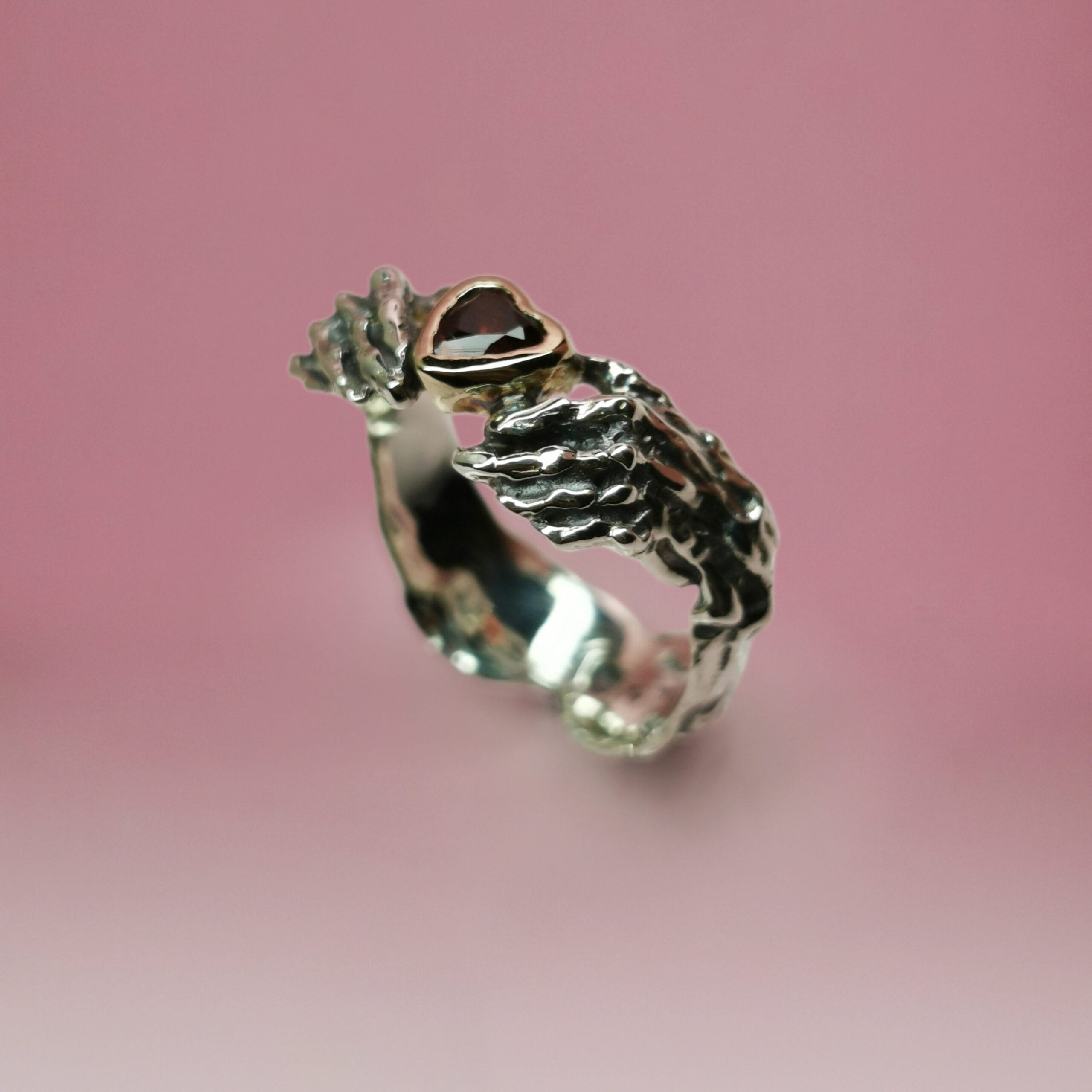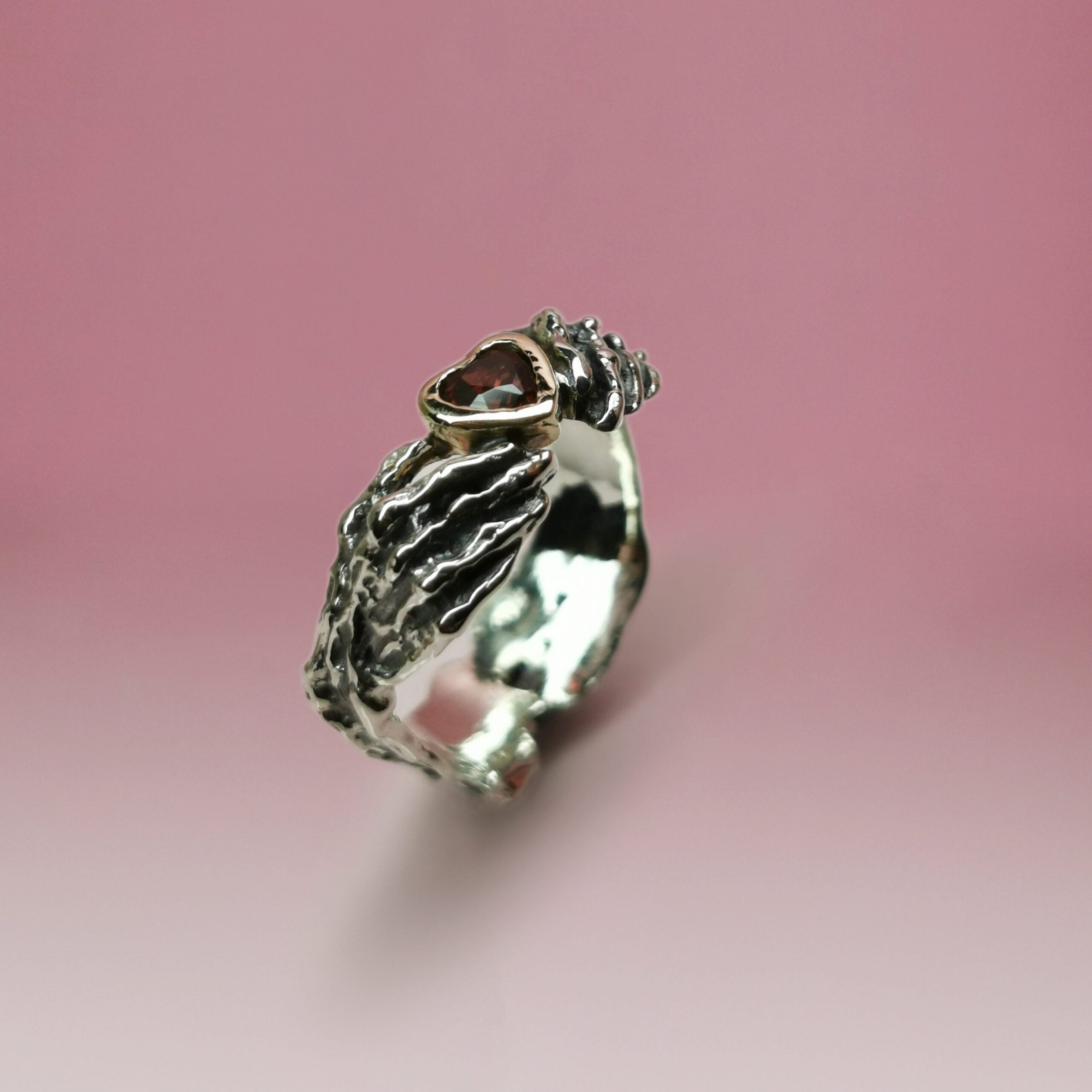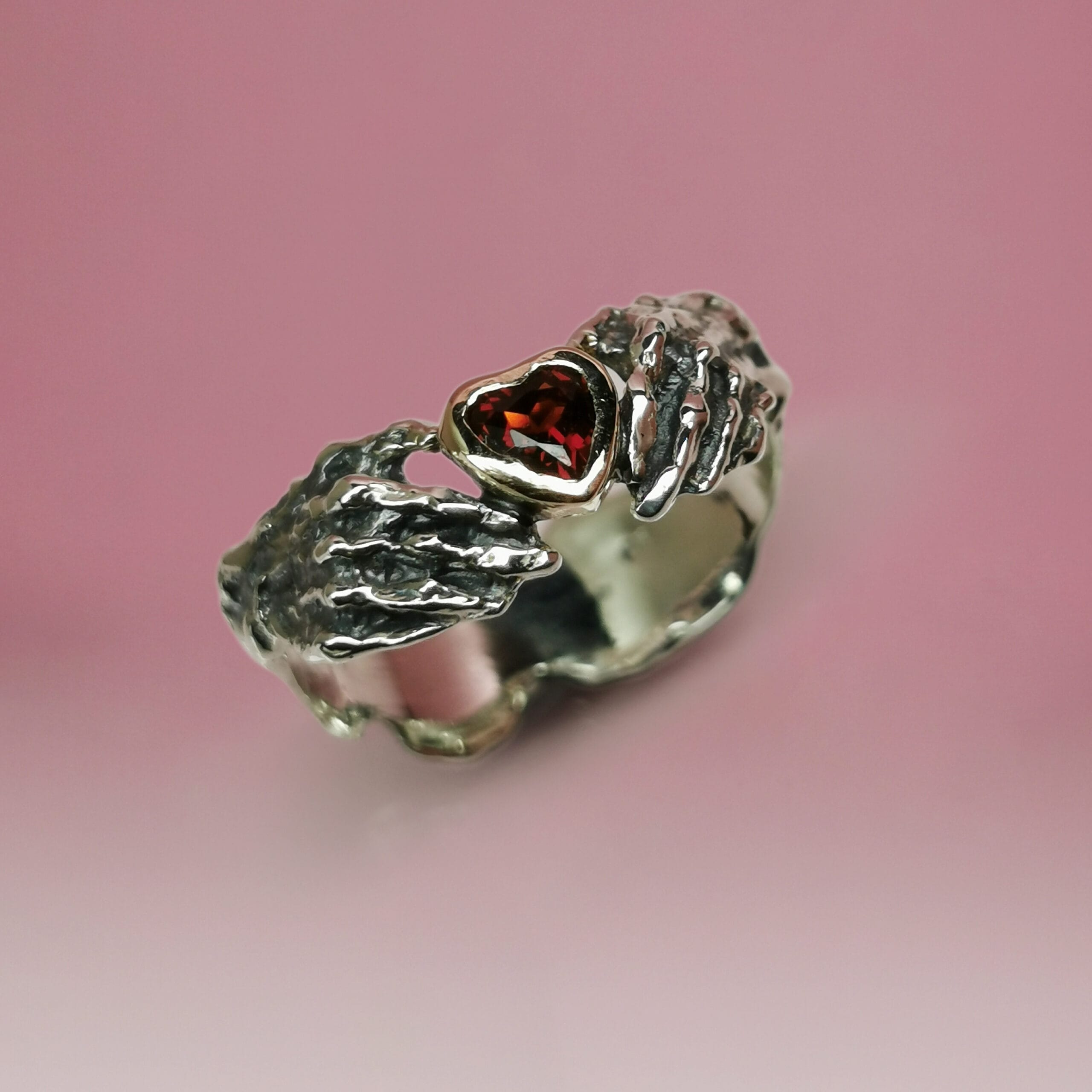 ⚜︎ Tamsinto sidabro ir aukso žiedas su tamsiai raudonu širdelės formos 4 mm dydžio granatu.⚜︎ Sukurta iš 925 prabos sidabro ir 585 prabos aukso, žiedas sveria 3,69 g.⚜︎ Galima rinktis iš kelių skirtingų dydžių ir aukso atspalvių.⚜︎ Prabuota Lietuvos prabavimo rūmuose.⚜ Papuošalas parduodamas supakuotas medinėje rankų darbo dovanų dėžutėje.⚜ Žiedo dydis gali būti pakeistas. Jei reikalingas kitoks žiedo dydis, susisiekite su mumis puslapyje nurodytais kontaktais ir žiedo dydį pakoreguosime.