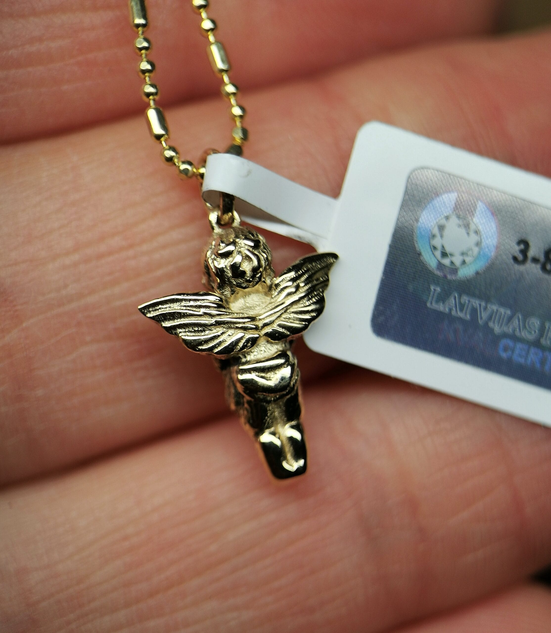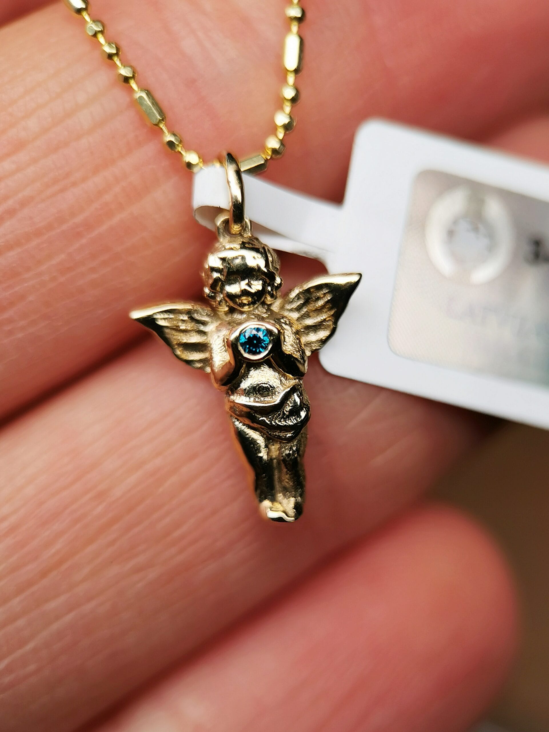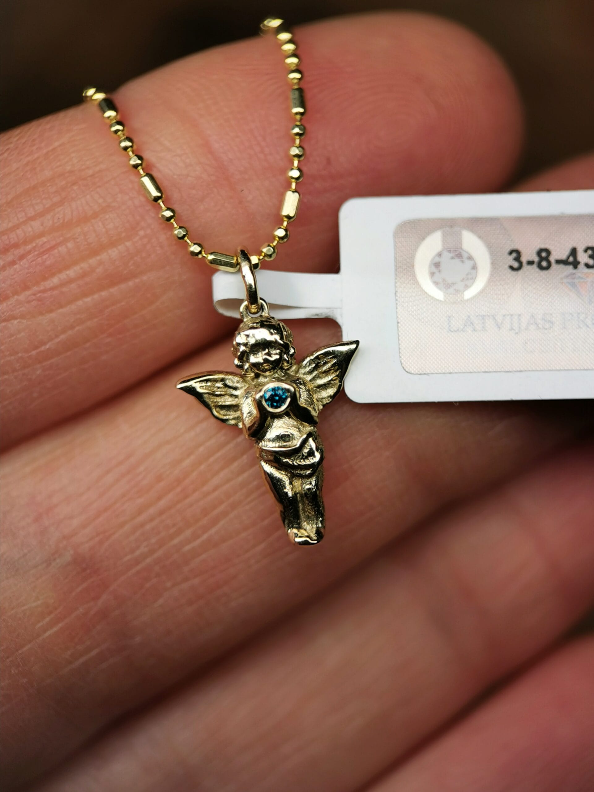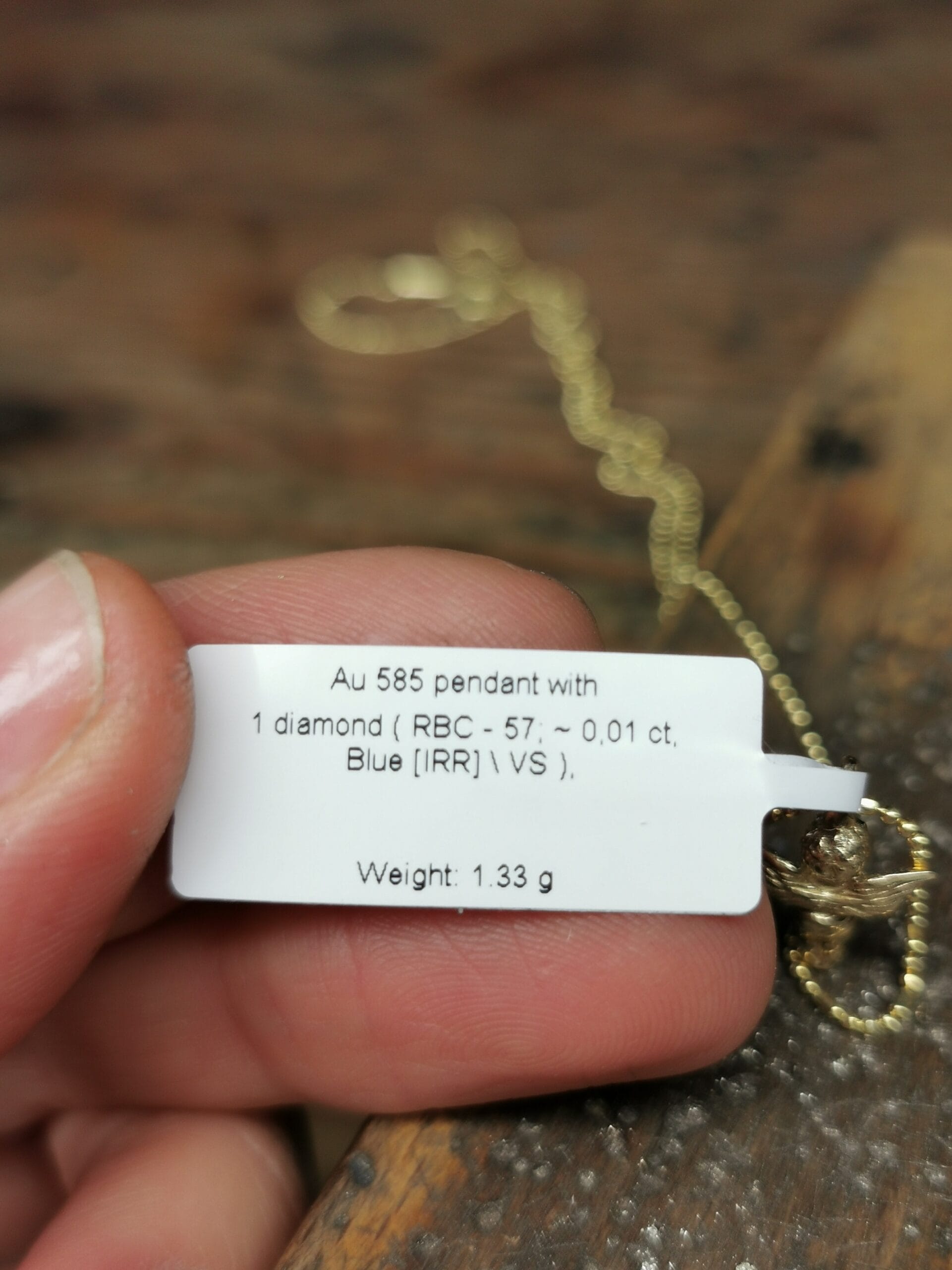 ⚜ Nedidelis geltono aukso pakabukas su 1,5 mm dydžio natūraliu mėlynu deimantu .⚜ Prabuota Latvijos prabavimo rūmuose. Aukso praba 585, pakabuko svoris 1,33 g. Deimanto autentiškumas patvirtintas prabavimo rūmų etiketėje, brangakmenio specifikacijos įrašytos paskutinėje nuotraukoje.⚜ Papuošalas parduodamas supakuotas medinėje rankų darbo dovanų dėžutėje.