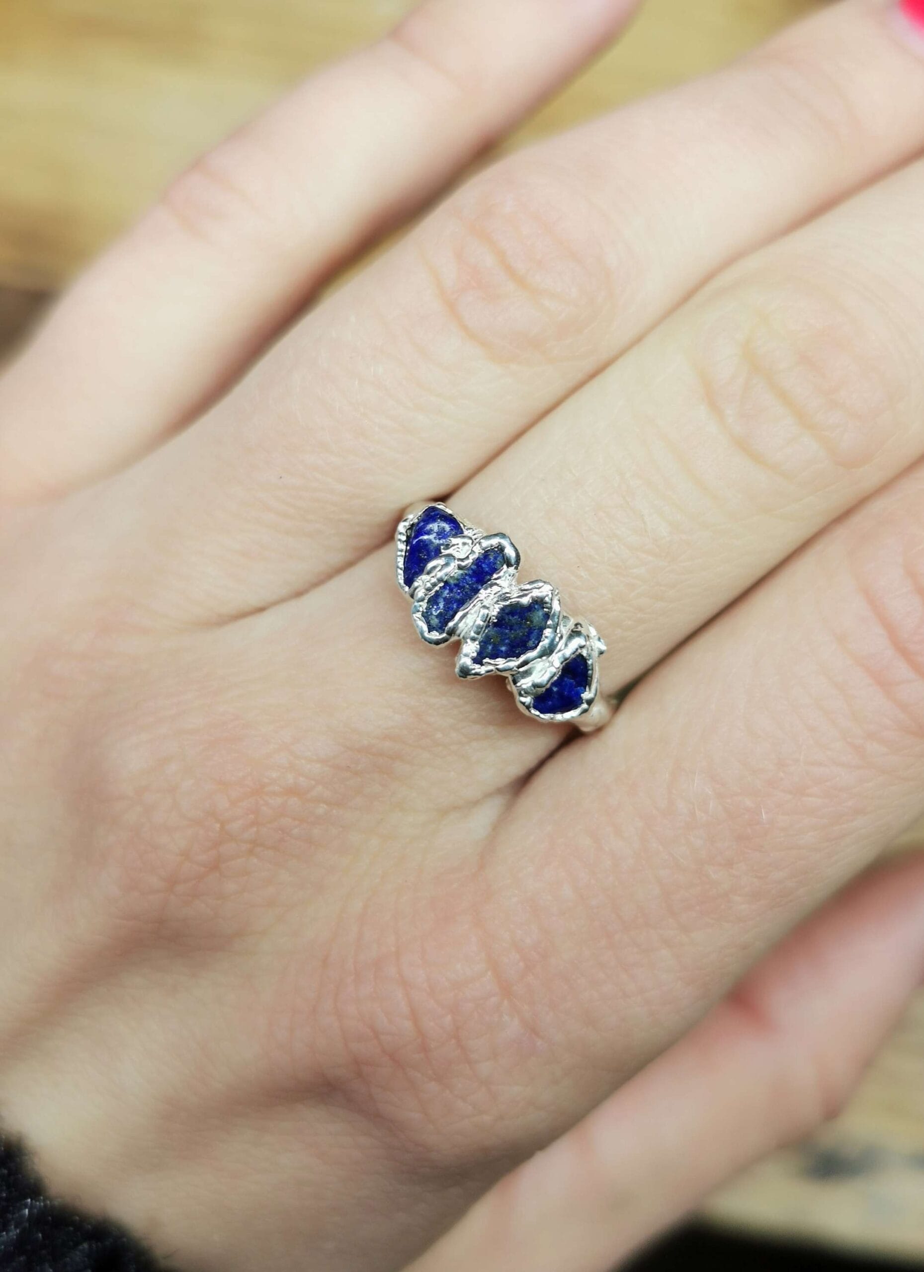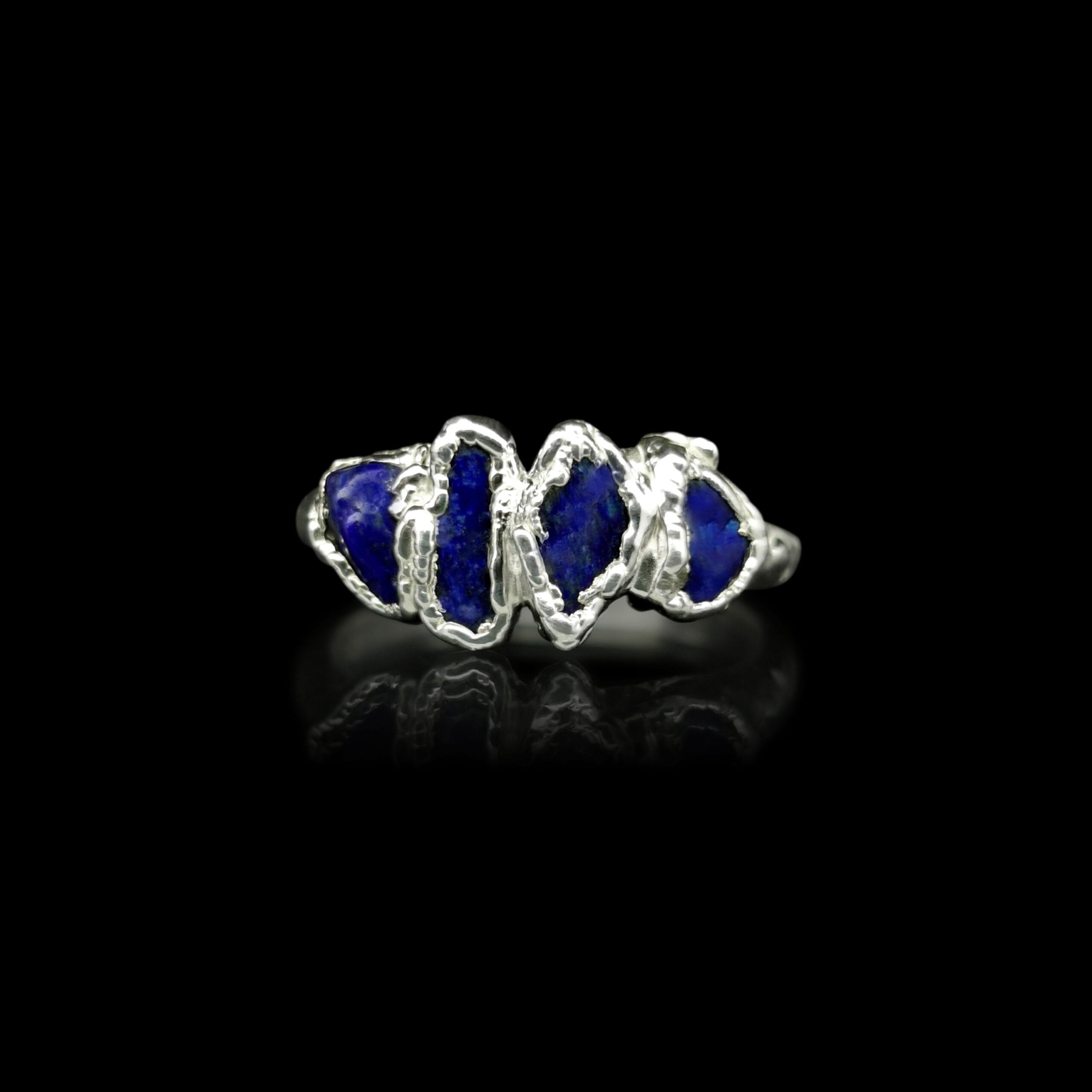 ⚜︎ Vienetinis sidabro žiedas su natūraliais, neapdirbtais 4 lazurito mineralais.⚜︎ Sukurta iš 925 ir 999 prabos sidabro.⚜︎ Žiedo dydis 16,8. ⚜︎ Prabuota Latvijos prabavimo rūmuose, žiedo svoris 2,90 g.⚜ Papuošalas parduodamas supakuotas medinėje rankų darbo dovanų dėžutėje.