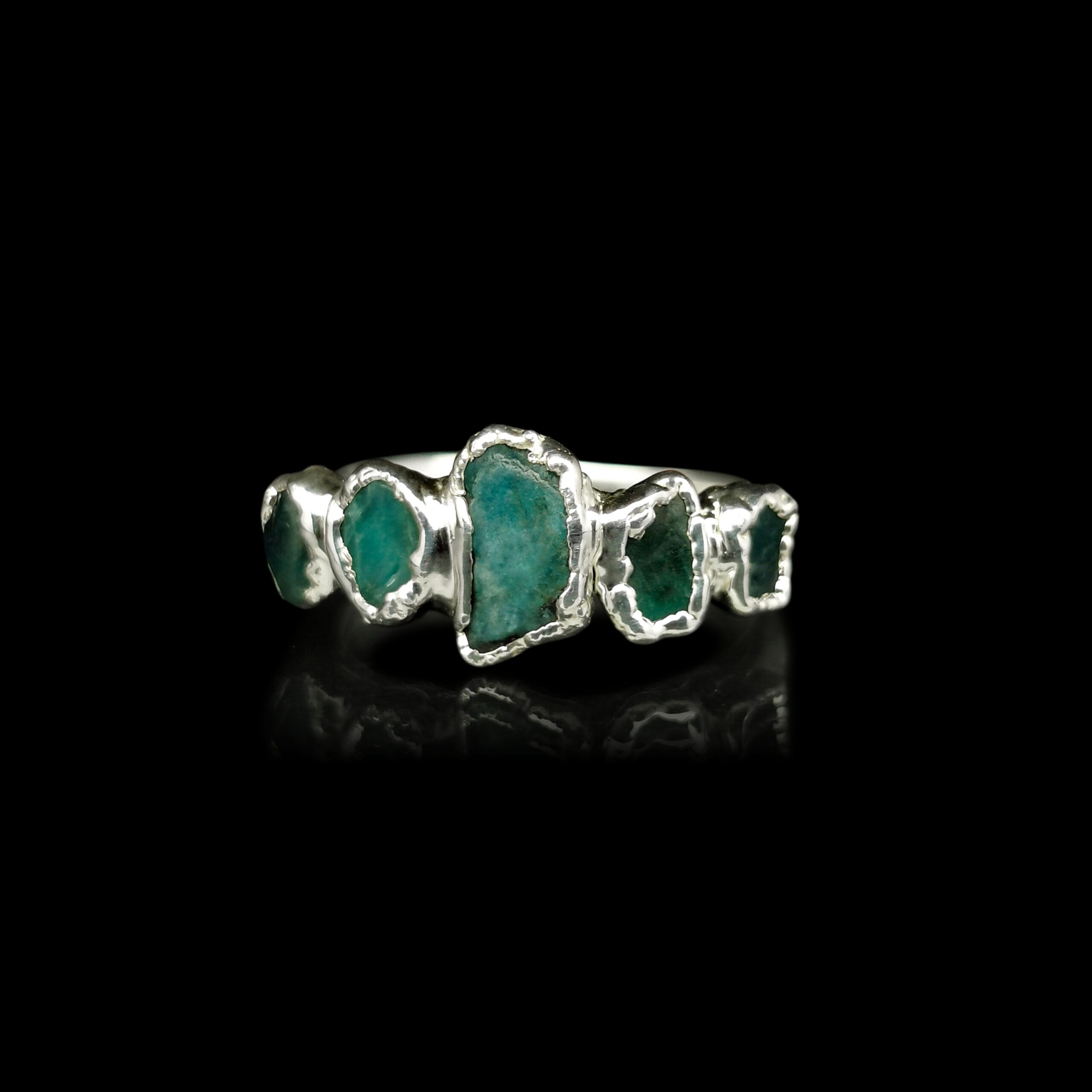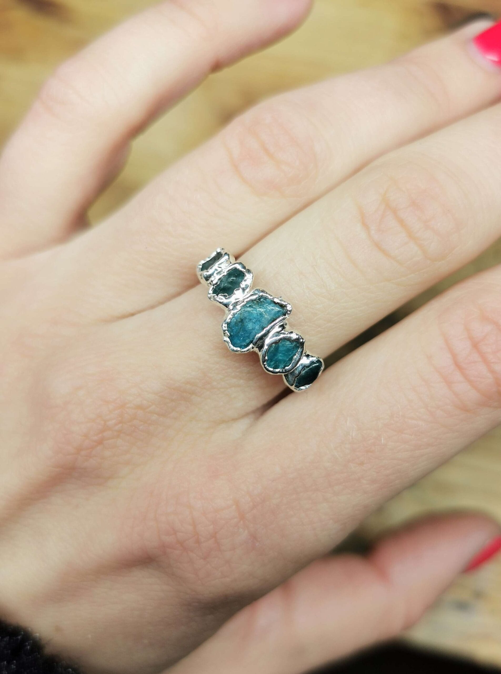 ⚜︎ Vienetinis sidabro žiedas su 5 natūraliais apatito akmenimis.⚜︎ Sukurta iš 925 ir 999 prabos sidabro.⚜︎ Žiedo dydis 17, svoris 3,48 g.⚜︎ Prabuota Latvijos prabavimo rūmuose.⚜ Papuošalas parduodamas supakuotas medinėje rankų darbo dovanų dėžutėje.