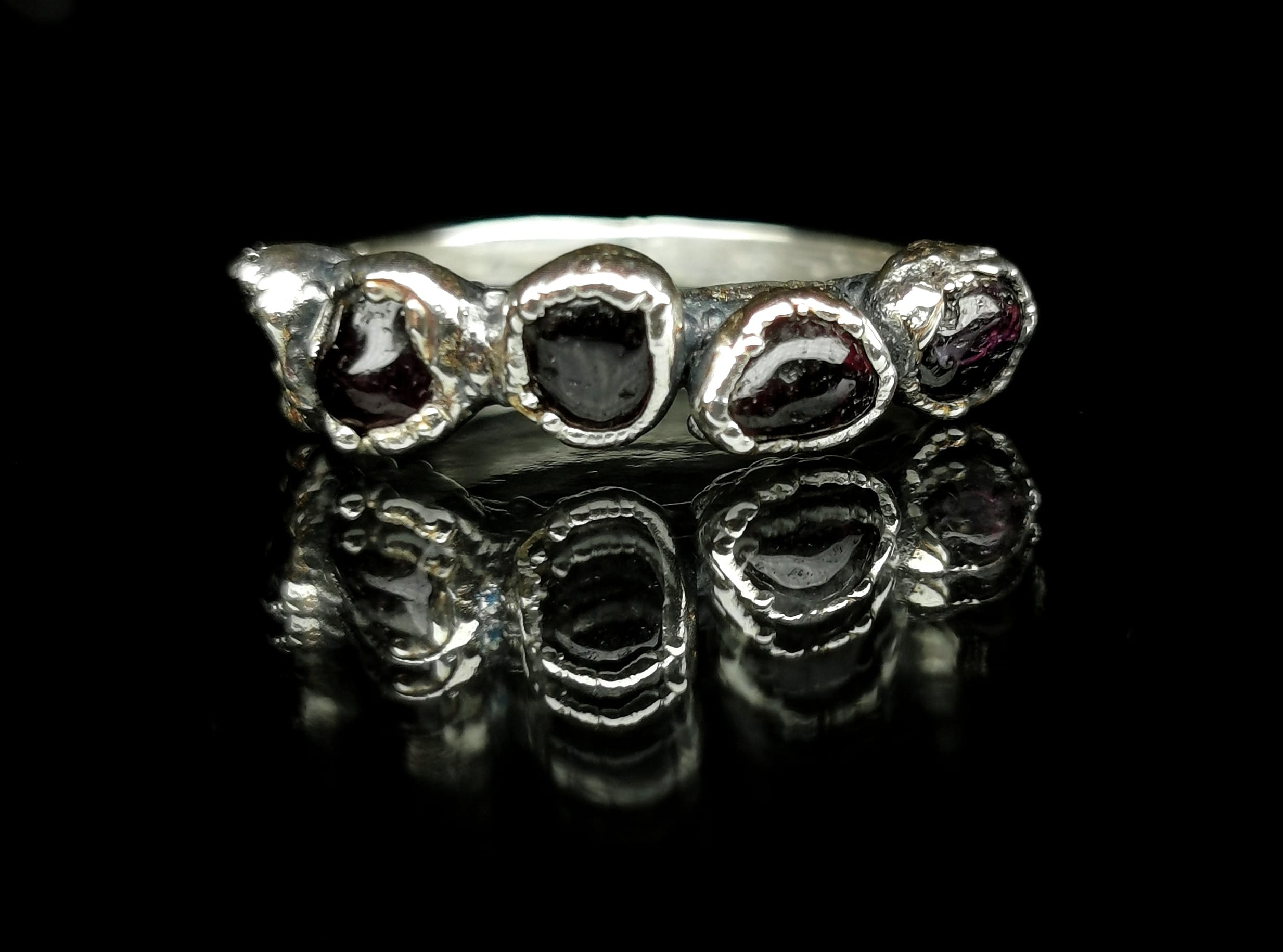⚜︎ Vienetinis sidabro žiedas su 5 natūraliais granato akmenimis.⚜︎ Sukurta iš 925 ir 999 prabos sidabro, sveria 2,08 g.⚜︎ Žiedo dydis 15,5. ⚜︎ Prabuota Lietuvos prabavimo rūmuose.⚜ Papuošalas parduodamas supakuotas medinėje rankų darbo dovanų dėžutėje.