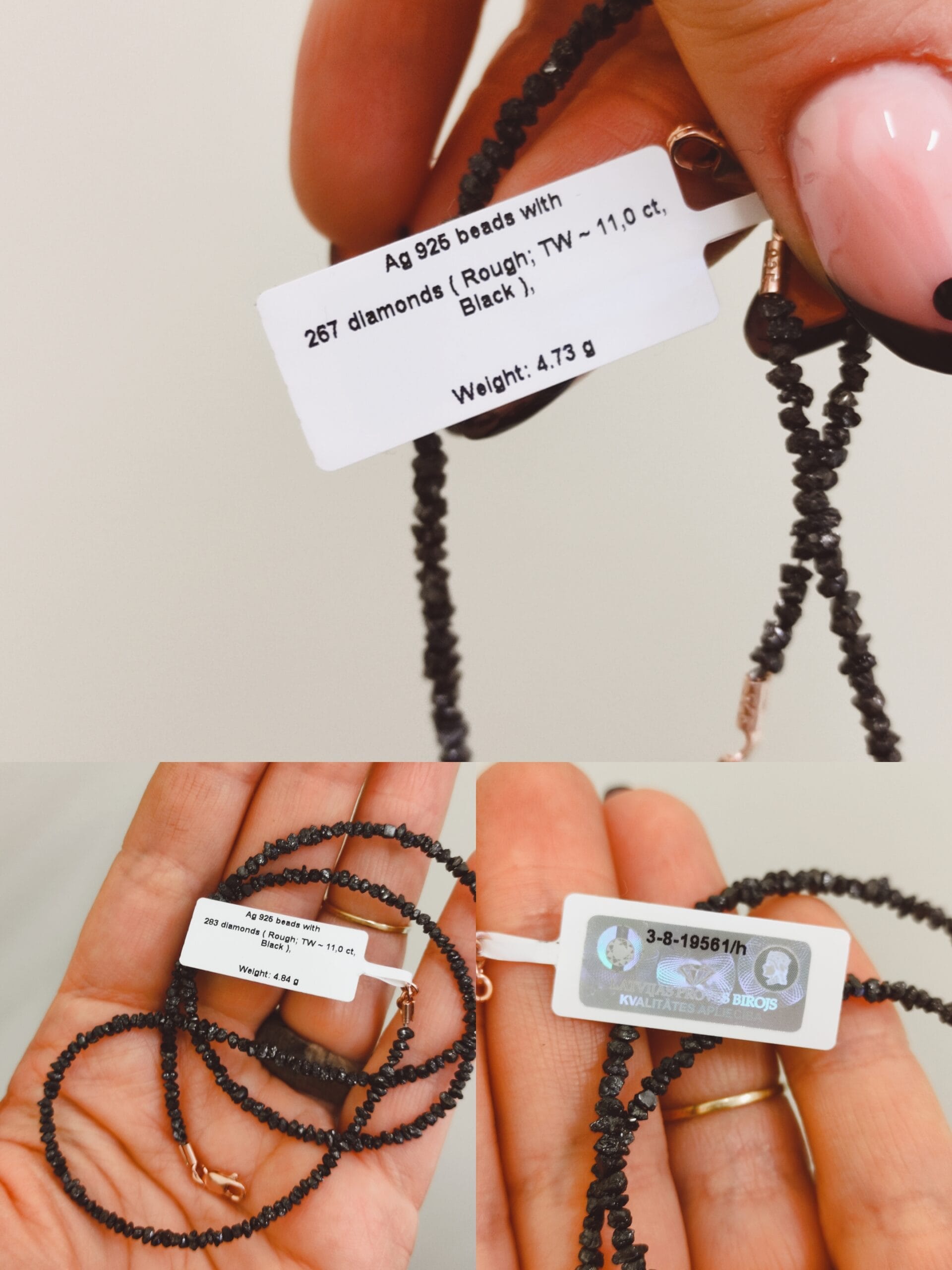 ⚜︎ Prabangus vėrinys su juodais, neapdirbtais, natūraliais deimantais⚜︎ Užsegimai ir vėrinio grandinėlė sukurti iš 925 prabos sidabro, dengto rausvu auksu⚜︎ Bendras deimantų svoris vėrinyje 11 karatų, vėriniai sudaryti iš 267- 283 smulkių deimantų, brangakmenių specifikacijos parašytos paskutinėje nuotraukoje. Vėrinys sveria 4,84 g⚜︎ Prabuota Latvijos prabavimo rūmuose⚜︎ Vėrinio ilgis 45 cm