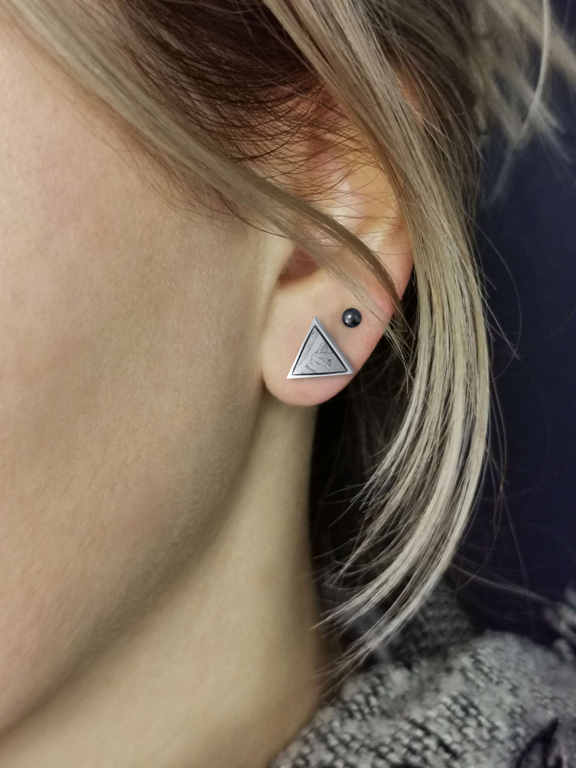 ⚜ Rankų darbo auskarai su Muonionalusta meteoritais. Kiekvienas meteoritas pasižymi unikaliais raštais, tad parduodamų auskarų raštai gali nežymiai skirtis nuo esančių nuotraukoje. ⚜ Auskarų ilgis 11 mm.⚜ Auskarams naudotas 925 prabos sidabras, auskarų svoris 4,31 g.⚜ Muonionalusta yra meteoritas, atrastas Švedijoje, kuris nukrito į Žemę maždaug prieš 800 000 metų. Jis garsėja savo unikaliu Widmanstätten raštu – sudėtingomis geometrinėmis linijomis, kurios atsiskleidžia ėsdinant paviršių, ir laikomas vienu seniausių objektų, kokį tik kada nors atrado žmonija. Muonionalusta meteoritą vadiname vienu seniausių, nes jis susiformavo ankstyvuoju Saulės sistemos formavimosi etapu, maždaug prieš 4,5 milijardo metų. Tai reiškia, kad jis yra žymiai senesnis už Žemę ir daugumą kitų objektų mūsų planetoje, todėl atspindi labai ankstyvą mūsų kosmoso istorijos laikotarpį.⚜ Auskarai prabuoti Lietuvos prabavimo rūmuose.⚜ Papuošalas parduodamas supakuotas medinėje rankų dovanų dėžutėje.