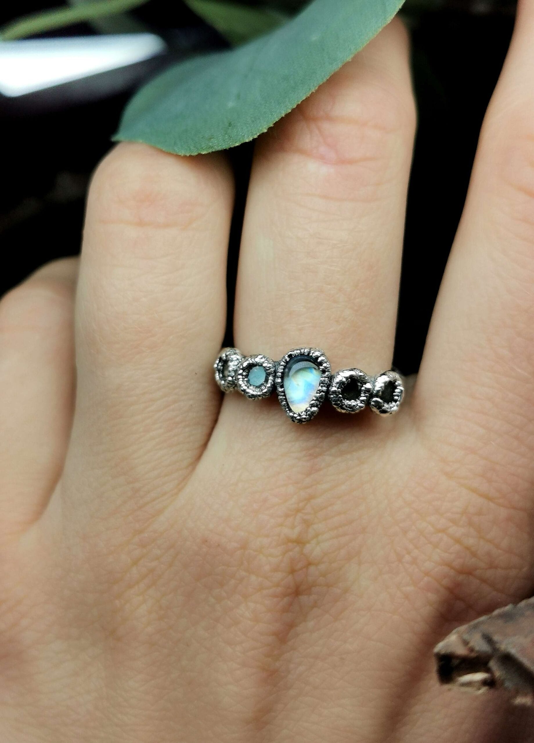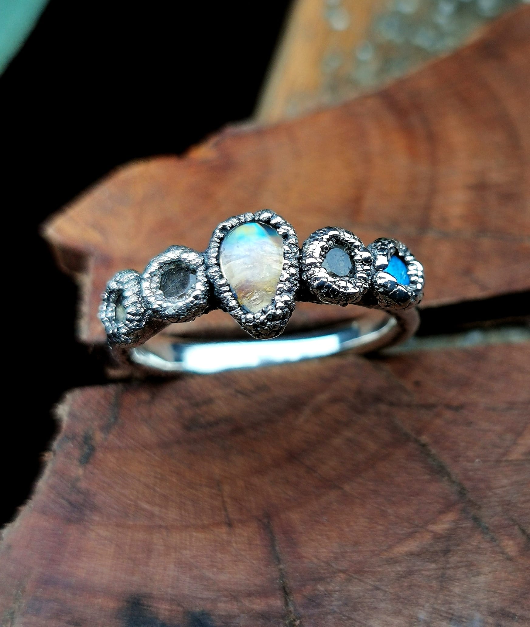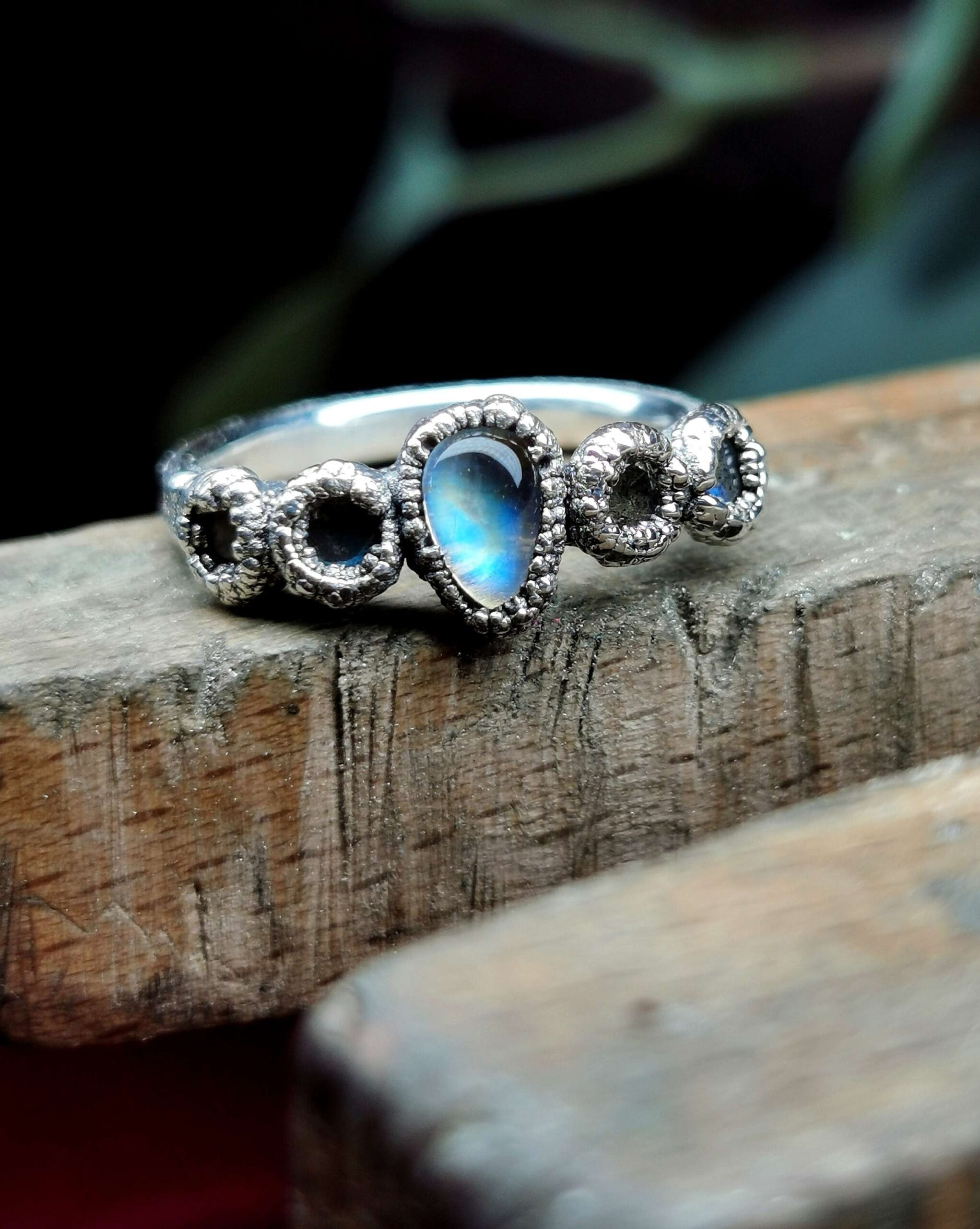⚜︎ Vienetinis sidabro žiedas su natūraliais mėnulio akmenimis.⚜︎ Sukurta iš 925 ir 999 prabos sidabro, sveria 4,01 g.⚜︎ Žiedo dydis 17,2.⚜︎ Prabuota Latvijos prabavimo rūmuose.⚜ Papuošalas parduodamas supakuotas medinėje rankų darbo dovanų dėžutėje.