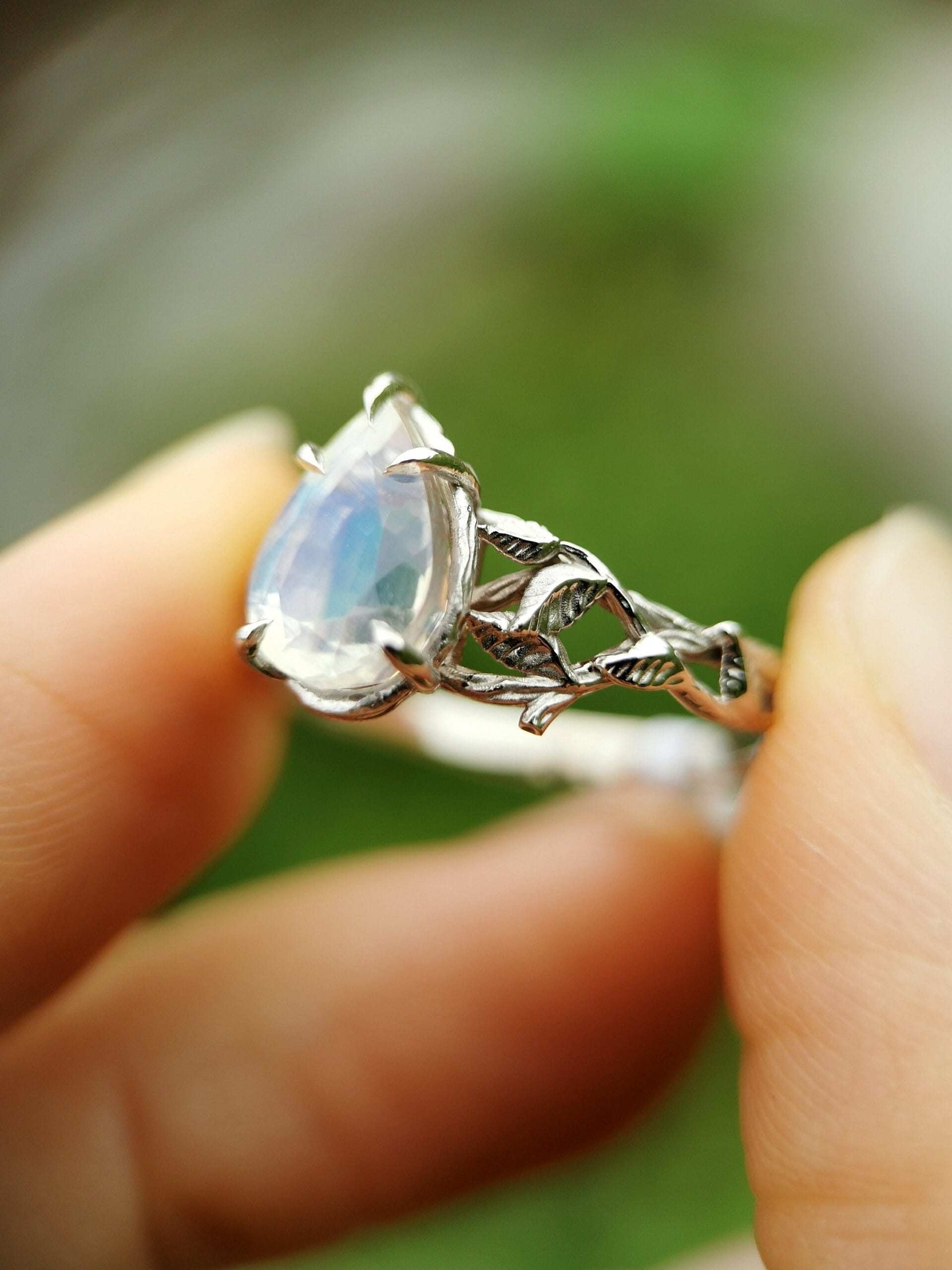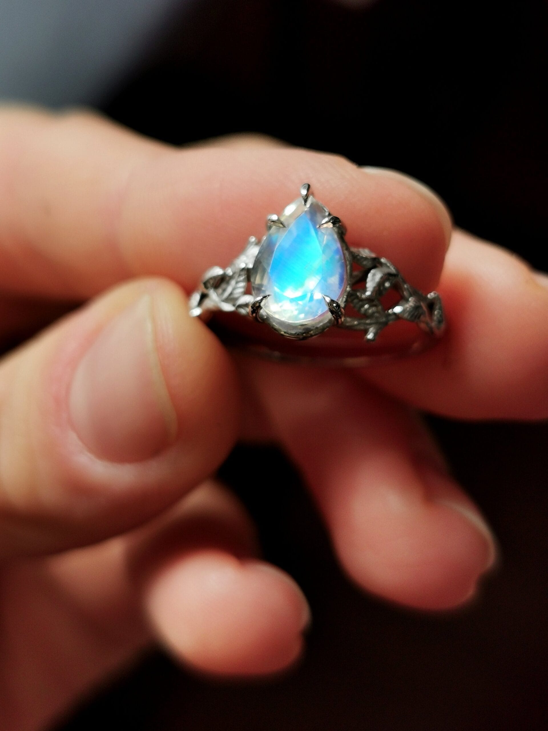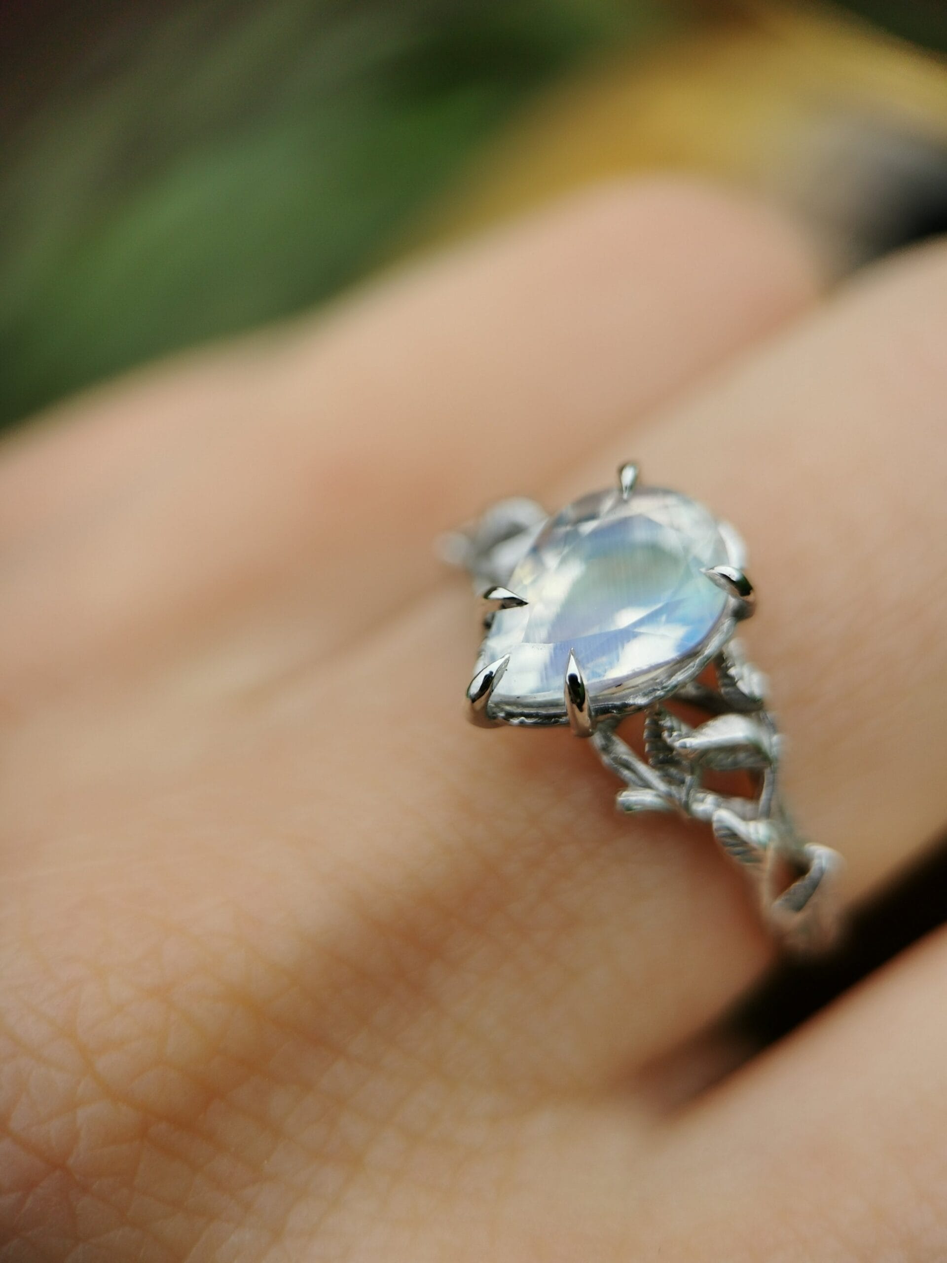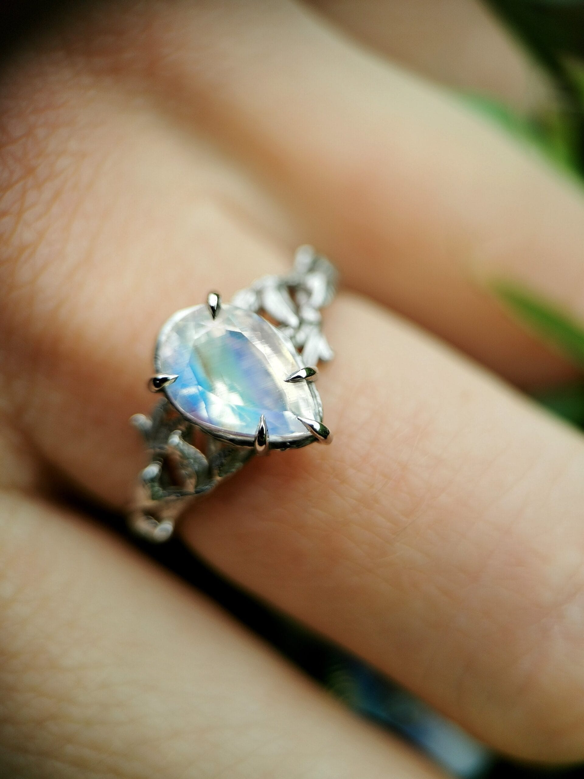 ⚜︎ Centre – aukštos kokybės skaidrus 1,4 ct vaivorykštinis mėnulio akmuo (lašo formos), pasižymintis ryškiu spalvų žaismu.