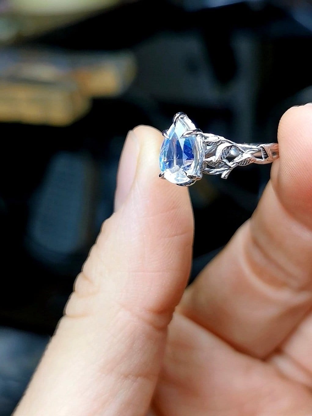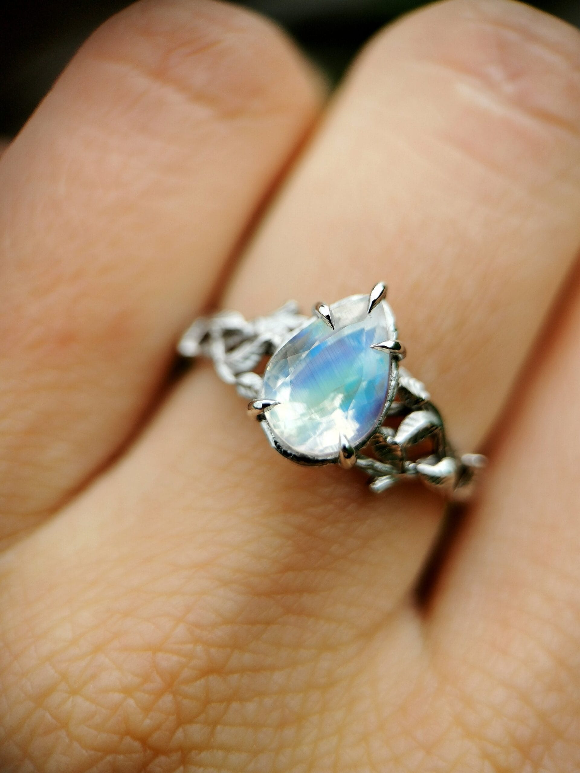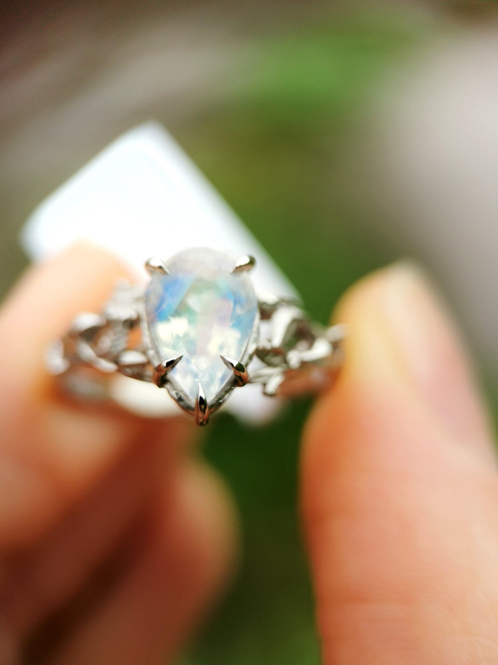 ⚜︎ Centre – aukštos kokybės skaidrus 1,4 ct vaivorykštinis mėnulio akmuo (lašo formos), pasižymintis ryškiu spalvų žaismu.