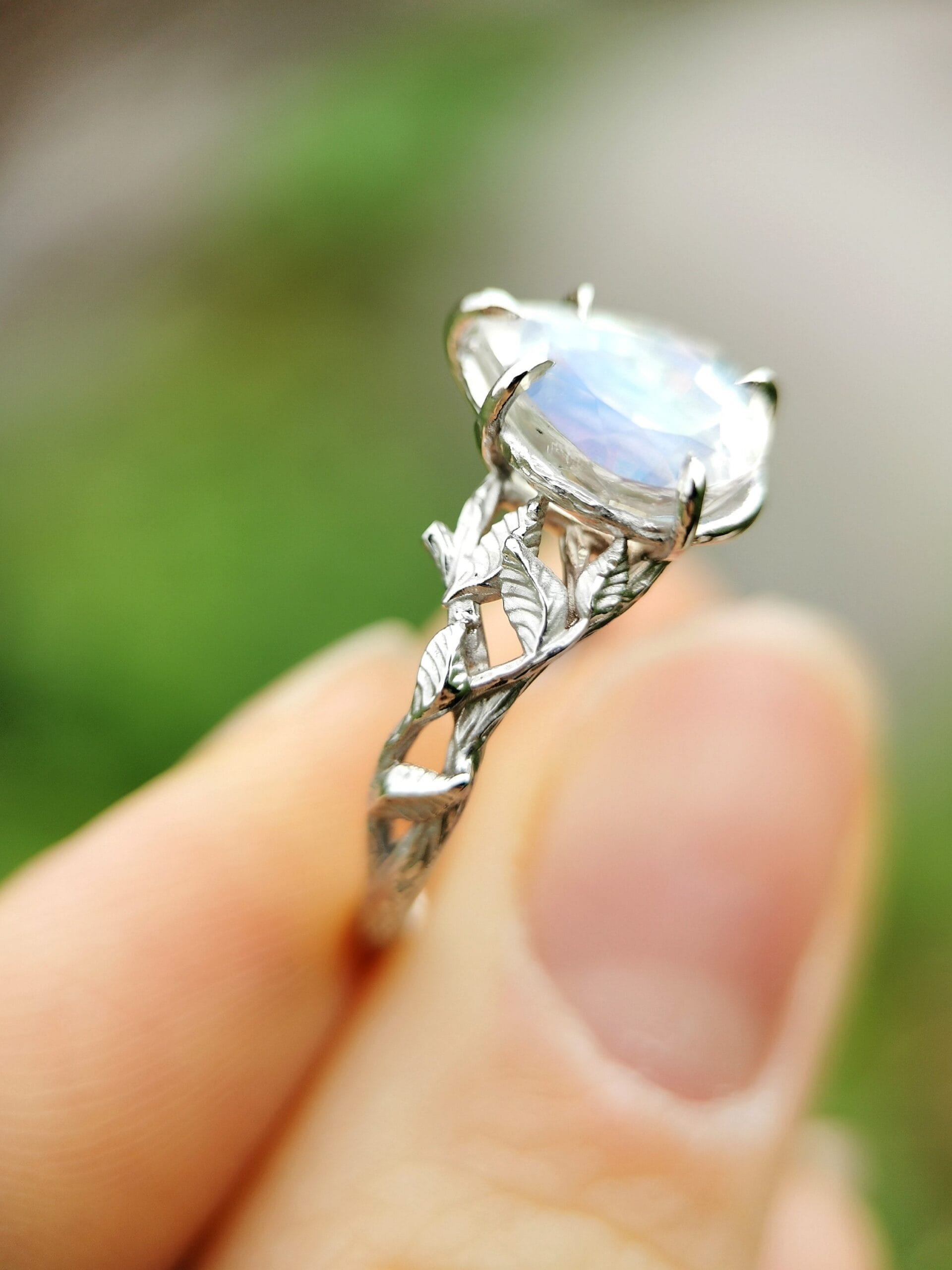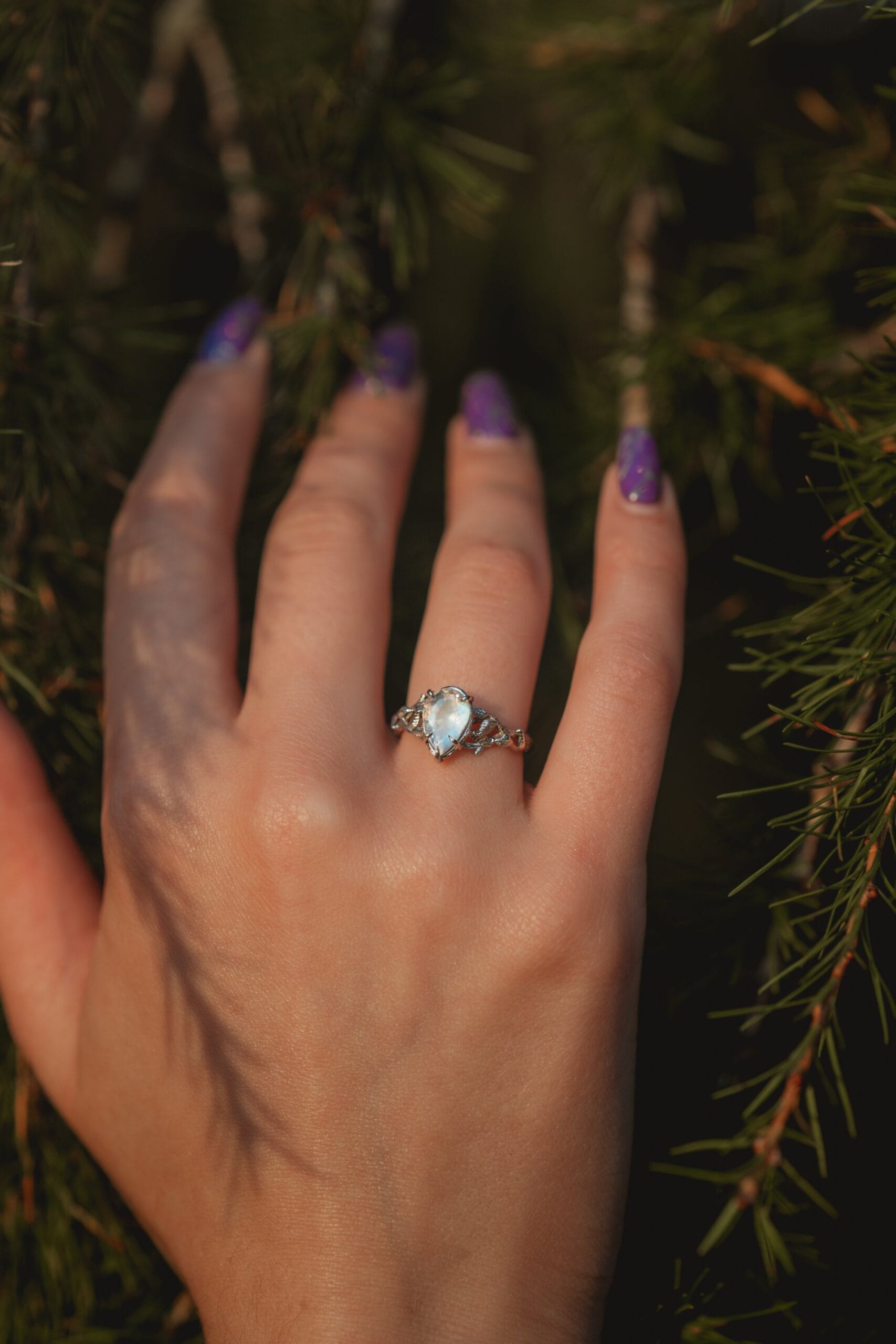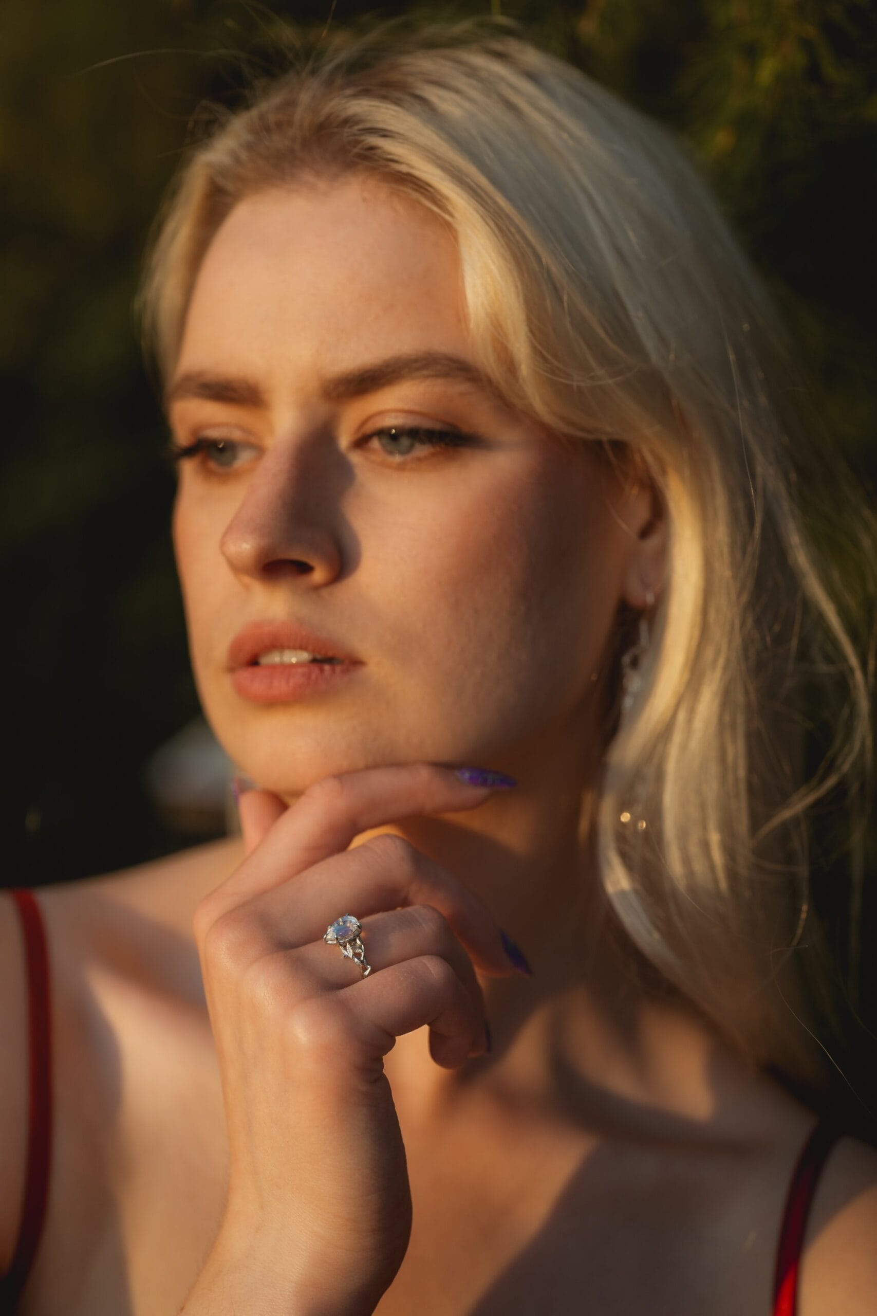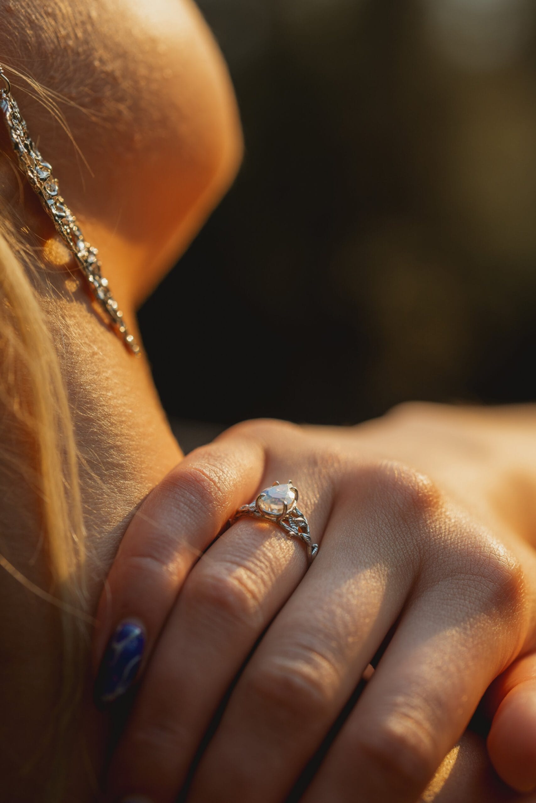 ⚜︎ Centre – aukštos kokybės skaidrus 1,4 ct vaivorykštinis mėnulio akmuo (lašo formos), pasižymintis ryškiu spalvų žaismu.