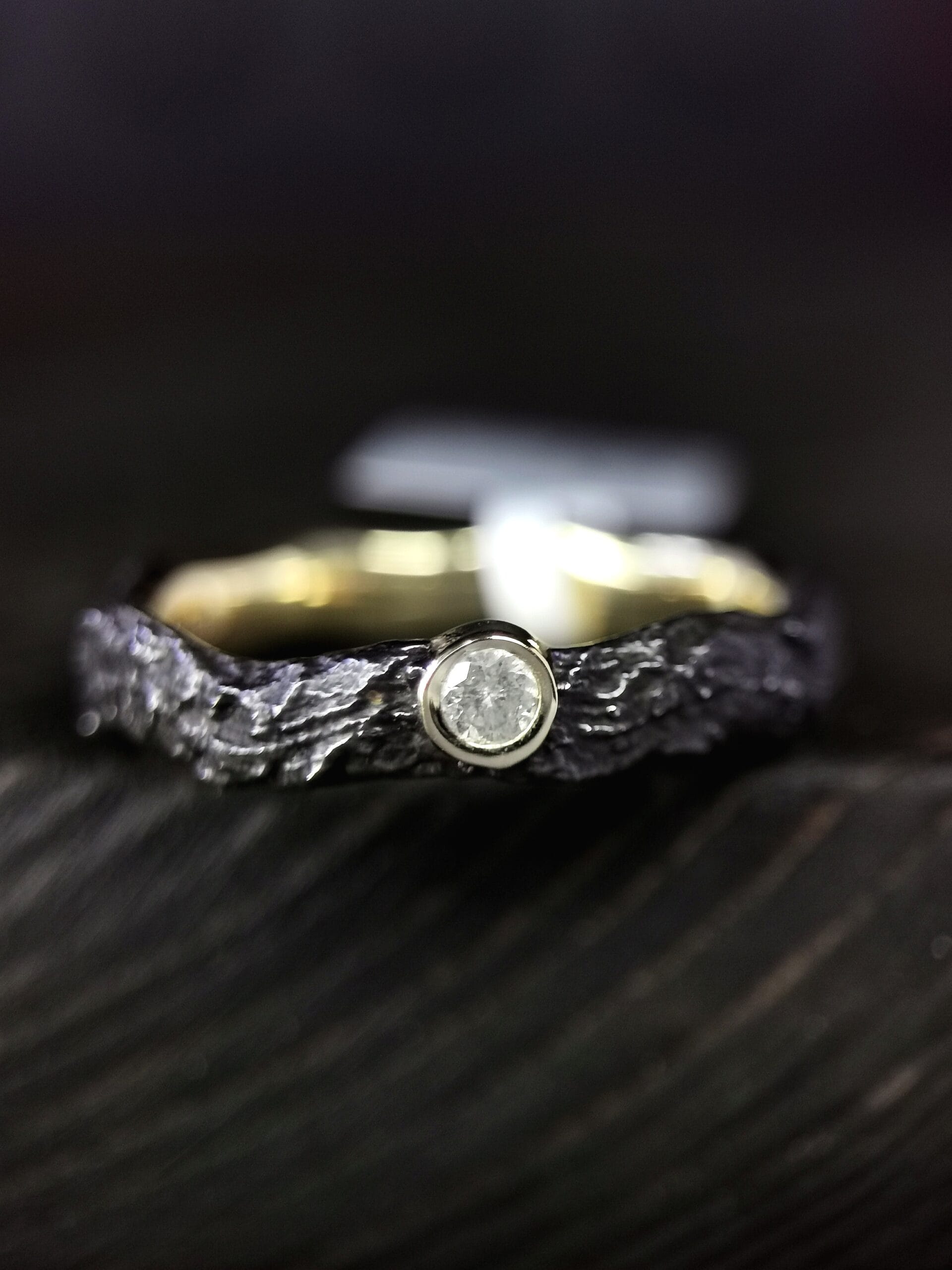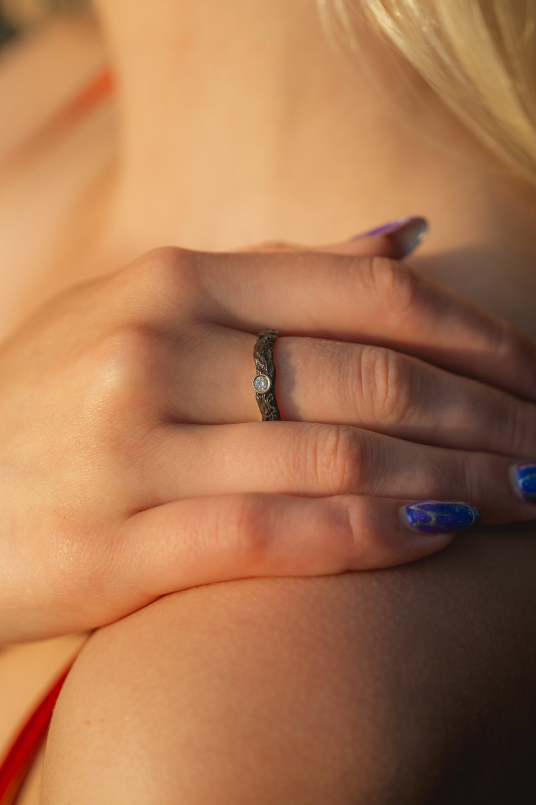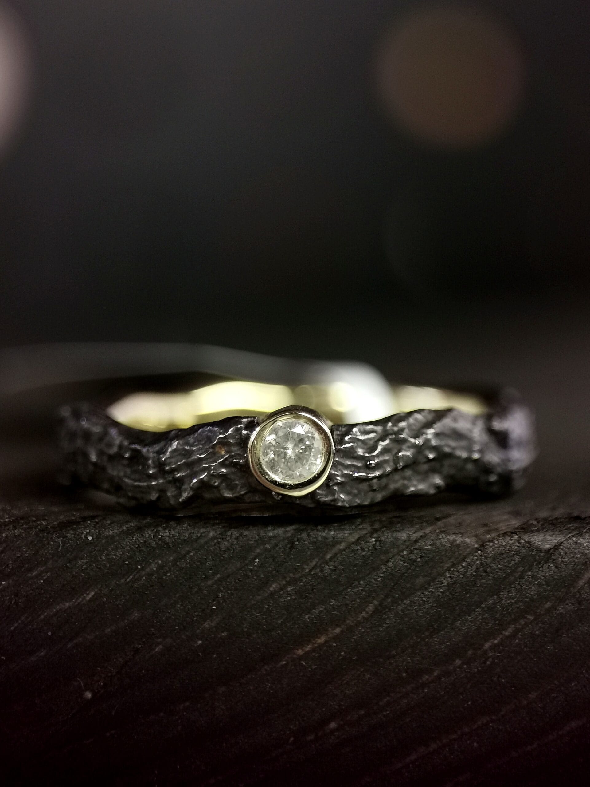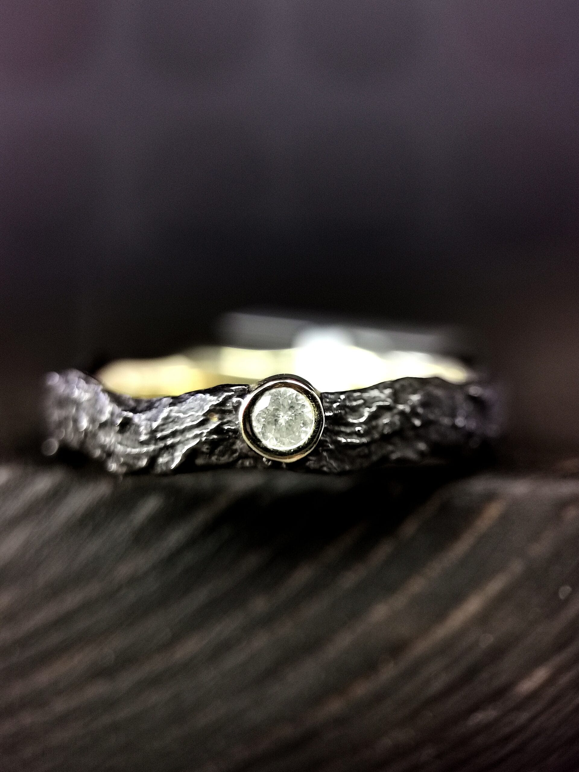 ⚜ Juodinto titano žiedas su organiškomis tekstūromis ir deimantu.⚜ Titanas itin lengvas, tvirtas, hipoalerginis metalas.⚜ Žiedo vidus iš geltono 585 prabos aukso, žiedo svoris 2,67 g, prabuota Latvijos prabavimo rūmuose. Brangakmenio charakteristikos įrašytos prabavimo rūmų sertifikato etiketėje paskutinėje nuotraukoje. ⚜ Žiedas ilgai išlaiko savo juodą spalvą, nesibraižo.⚜ Žiedo dydis 18,3. Plotis 3,5 – 4 mm.⚜ Papuošalas parduodamas supakuotas medinėje rankų darbo dovanų dėžutėje.