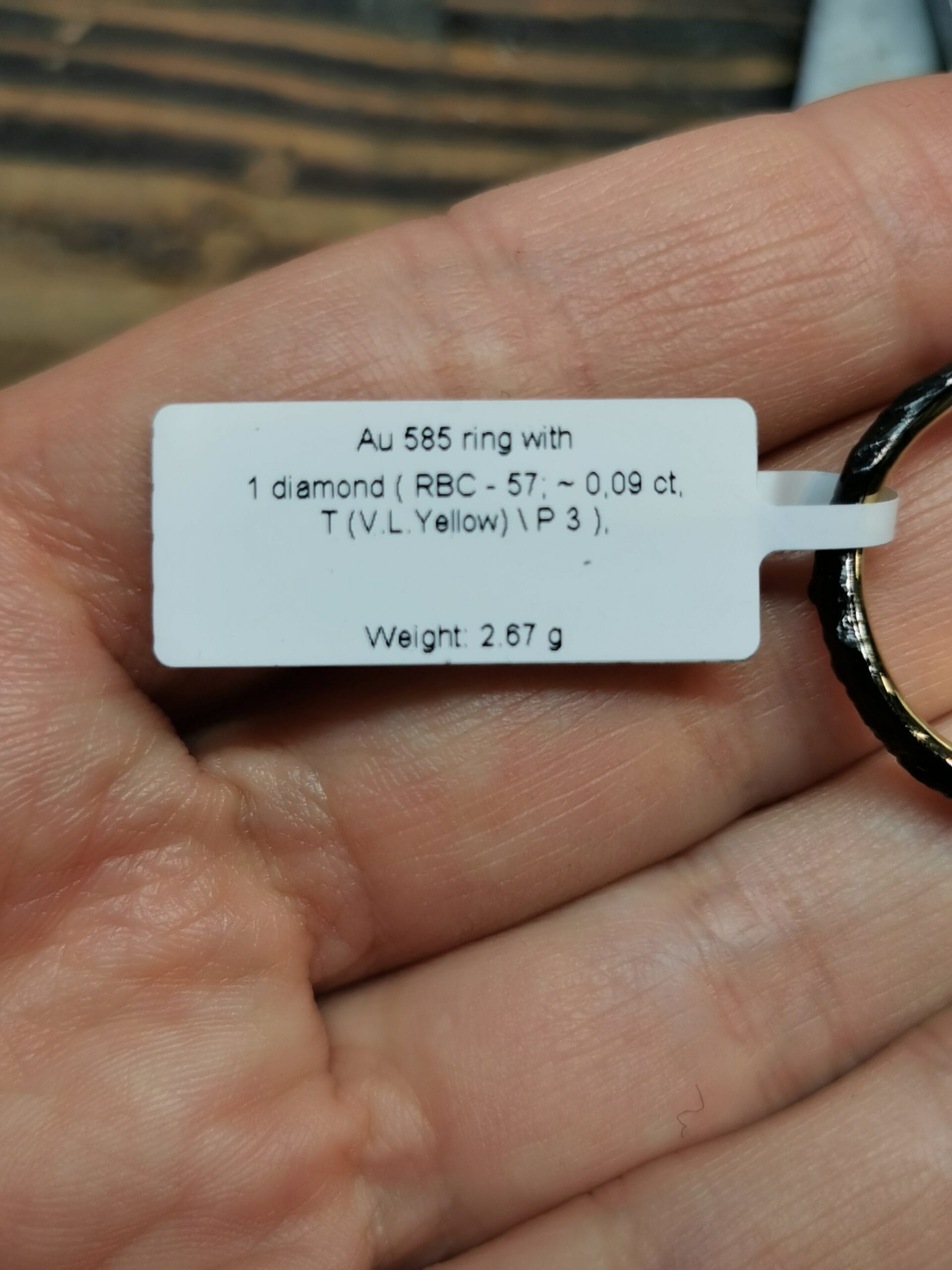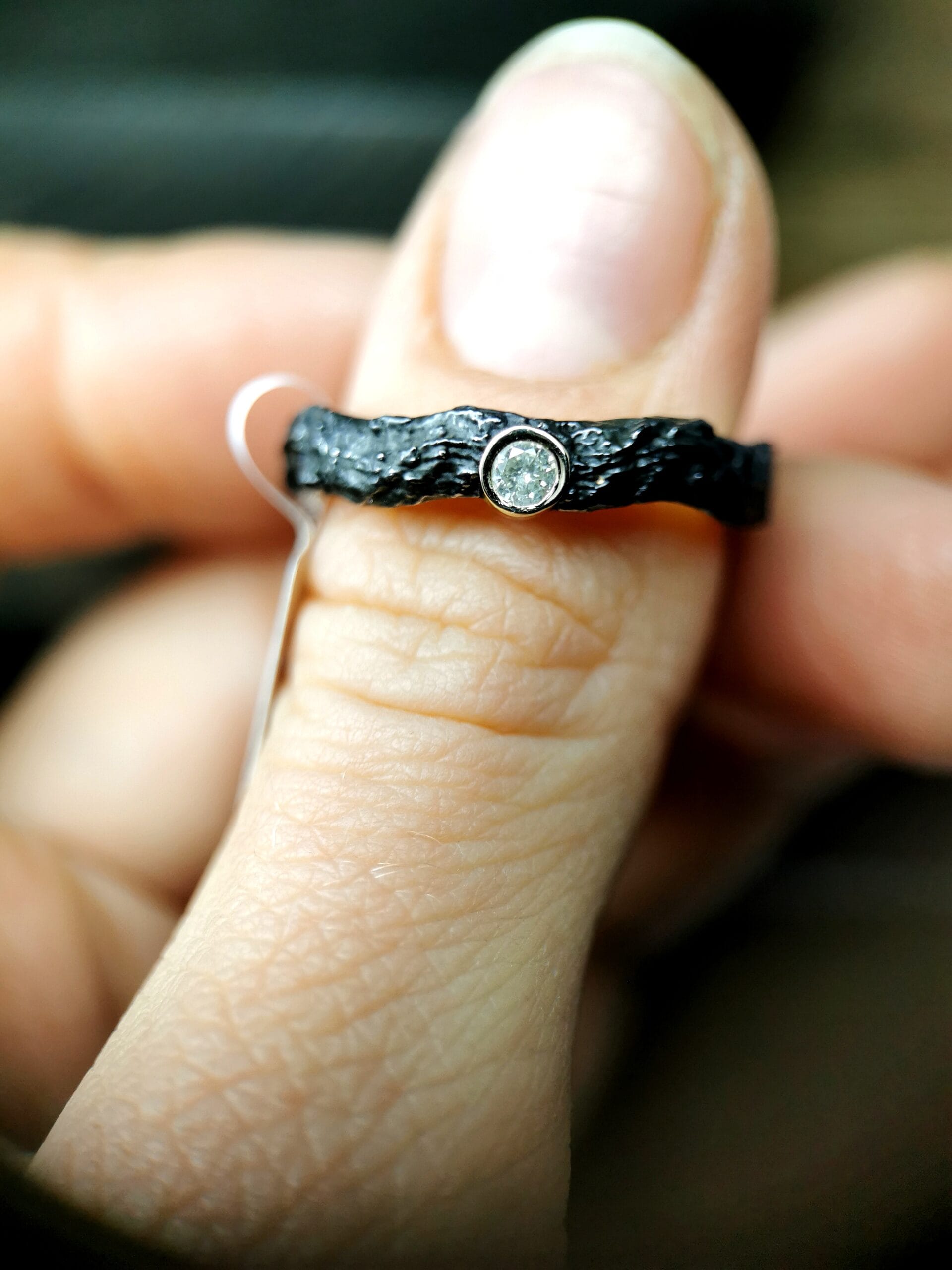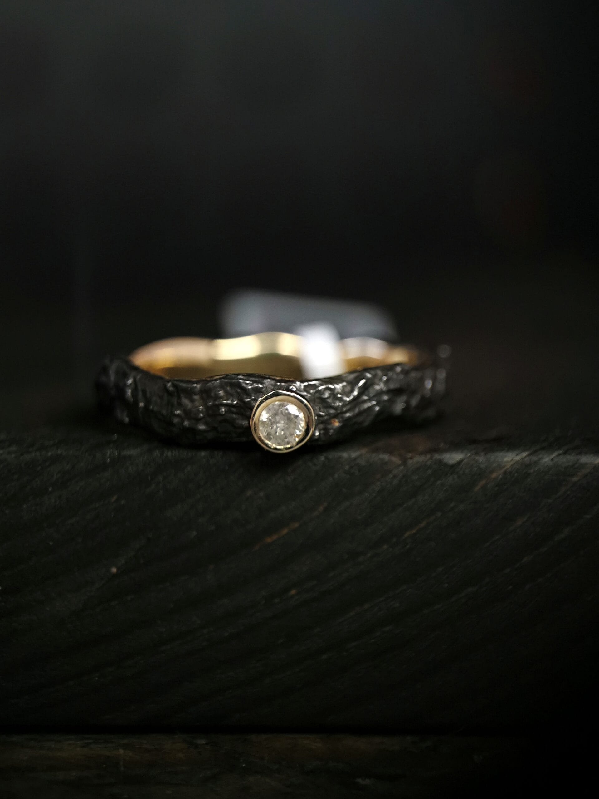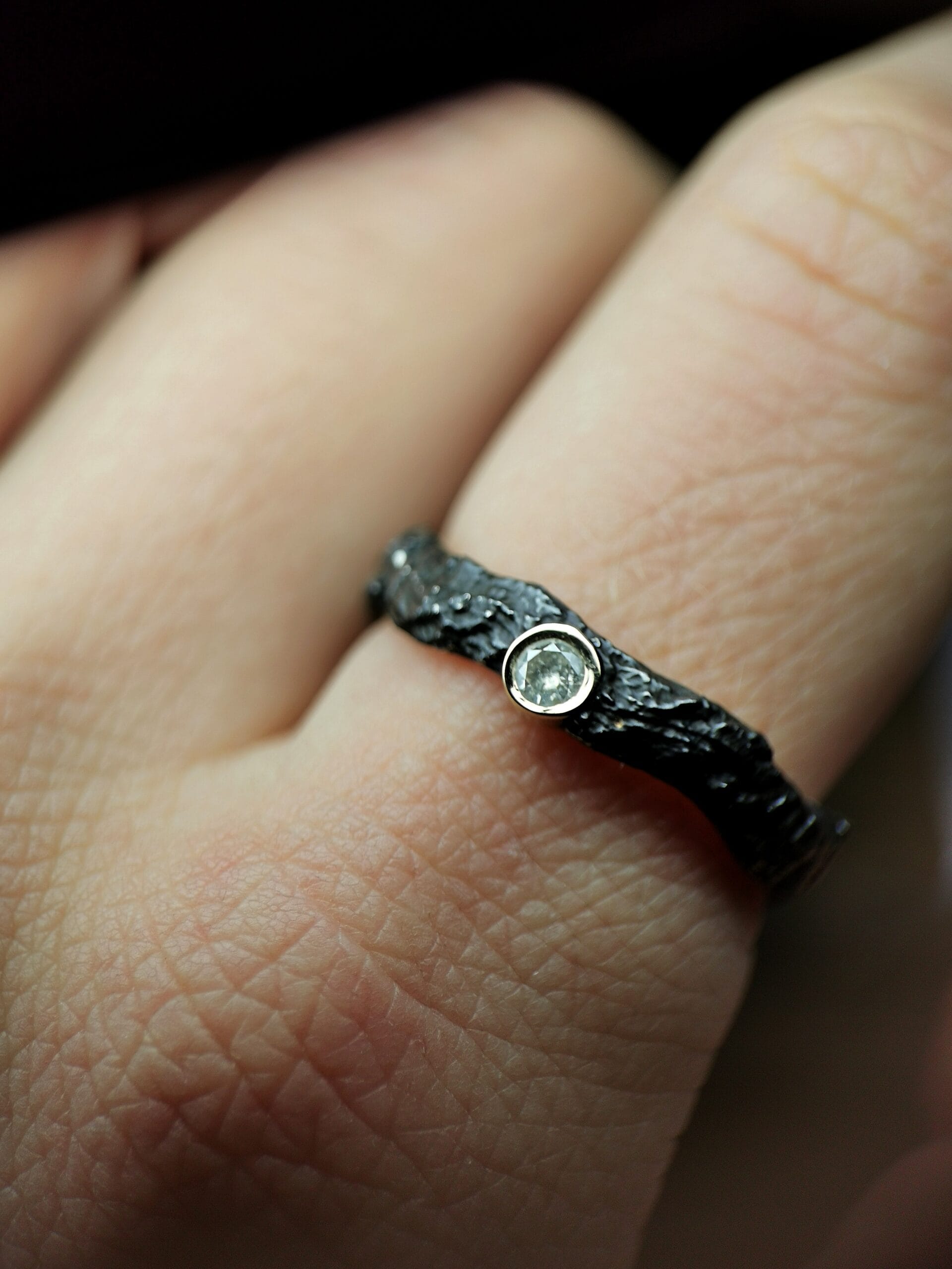 ⚜ Juodinto titano žiedas su organiškomis tekstūromis ir deimantu.⚜ Titanas itin lengvas, tvirtas, hipoalerginis metalas.⚜ Žiedo vidus iš geltono 585 prabos aukso, žiedo svoris 2,67 g, prabuota Latvijos prabavimo rūmuose. Brangakmenio charakteristikos įrašytos prabavimo rūmų sertifikato etiketėje paskutinėje nuotraukoje. ⚜ Žiedas ilgai išlaiko savo juodą spalvą, nesibraižo.⚜ Žiedo dydis 18,3. Plotis 3,5 – 4 mm.⚜ Papuošalas parduodamas supakuotas medinėje rankų darbo dovanų dėžutėje.
