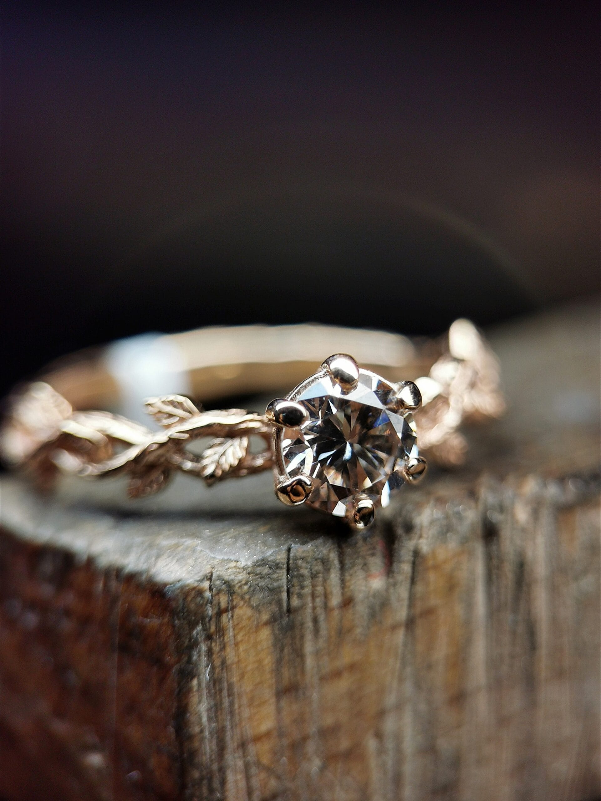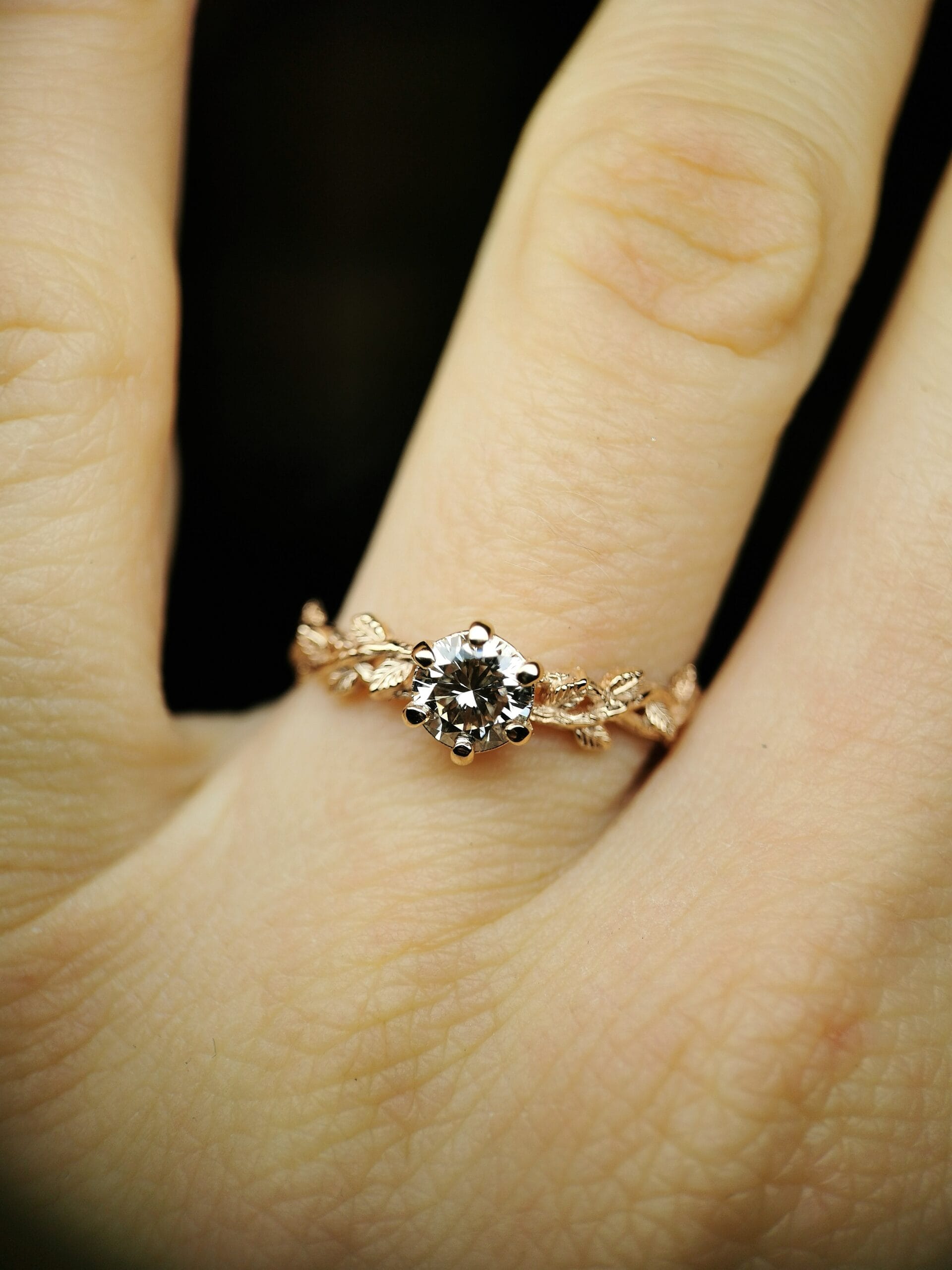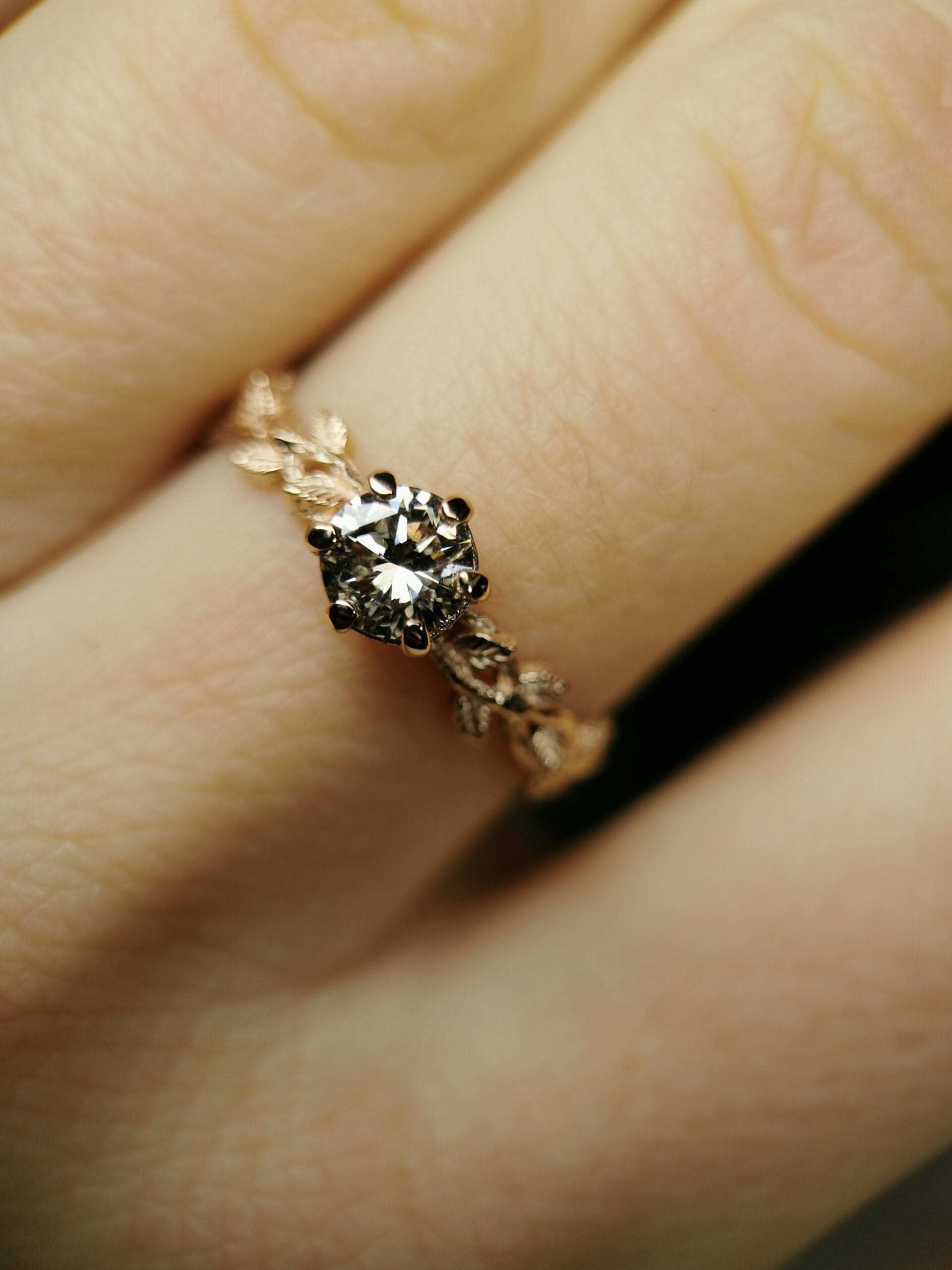 ⚜ Vienetinis gamtiško stiliaus auksinis žiedas.⚜ Žiedas su 0,5 ct dydžio natūraliu briliantu. Deimanto autentiškumas patvirtintas prabavimo rūmų etiketėje, brangakmenio specifikacijos parašytos paskutinėje nuotraukoje.⚜ Prabuota Latvijos prabavimo rūmuose, rausvas auksas, praba 585, žiedas sveria 1,74 g.⚜ Dydis 17,3 (esant poreikiui žiedas gali būti pamažintas ar padidintas).⚜ Papuošalas parduodamas supakuotas medinėje rankų darbo dėžutėje.