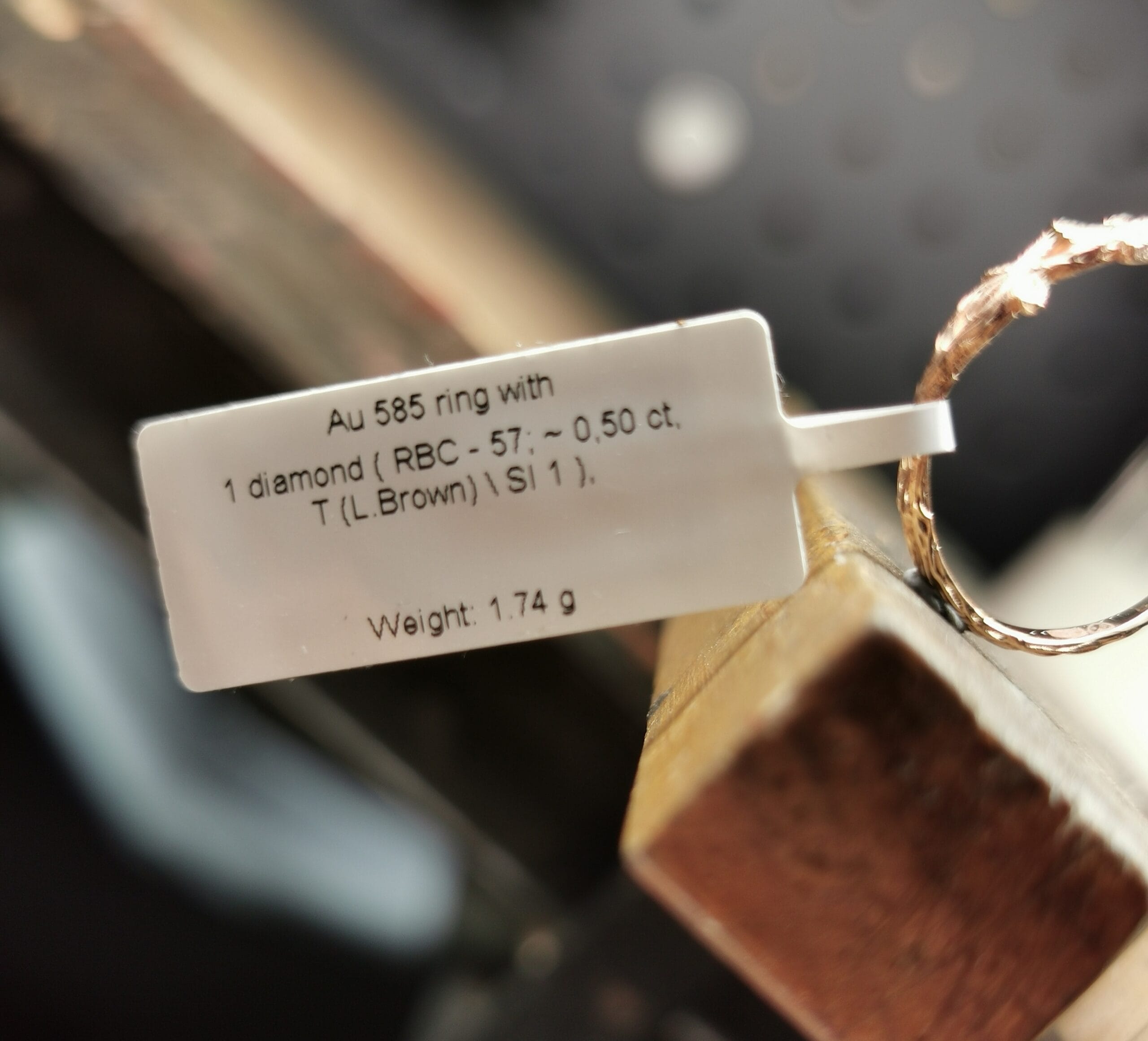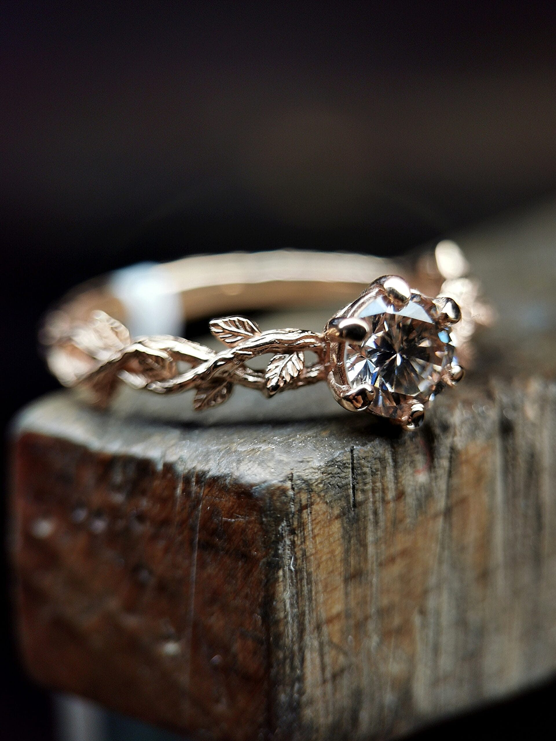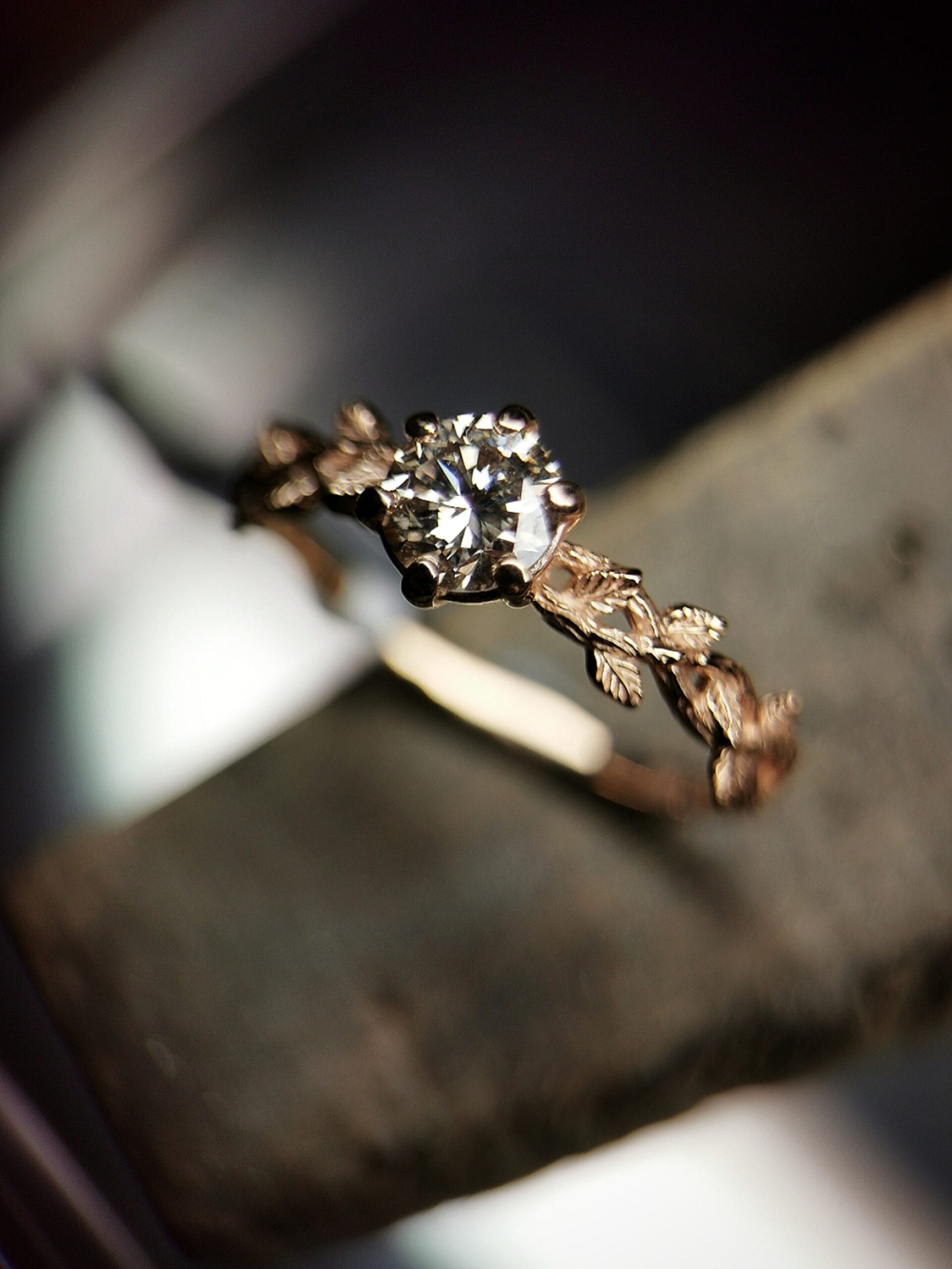 ⚜ Vienetinis gamtiško stiliaus auksinis žiedas.⚜ Žiedas su 0,5 ct dydžio natūraliu briliantu. Deimanto autentiškumas patvirtintas prabavimo rūmų etiketėje, brangakmenio specifikacijos parašytos paskutinėje nuotraukoje.⚜ Prabuota Latvijos prabavimo rūmuose, rausvas auksas, praba 585, žiedas sveria 1,74 g.⚜ Dydis 17,3 (esant poreikiui žiedas gali būti pamažintas ar padidintas).⚜ Papuošalas parduodamas supakuotas medinėje rankų darbo dėžutėje.