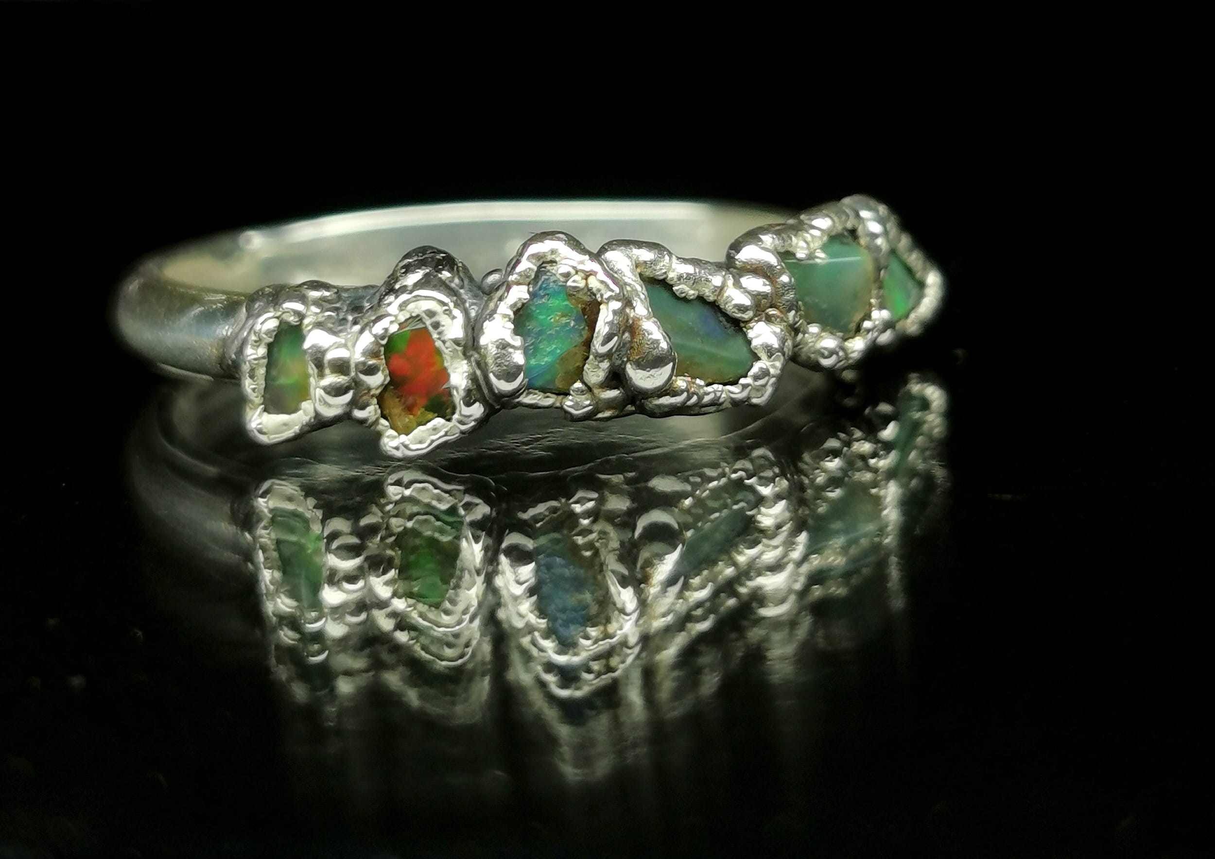 ⚜︎ Vienetinis sidabro žiedas su natūraliais 6 Etiopijos opalų akmenimis.⚜︎ Sukurta iš 925 ir 999 prabos sidabro, papuošalo svoris 2,25 g.⚜︎ Žiedo dydis 17,2.⚜︎ Prabuota Latvijos prabavimo rūmuose.⚜ Papuošalas parduodamas supakuotas medinėje rankų darbo dovanų dėžutėje.
