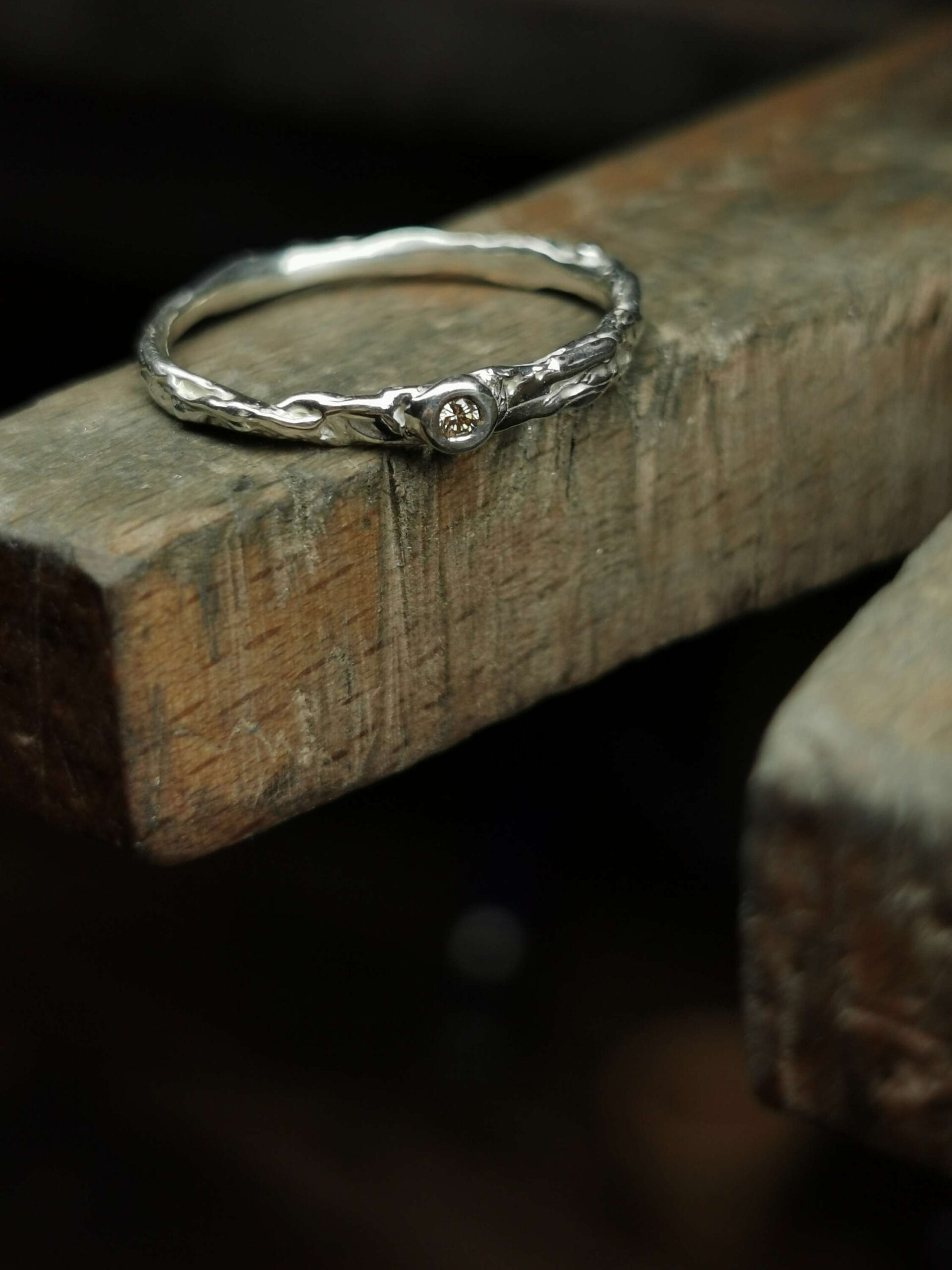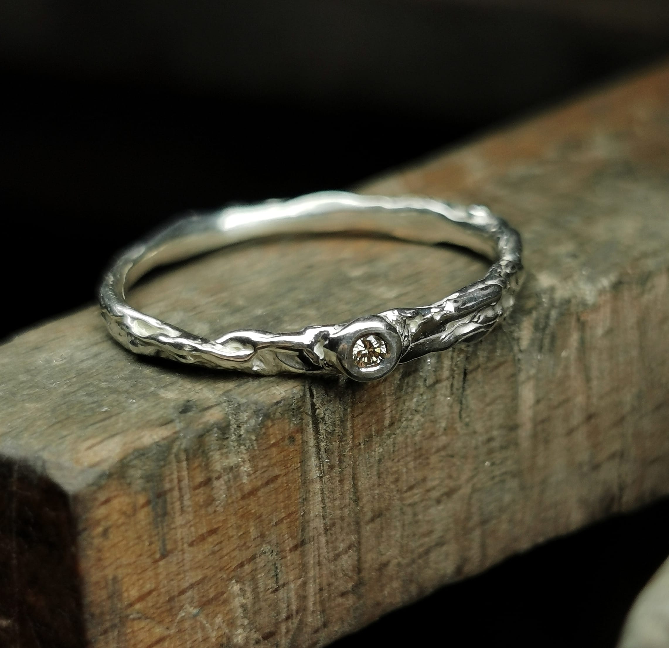 ⚜ Autorinis rankų darbo žiedas.⚜ Žiedas inkrustuotas mažu šampaniniu deimantu. Deimanto autentiškumas patvirtintas prabavimo rūmų etiketėje, specifikacijos parašytos paskutinėje nuotraukoje.⚜ Prabuota Latvijos prabavimo rūmuose, sidabro praba 925, sveria 1,36 g.⚜ Galima rinktis iš kelių skirtingų dydžių.⚜ Papuošalas parduodamas supakuotas medinėje rankų darbo dėžutėje.