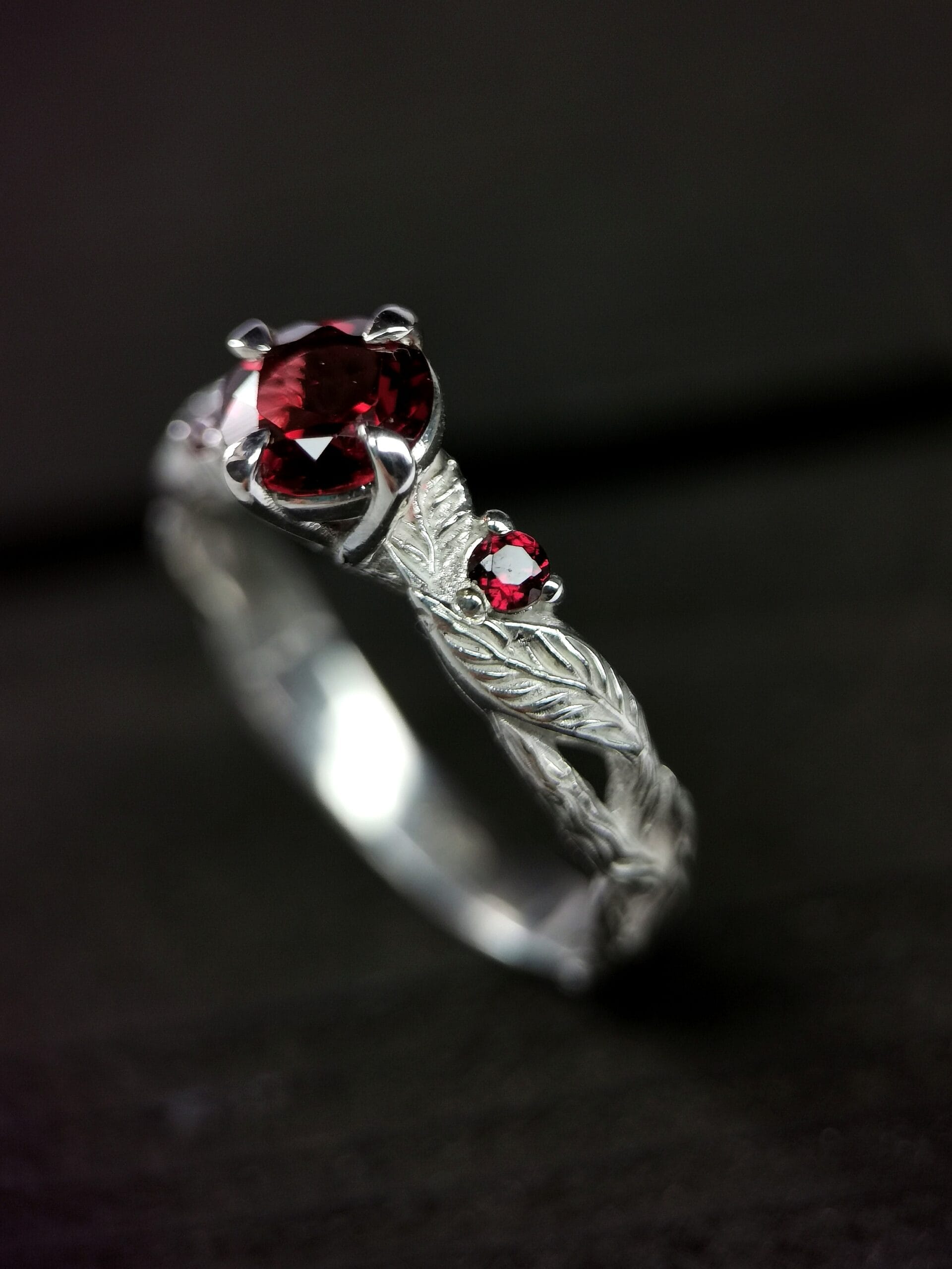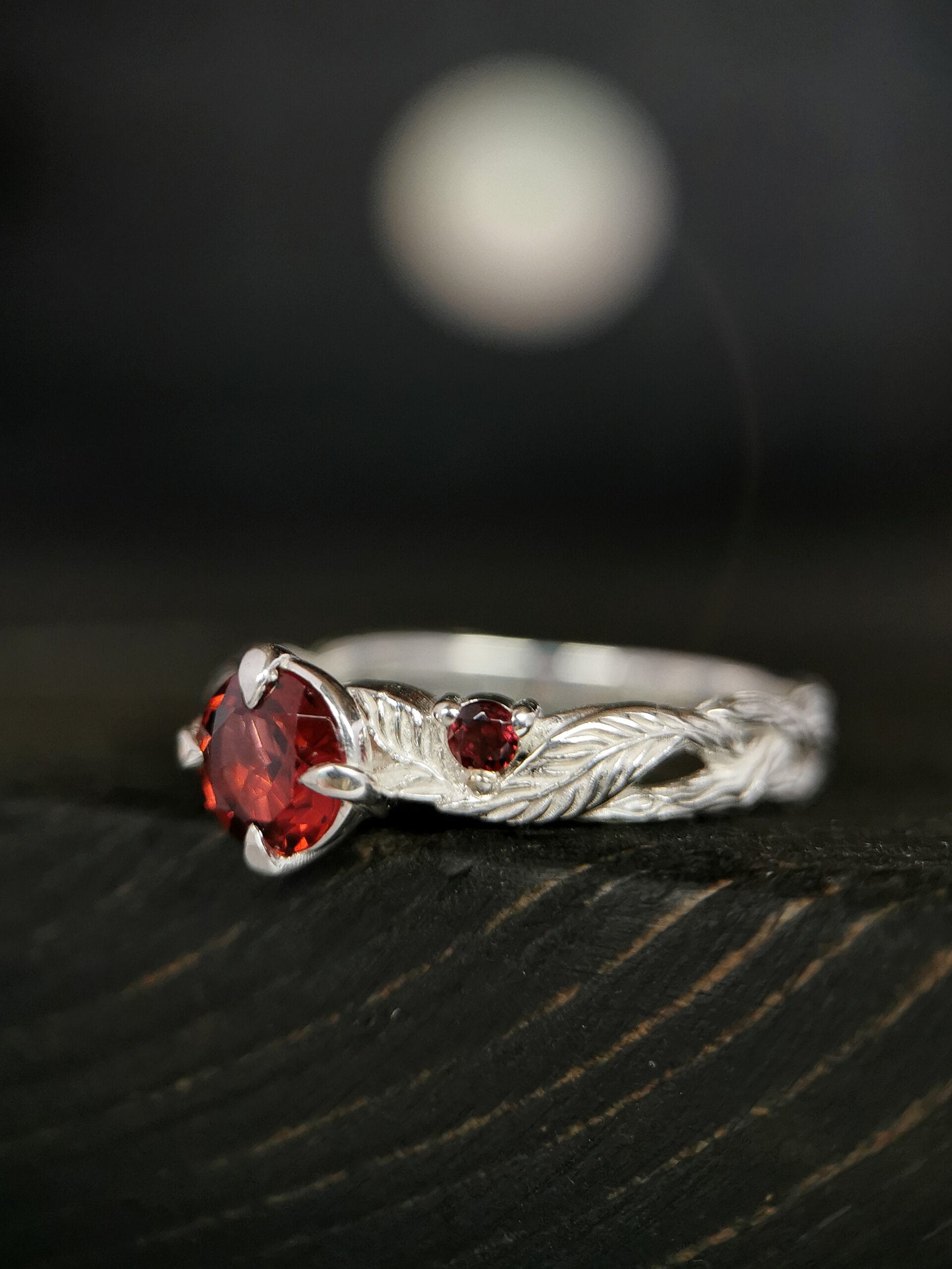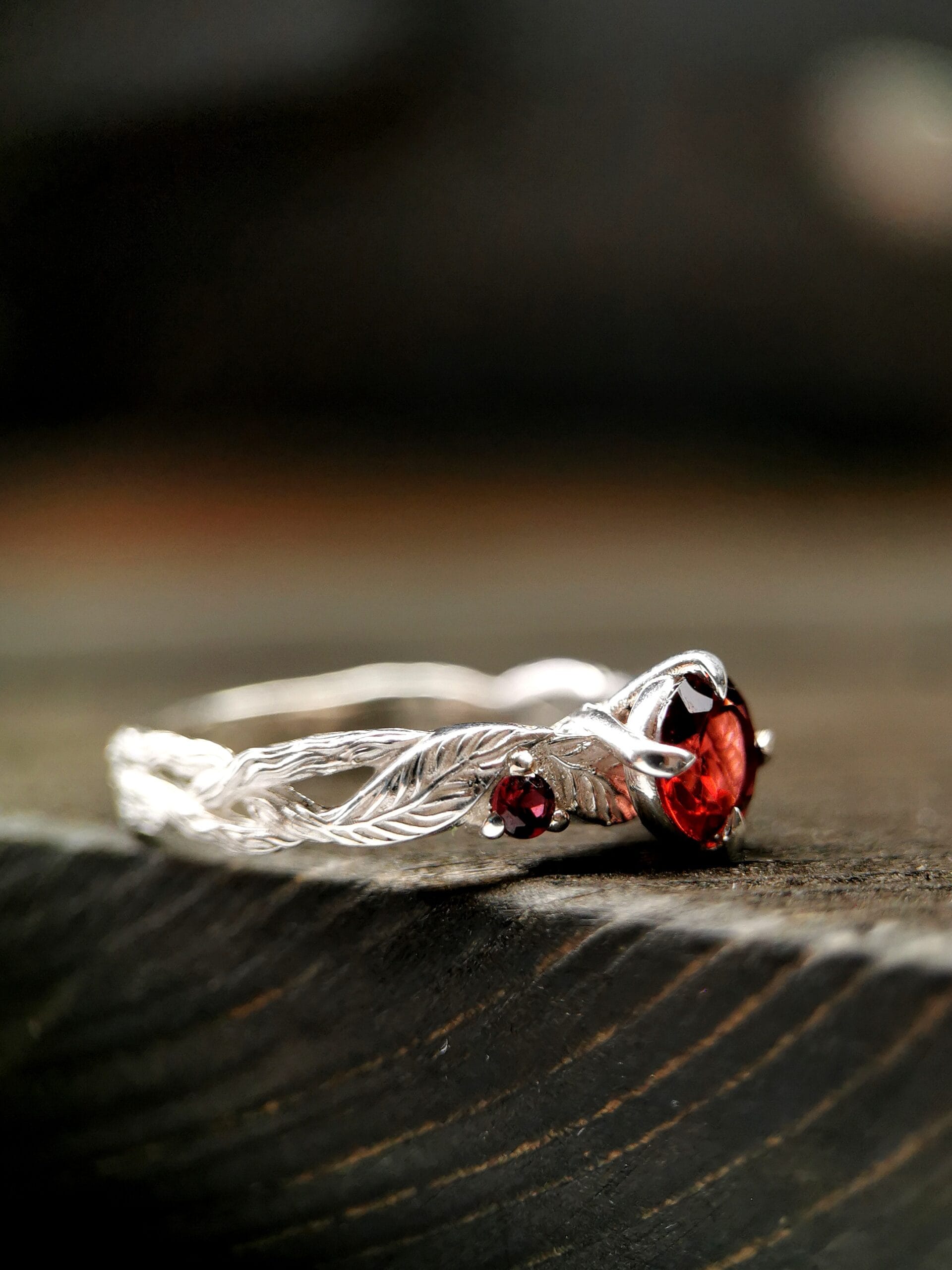 ⚜ Gamtiško stiliaus sidabro žiedas.⚜ Žiedas su 6 mm dydžio raudonos spalvos granatu. Šonuose įdėti 2 granatai, kurių dydis 2,2 mm.⚜ Prabuota Latvijos prabavimo rūmuose, sidabro praba 925, žiedas sveria 2,71 g.⚜ Dydis 18.⚜ Papuošalas parduodamas supakuotas medinėje rankų darbo dėžutėje.