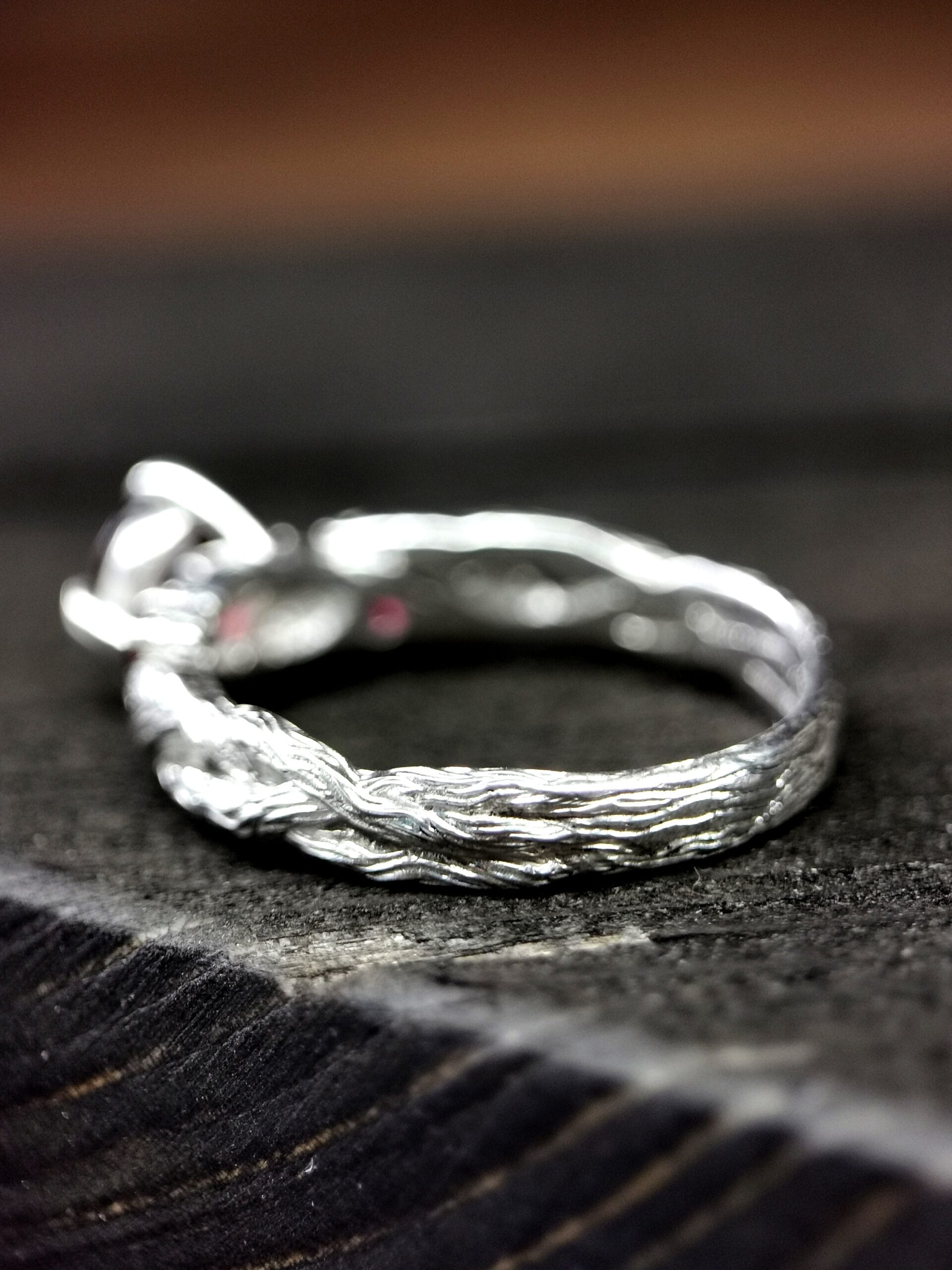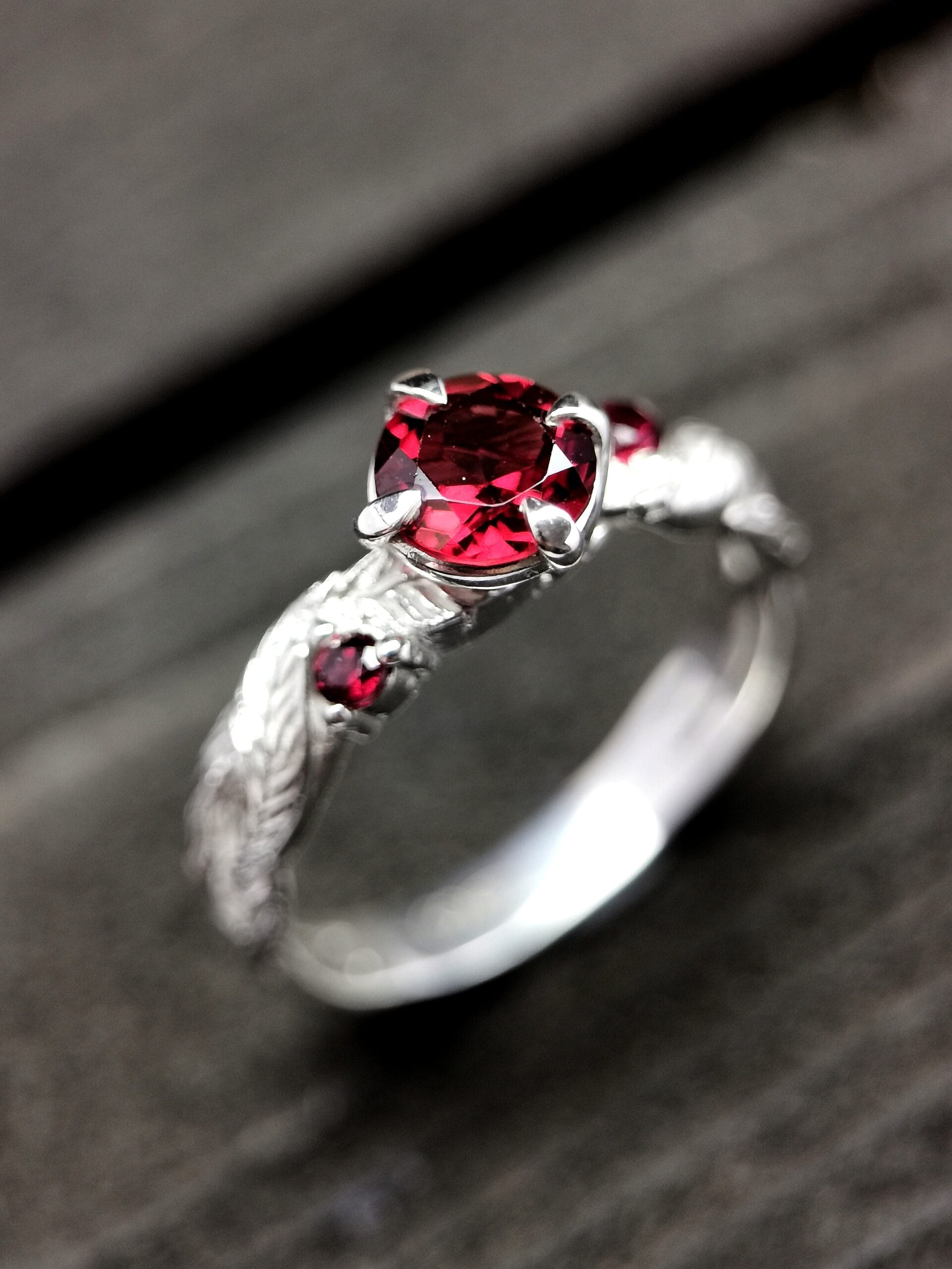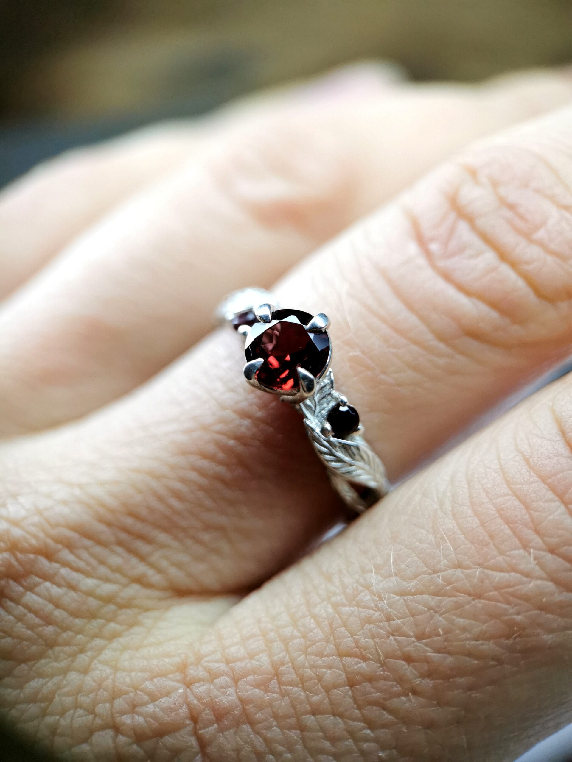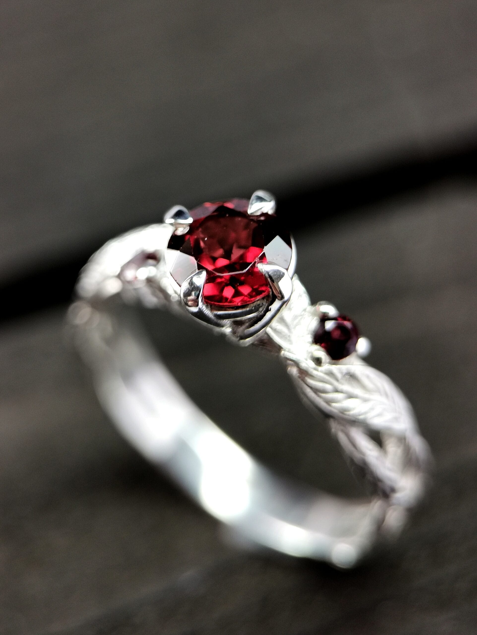 ⚜ Gamtiško stiliaus sidabro žiedas.⚜ Žiedas su 6 mm dydžio raudonos spalvos granatu. Šonuose įdėti 2 granatai, kurių dydis 2,2 mm.⚜ Prabuota Latvijos prabavimo rūmuose, sidabro praba 925, žiedas sveria 2,71 g.⚜ Dydis 18.⚜ Papuošalas parduodamas supakuotas medinėje rankų darbo dėžutėje.