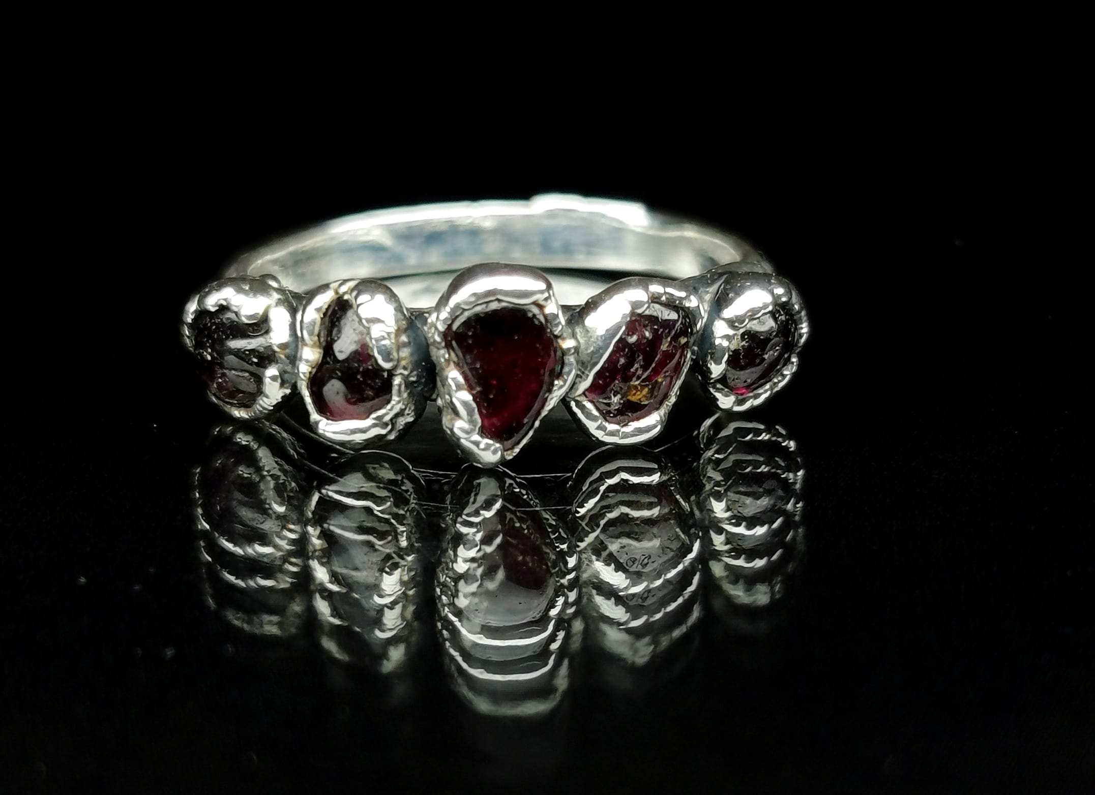 ⚜︎ Vienetinis sidabro žiedas su 5 natūraliais tamsiai raudonais granato akmenimis.⚜︎ Sukurta iš 925 ir 999 prabos sidabro, sveria 2,72 g.⚜︎ Žiedo dydis 16,2.⚜︎ Prabuota Latvijos prabavimo rūmuose.⚜ Papuošalas parduodamas supakuotas medinėje rankų darbo dovanų dėžutėje.