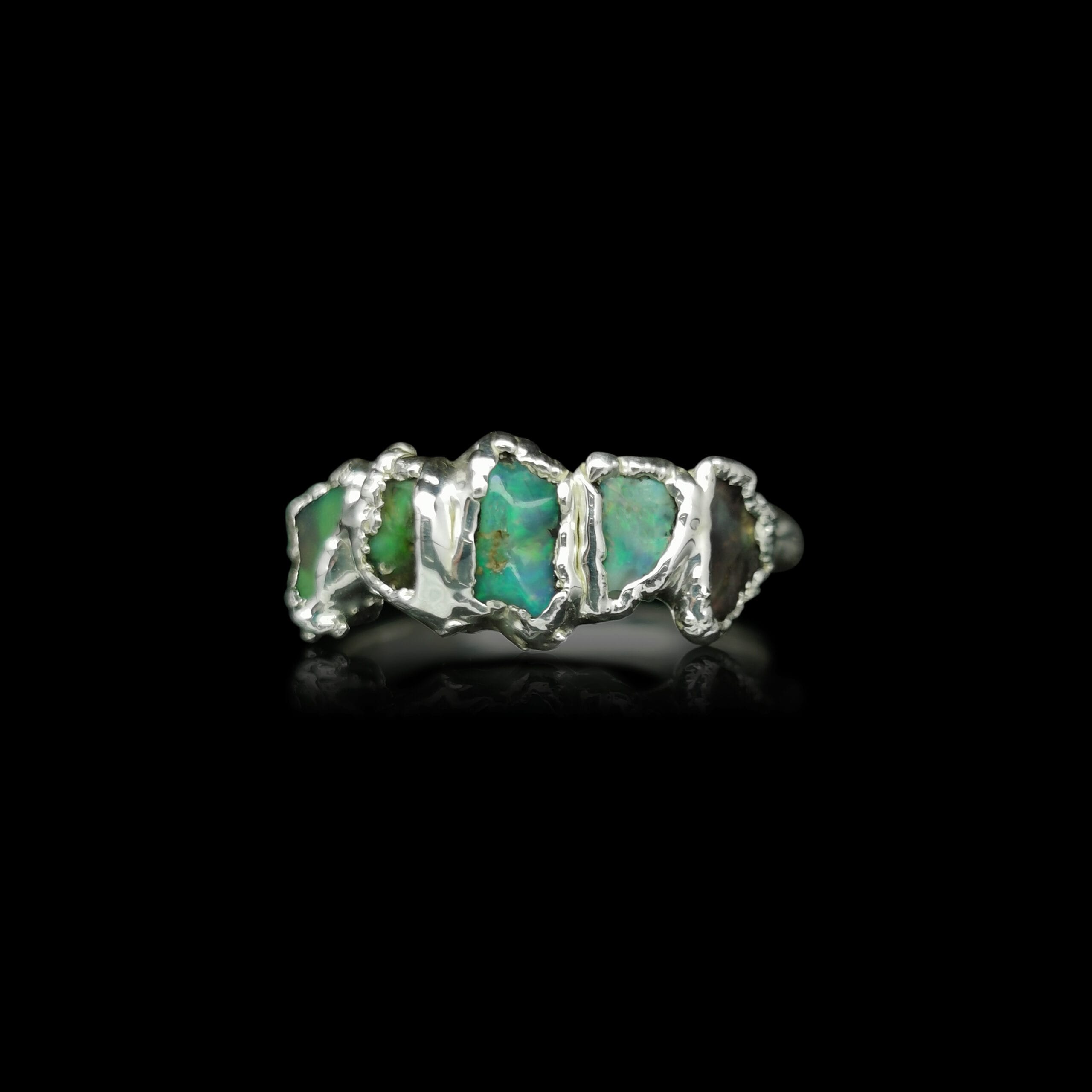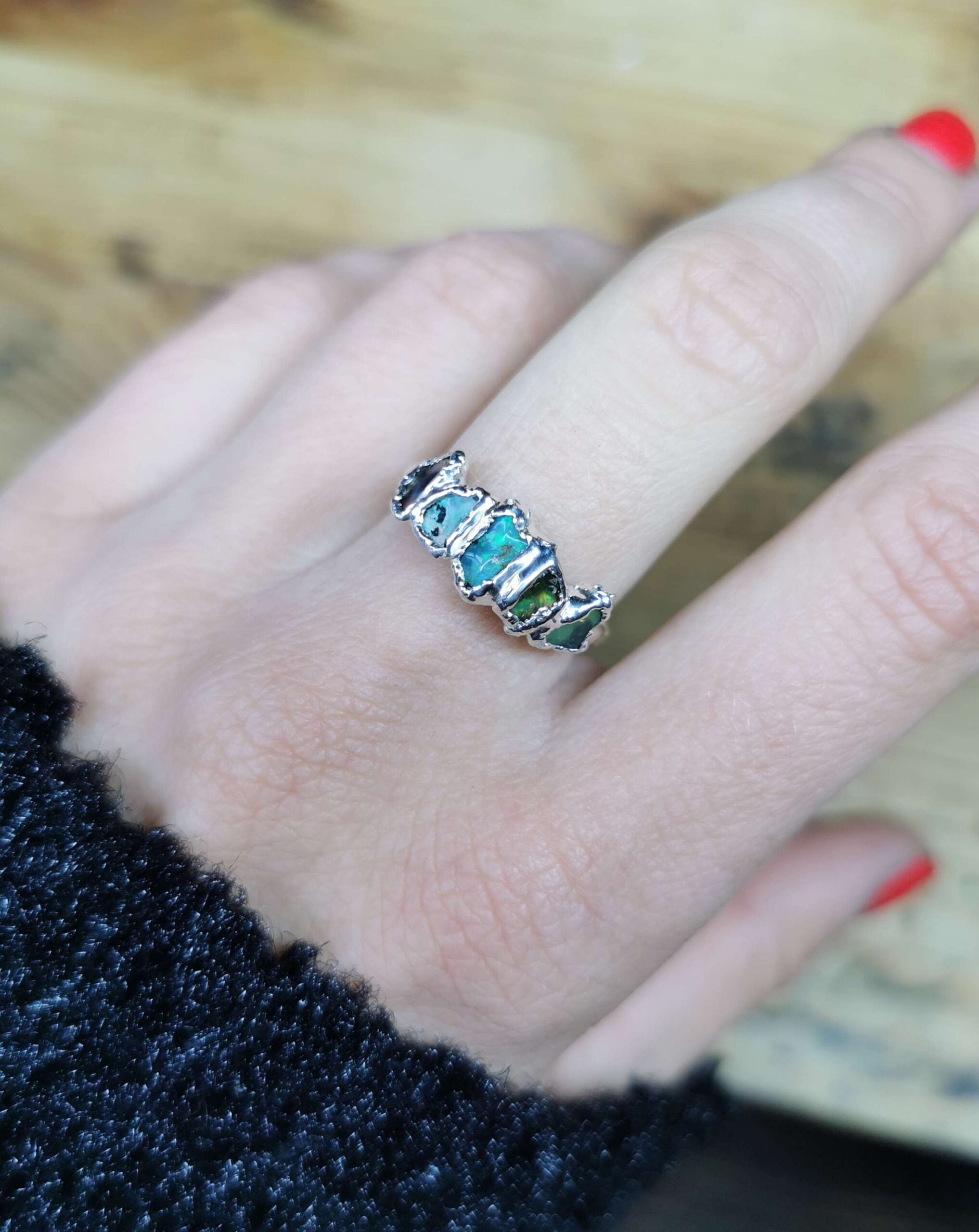 ⚜︎ Vienetinis sidabro žiedas su natūraliais 5 Etiopijos opalų akmenimis.⚜︎ Sukurta iš 925 ir 999 prabos sidabro, sveria 3,05 g. ⚜︎ Žiedo dydis 17.⚜︎ Prabuota Latvijos prabavimo rūmuose.⚜ Papuošalas parduodamas supakuotas medinėje rankų darbo dovanų dėžutėje.